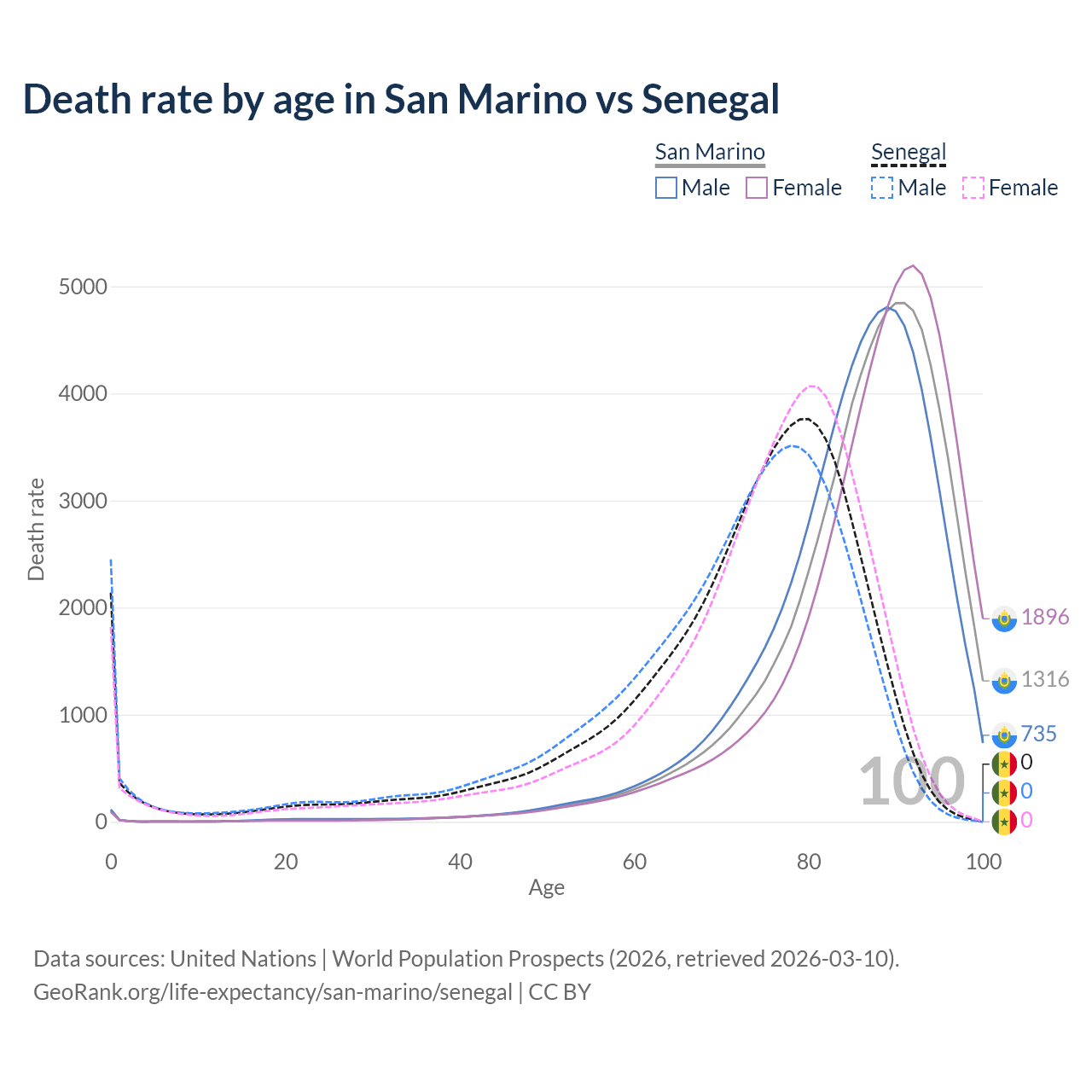 In San Marino, the most common age of death is 91, compared to 80 in Senegal. The median age of death is 88.3 in San Marino and 75 in Senegal, meaning only half of each cohort is expected to live past that age.
