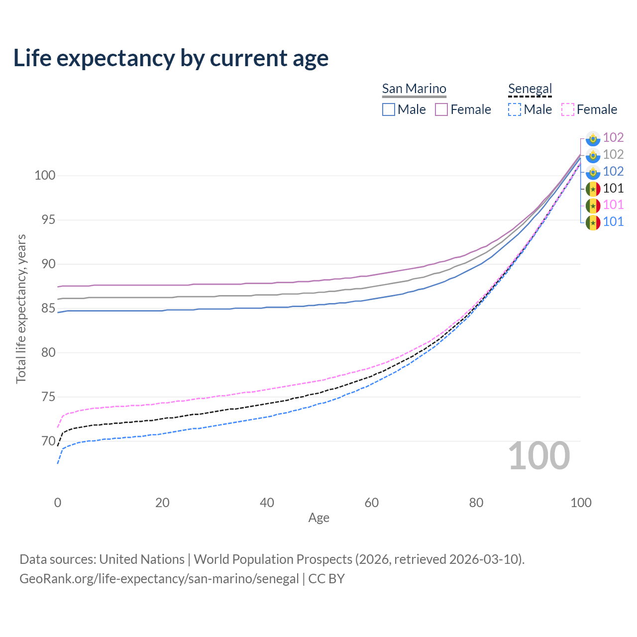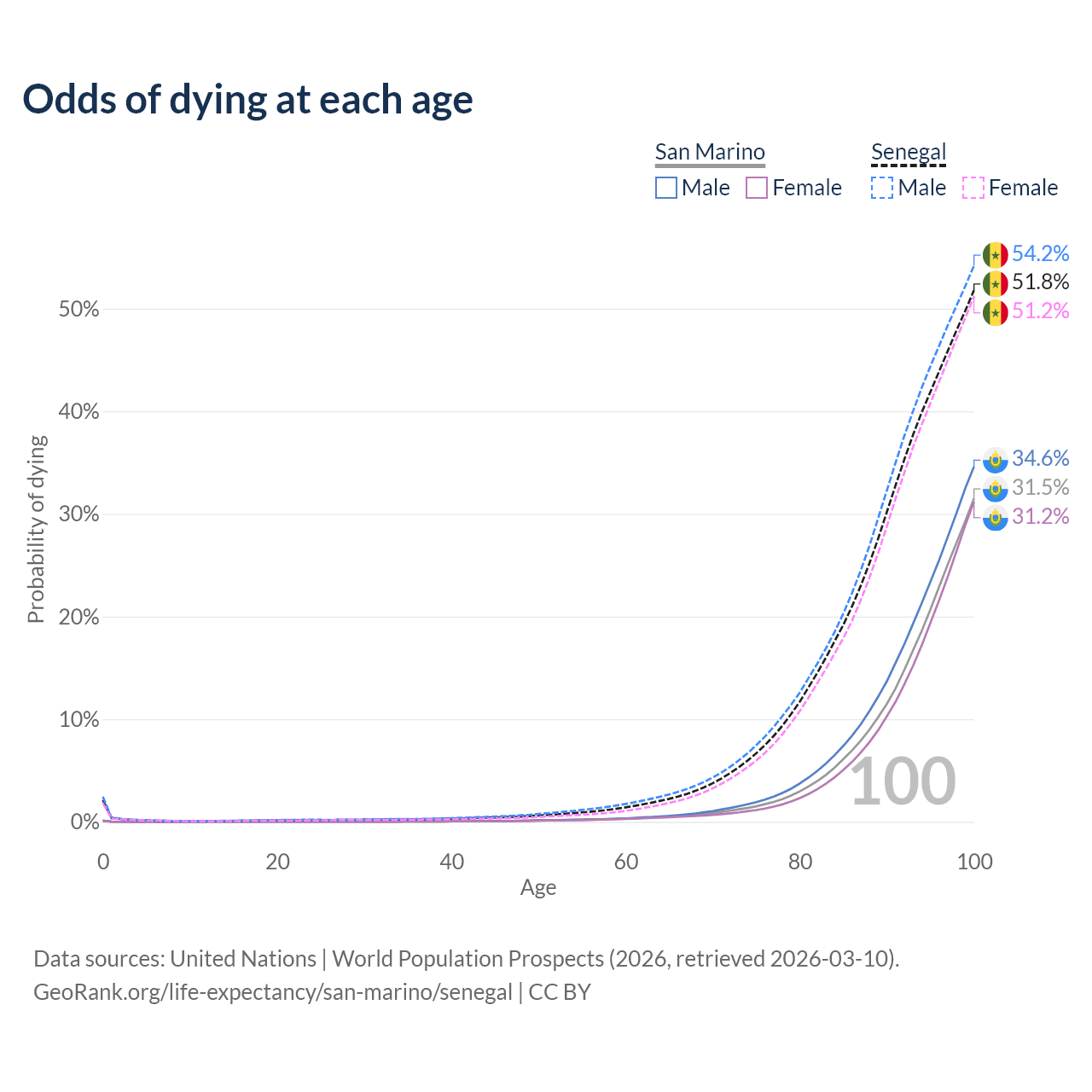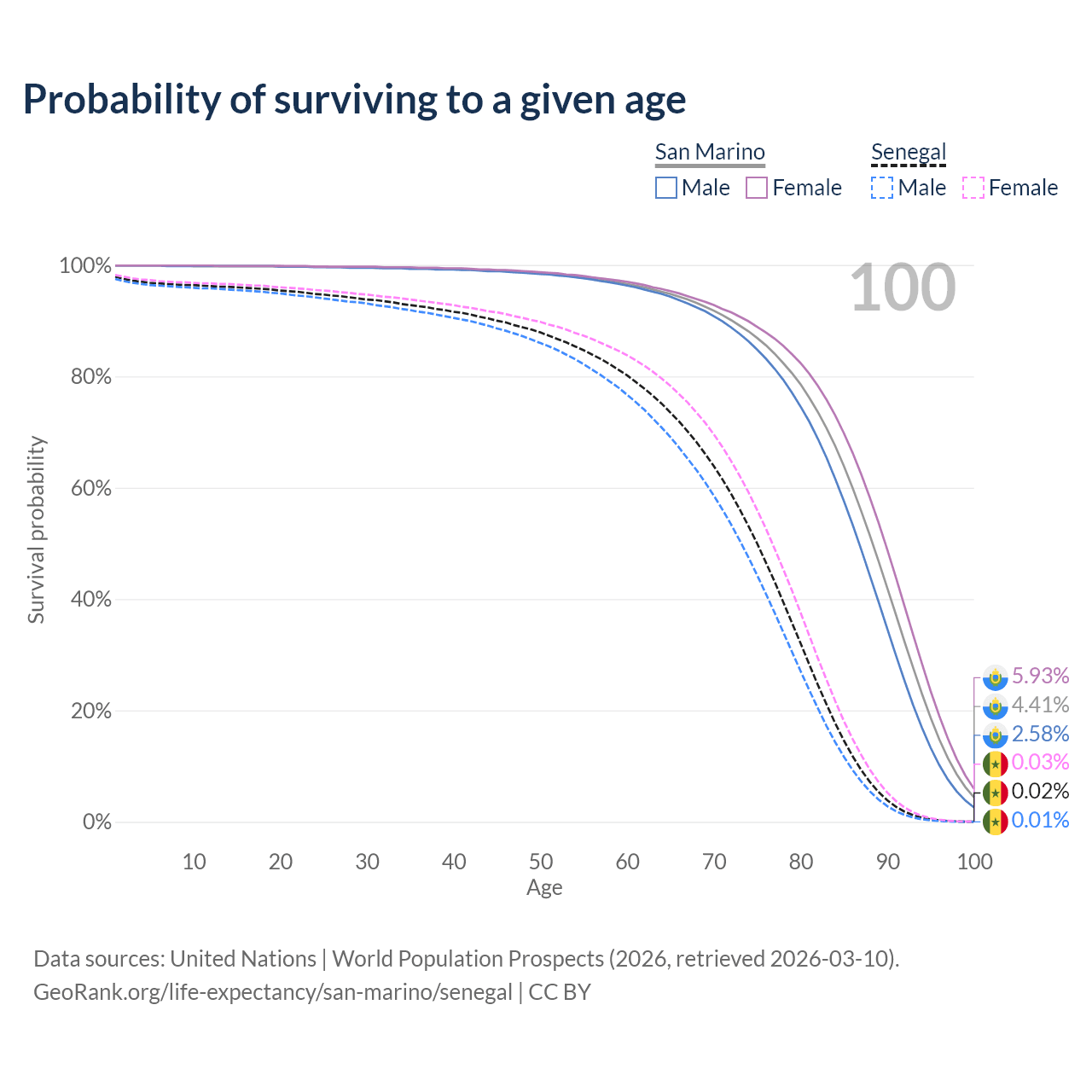 This life expectancy calculator shows the odds of living to 100, 95, 90, and below based on current age for both males and females in San Marino and Senegal, along with mean and median age of death. The calculations are based on the 2026 life tables (actuarial tables) from the UN World Population Prospects.