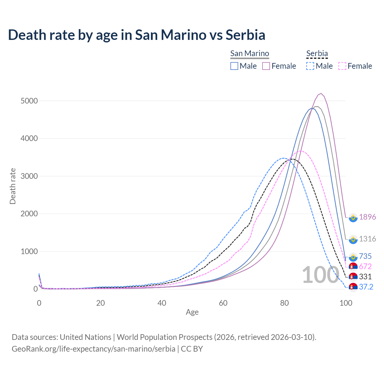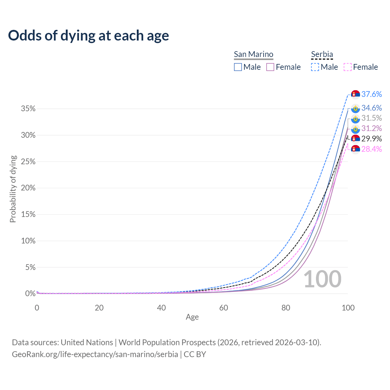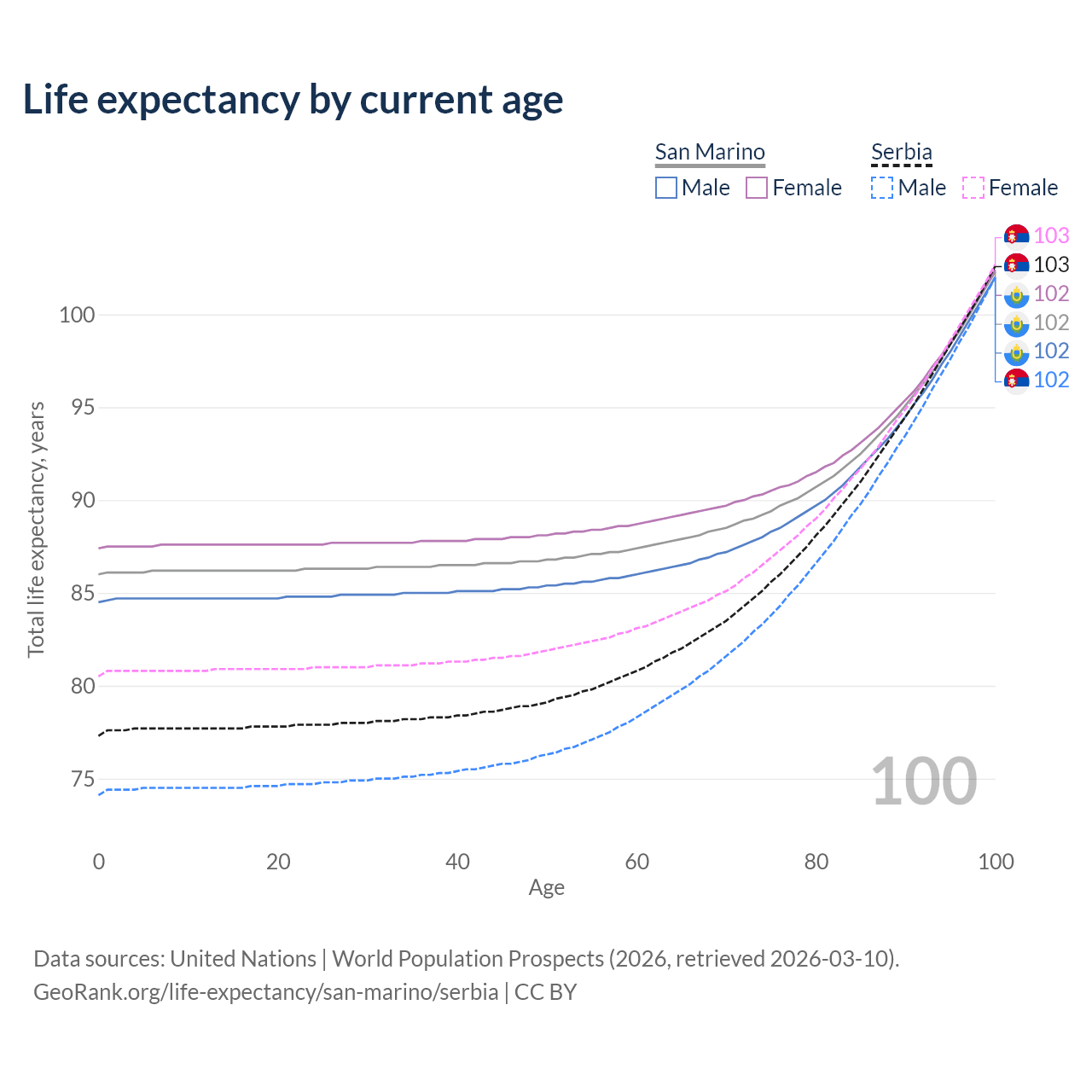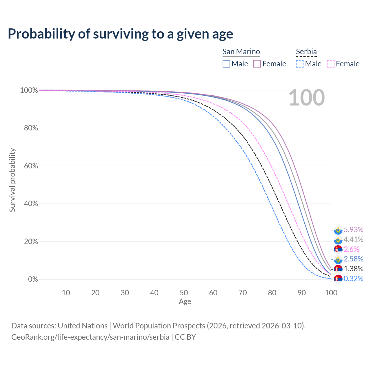 This life expectancy calculator shows the odds of living to 100, 95, 90, and below based on current age for both males and females in San Marino and Serbia, along with mean and median age of death. The calculations are based on the 2026 life tables (actuarial tables) from the UN World Population Prospects.