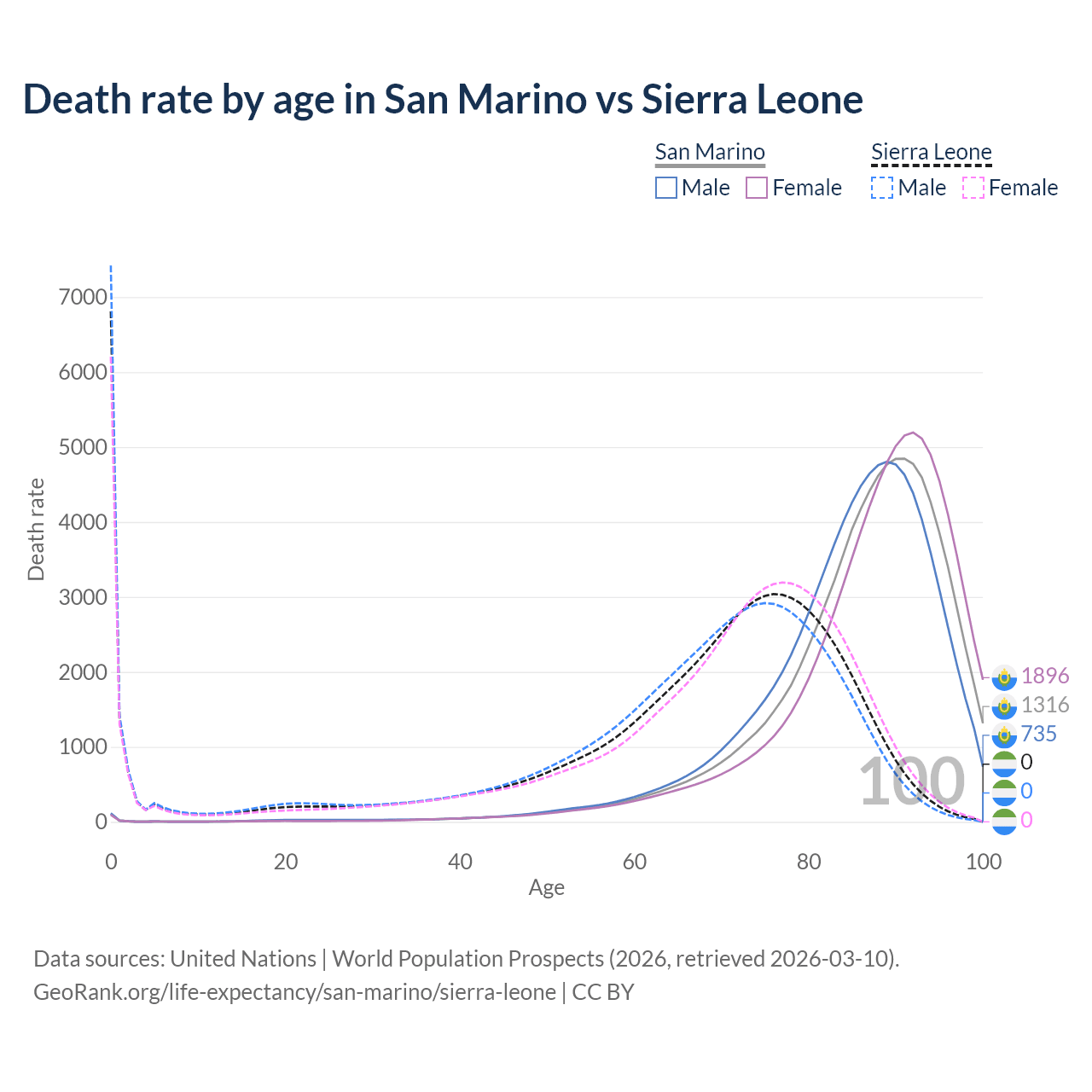 In San Marino, the most common age of death is 91, compared to 0 in Sierra Leone. The median age of death is 88.3 in San Marino and 70.8 in Sierra Leone, meaning only half of each cohort is expected to live past that age.