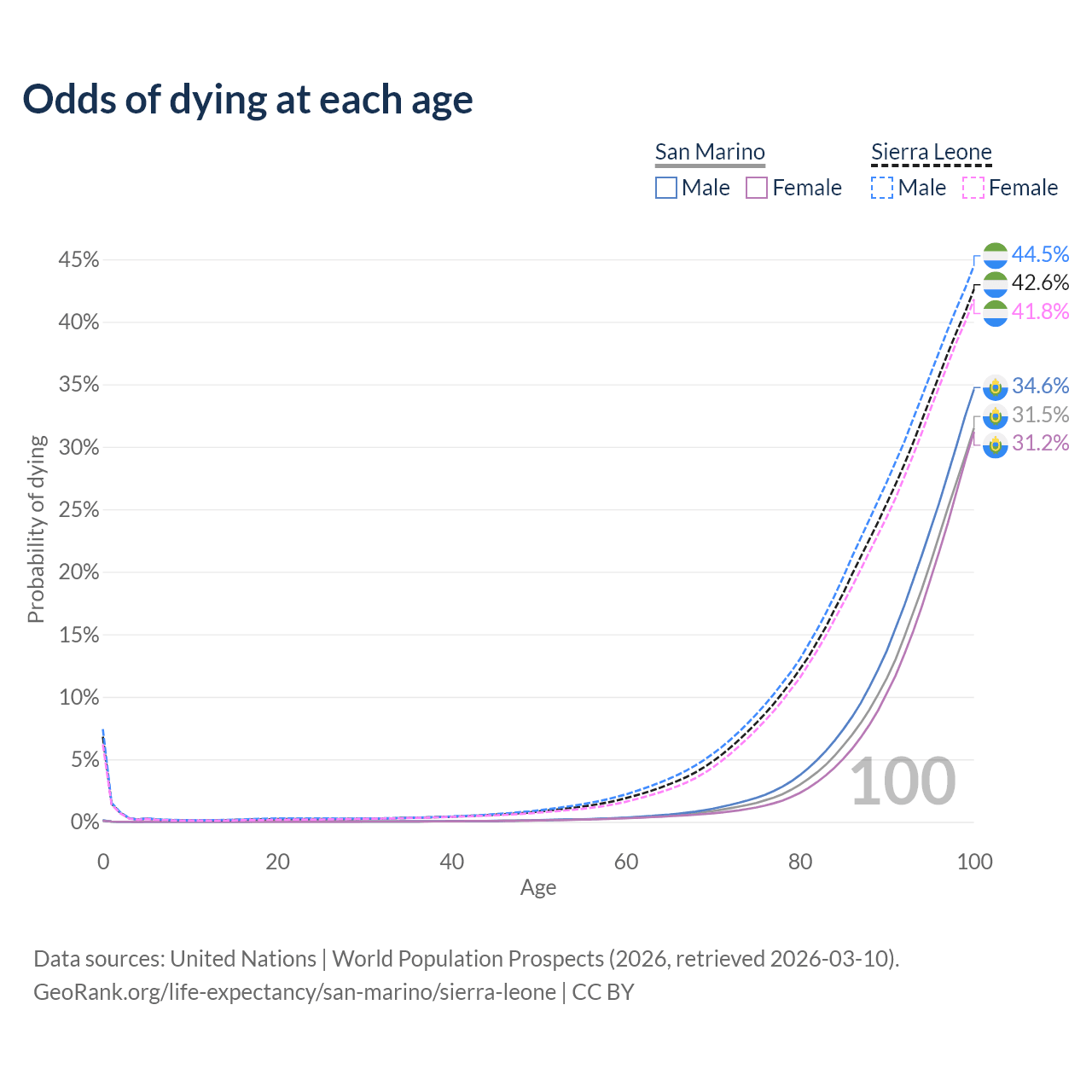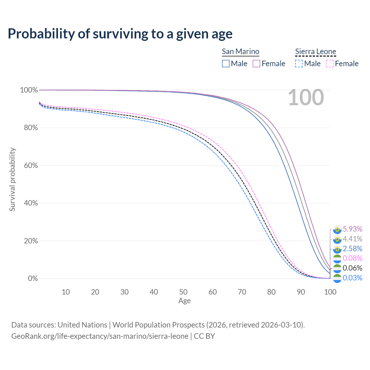 This life expectancy calculator shows the odds of living to 100, 95, 90, and below based on current age for both males and females in San Marino and Sierra Leone, along with mean and median age of death. The calculations are based on the 2026 life tables (actuarial tables) from the UN World Population Prospects.