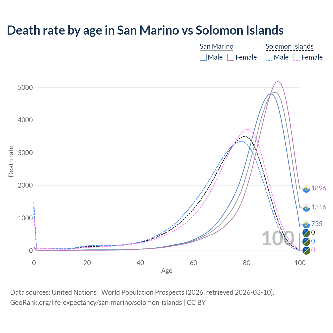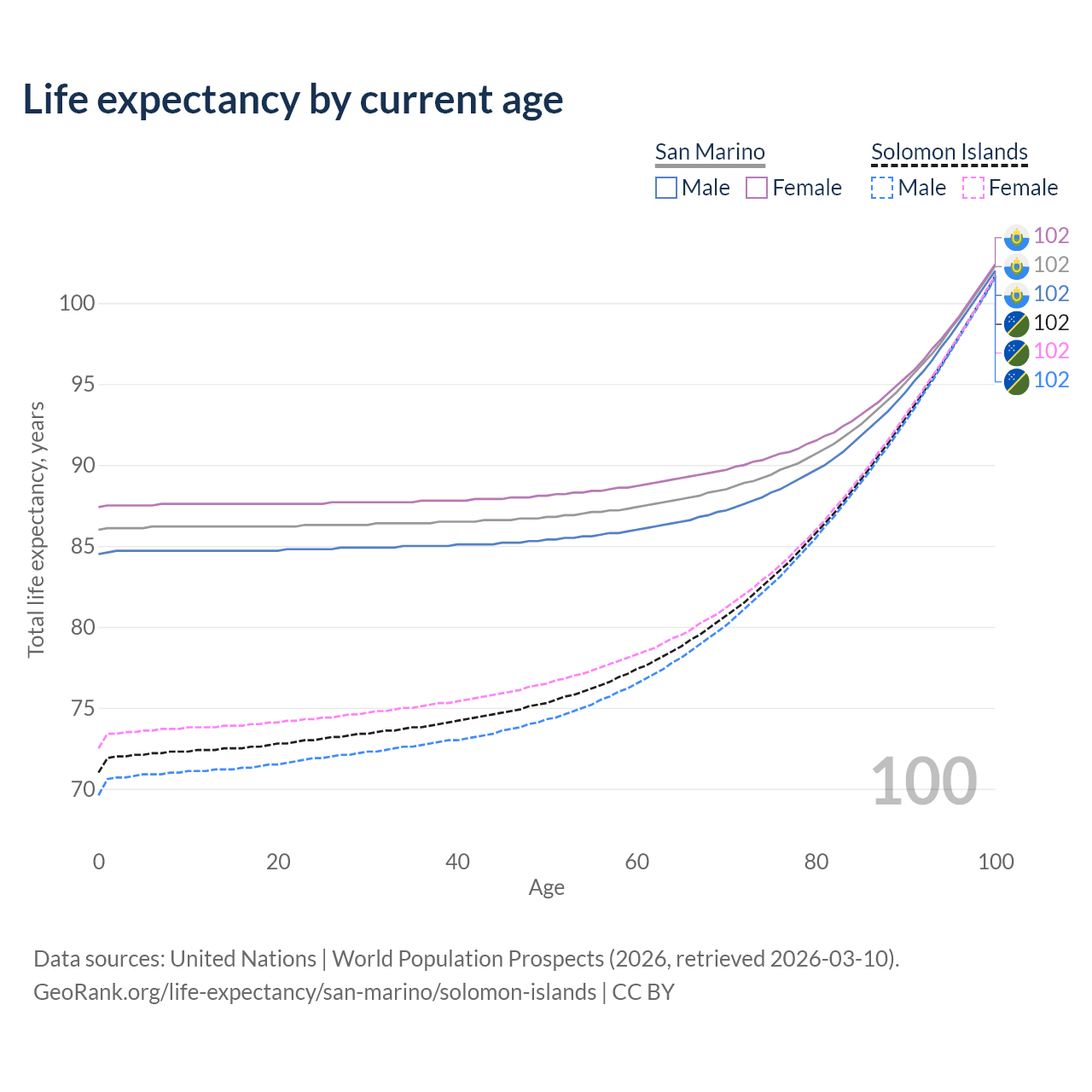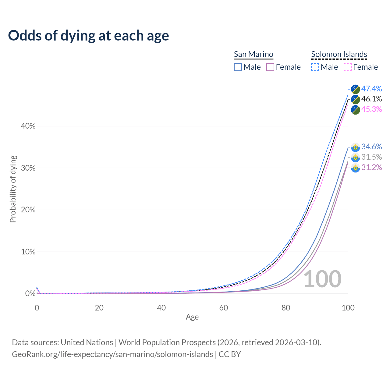 This life expectancy calculator shows the odds of living to 100, 95, 90, and below based on current age for both males and females in San Marino and the Solomon Islands, along with mean and median age of death. The calculations are based on the 2026 life tables (actuarial tables) from the UN World Population Prospects.