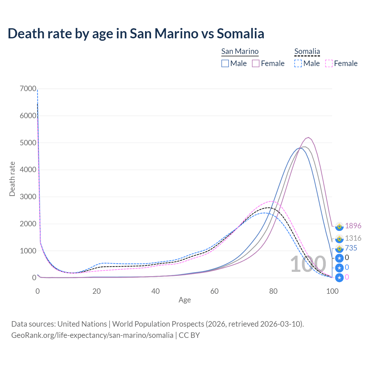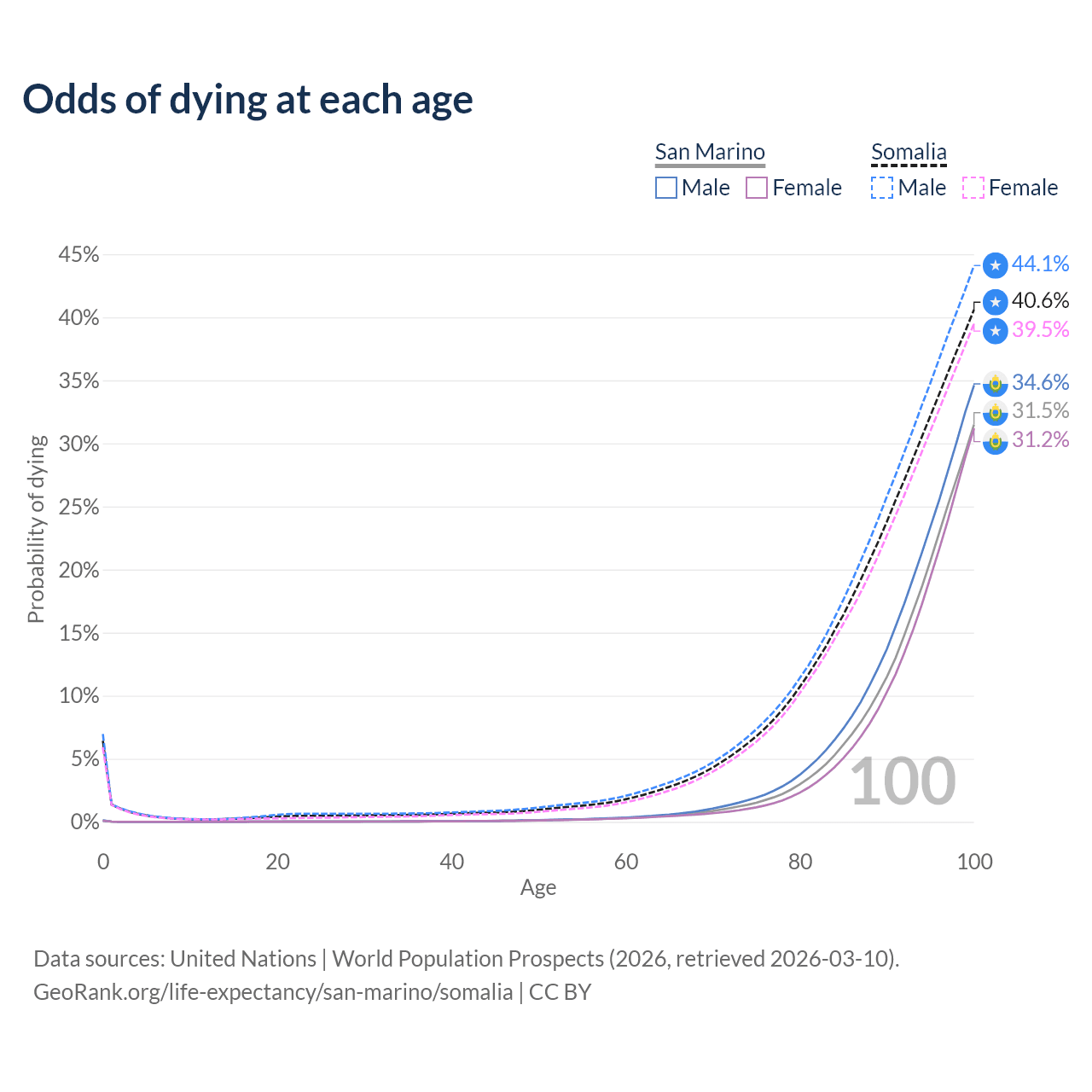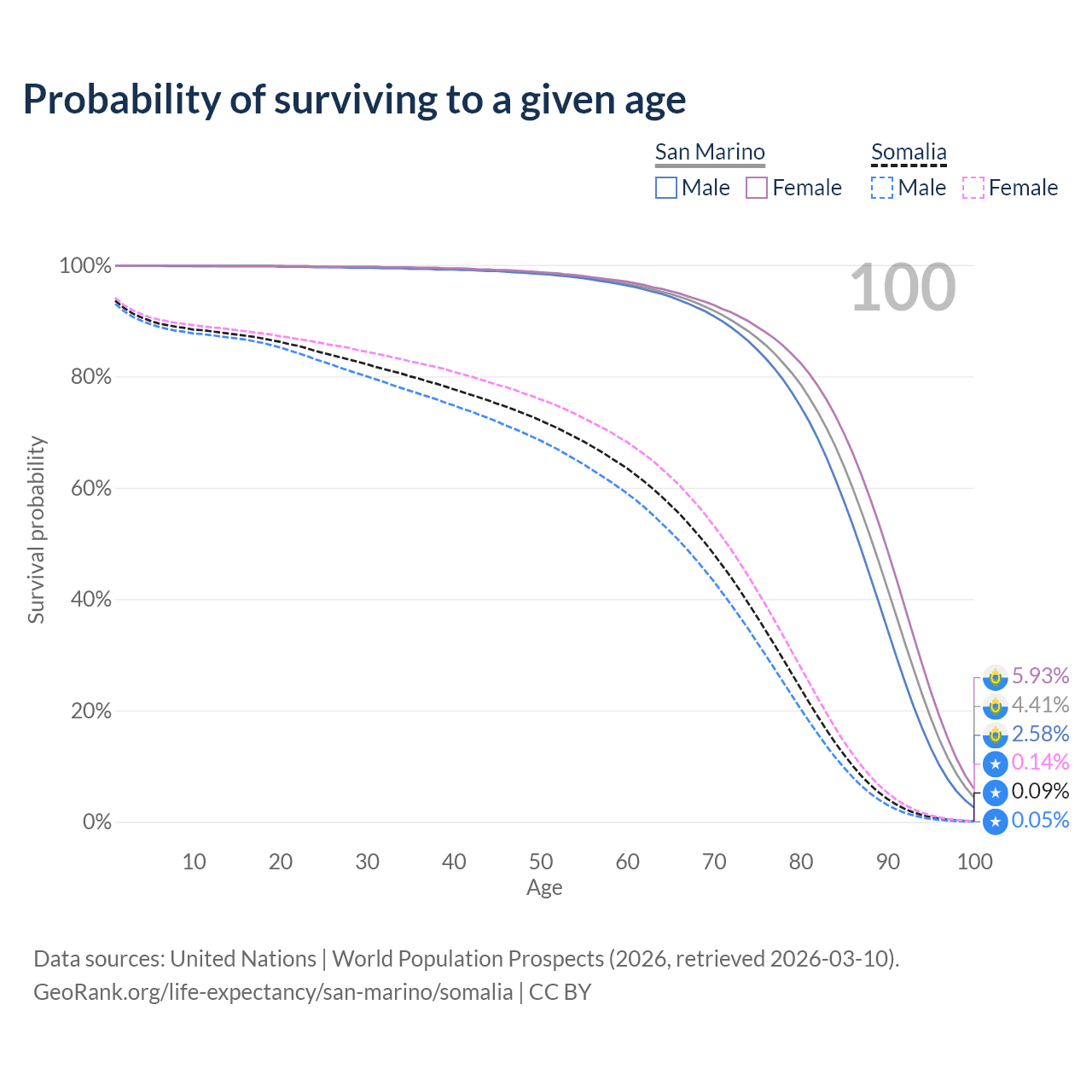 This life expectancy calculator shows the odds of living to 100, 95, 90, and below based on current age for both males and females in San Marino and Somalia, along with mean and median age of death. The calculations are based on the 2026 life tables (actuarial tables) from the UN World Population Prospects.