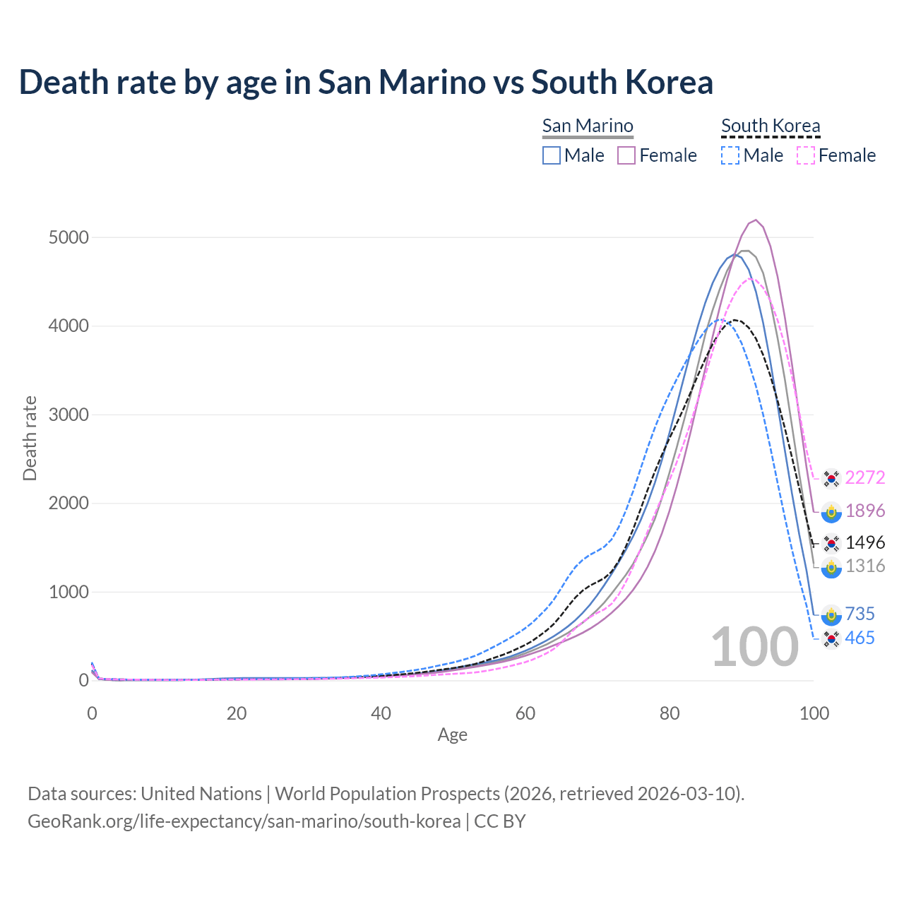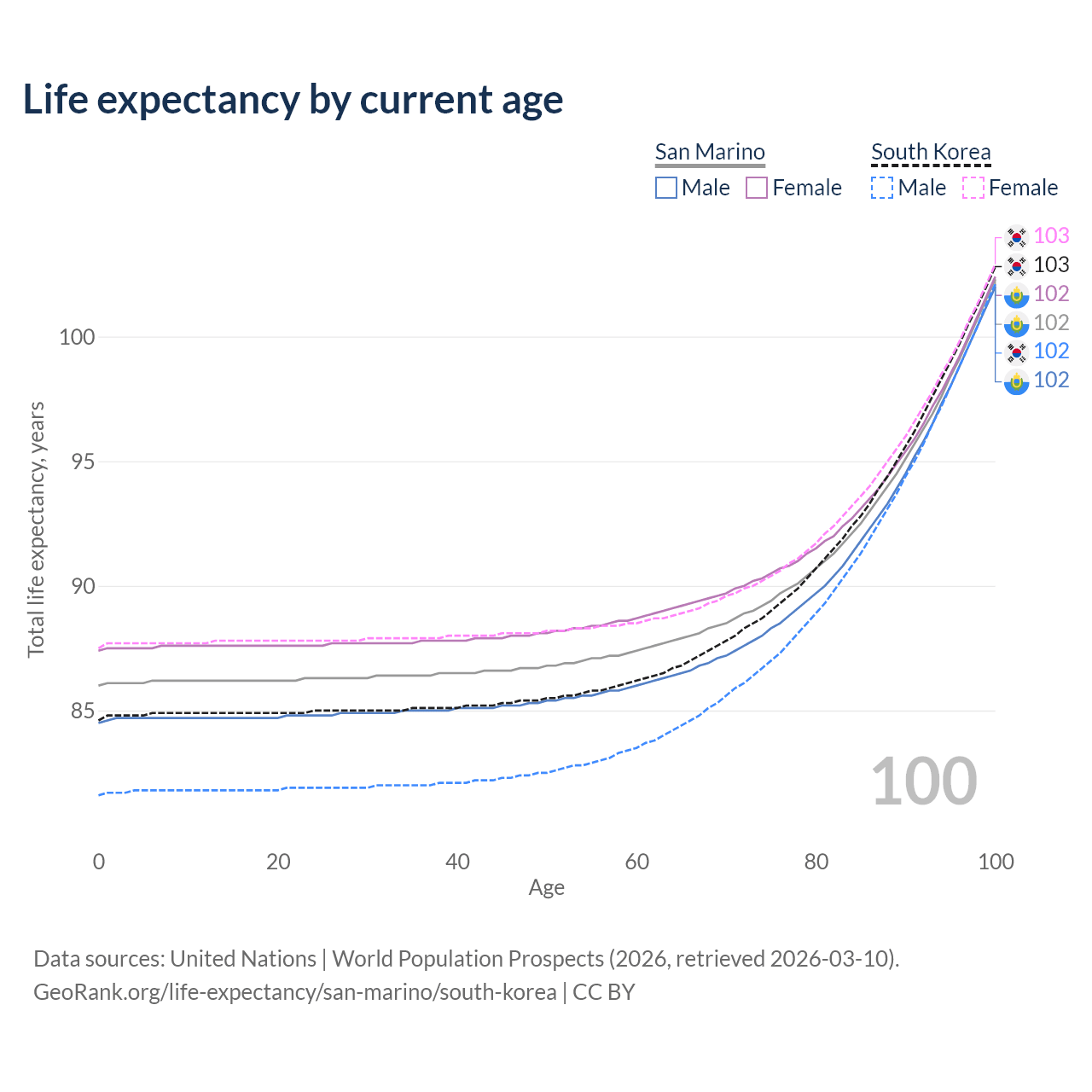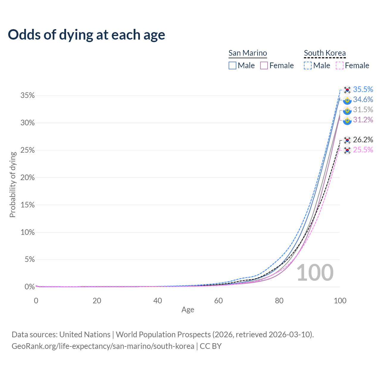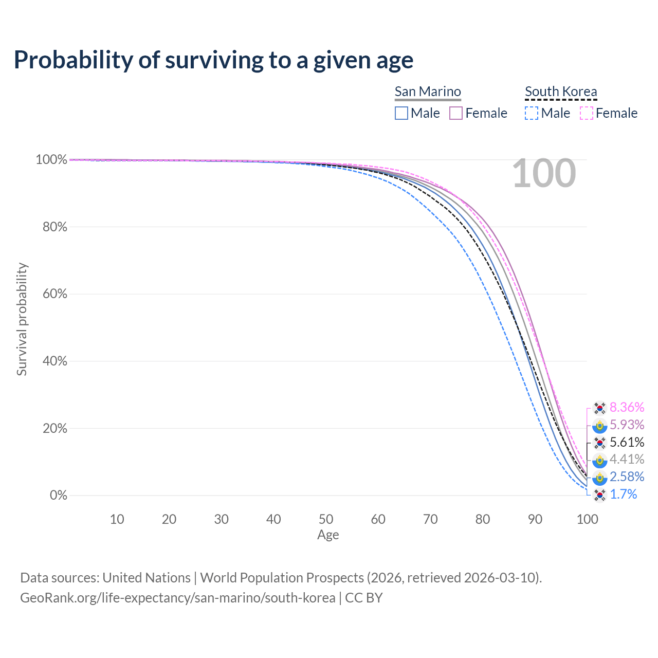 This life expectancy calculator shows the odds of living to 100, 95, 90, and below based on current age for both males and females in San Marino and South Korea, along with mean and median age of death. The calculations are based on the 2026 life tables (actuarial tables) from the UN World Population Prospects.