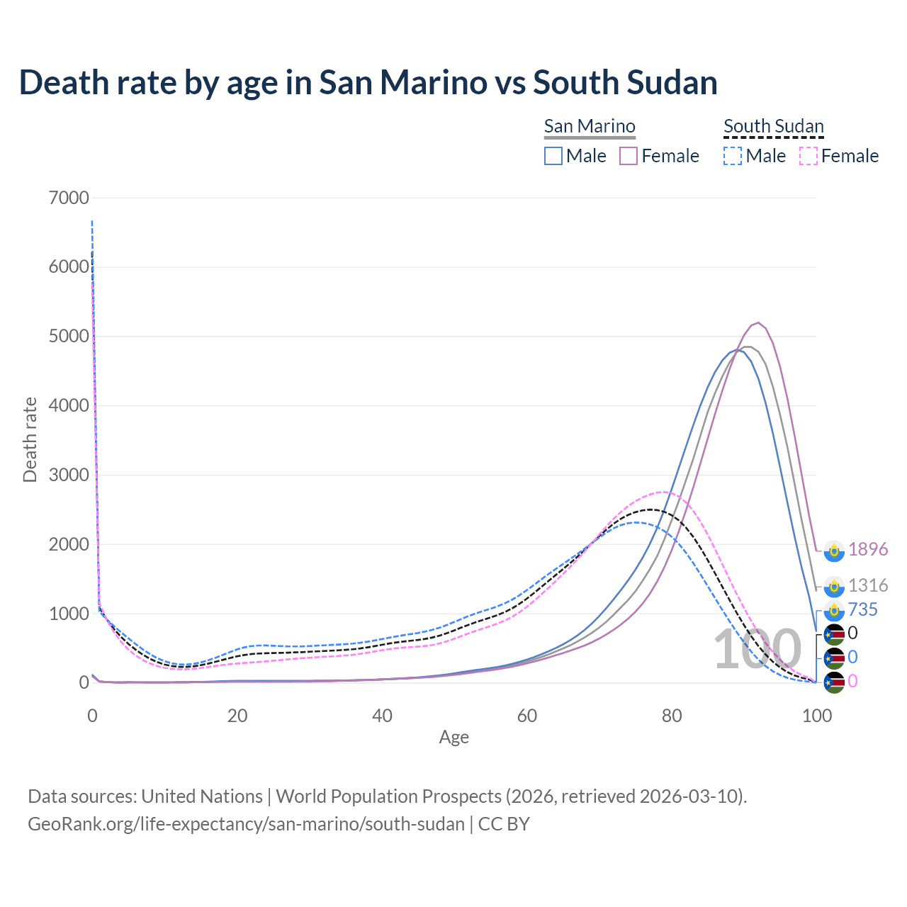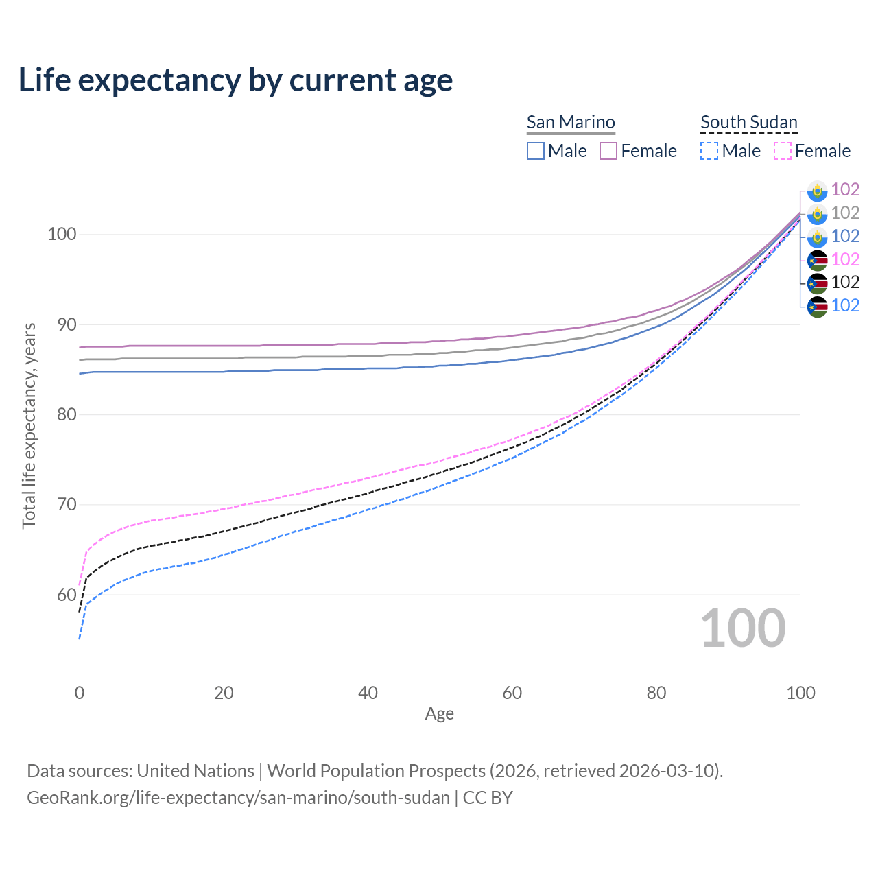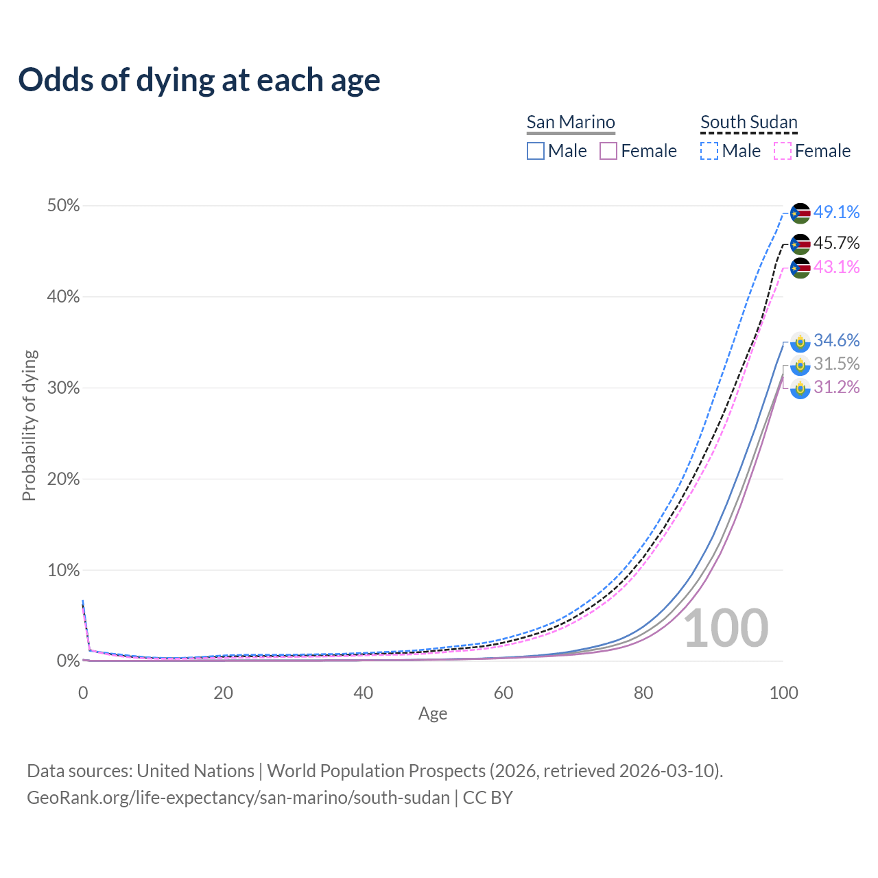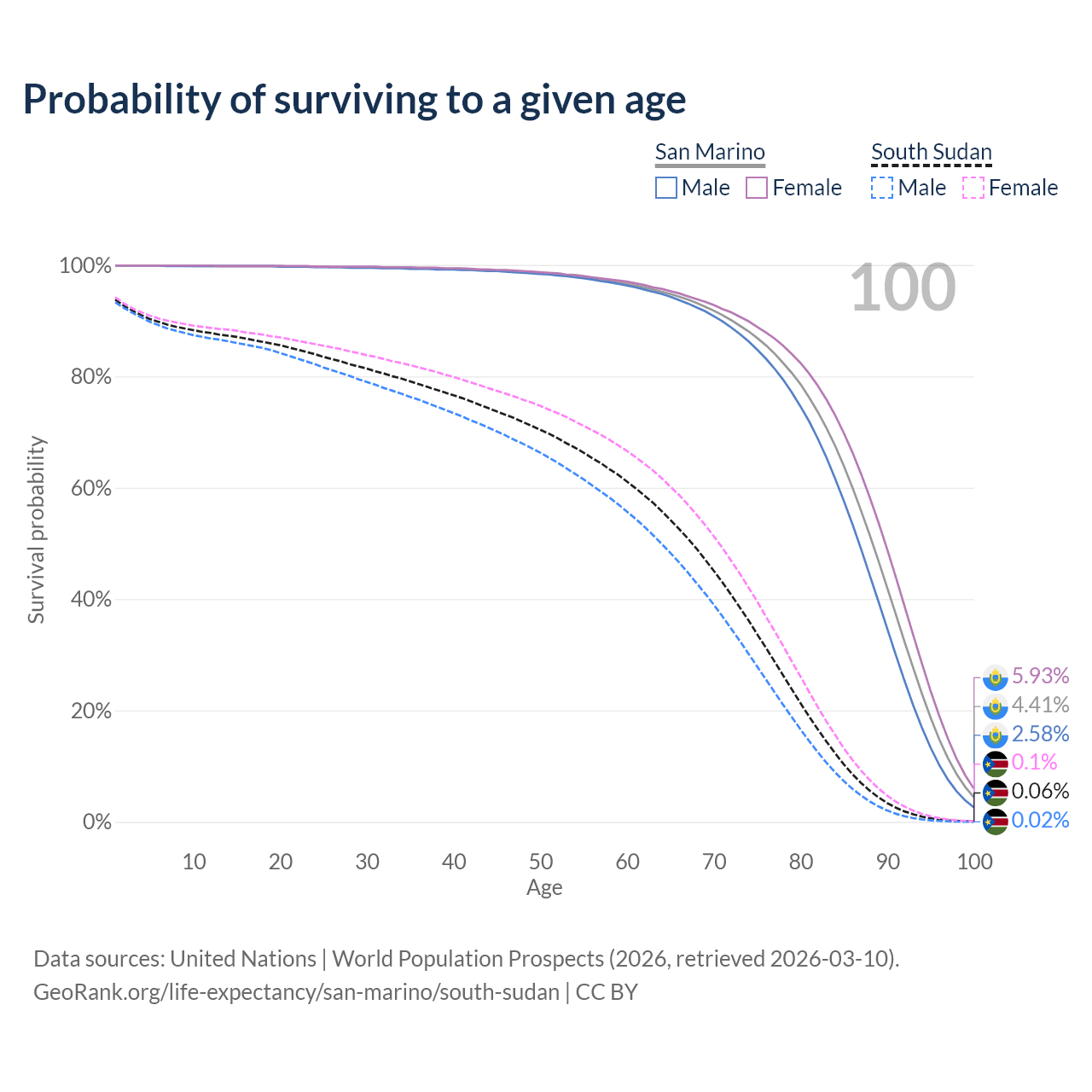 This life expectancy calculator shows the odds of living to 100, 95, 90, and below based on current age for both males and females in San Marino and South Sudan, along with mean and median age of death. The calculations are based on the 2026 life tables (actuarial tables) from the UN World Population Prospects.