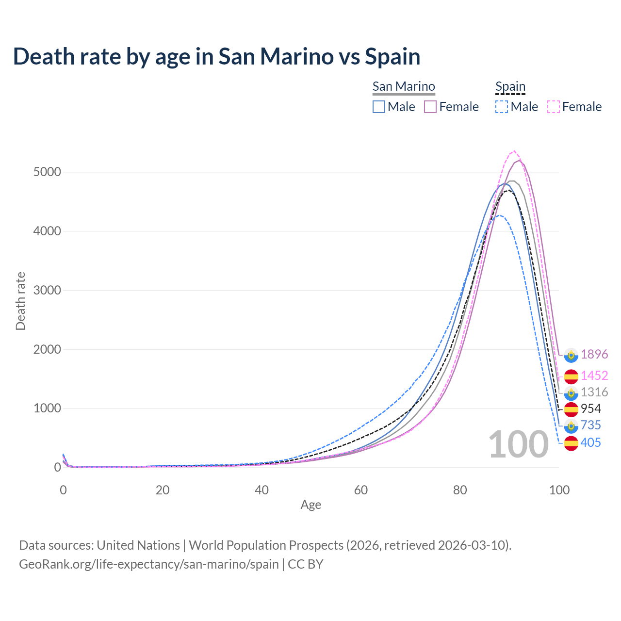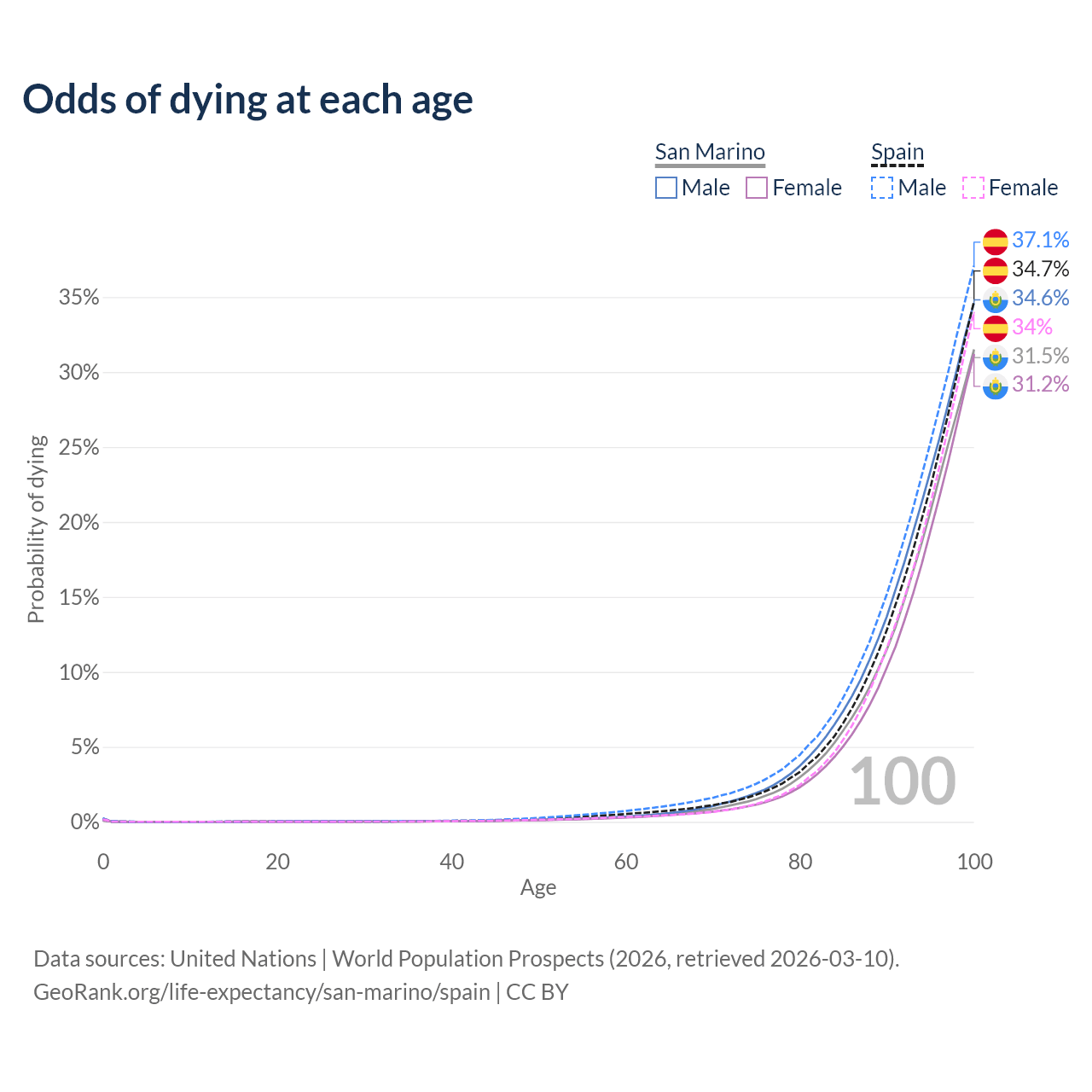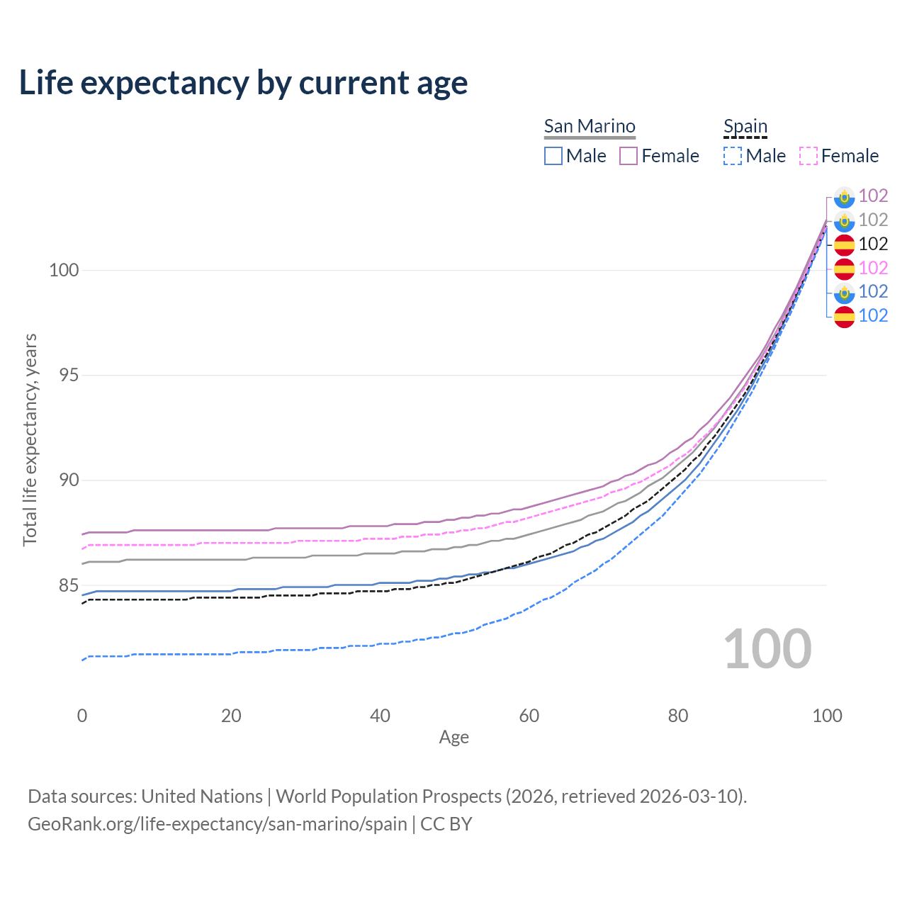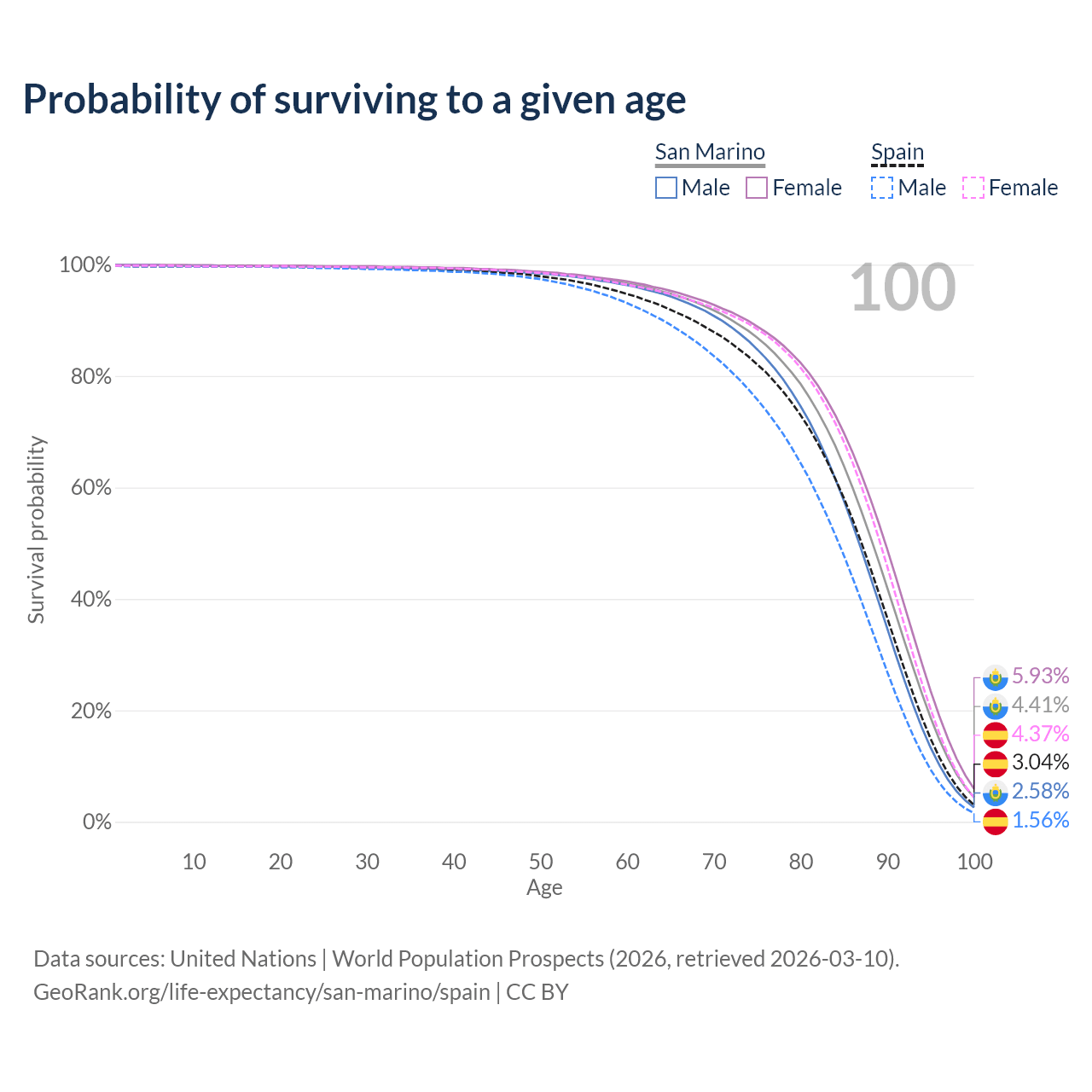 This life expectancy calculator shows the odds of living to 100, 95, 90, and below based on current age for both males and females in San Marino and Spain, along with mean and median age of death. The calculations are based on the 2026 life tables (actuarial tables) from the UN World Population Prospects.