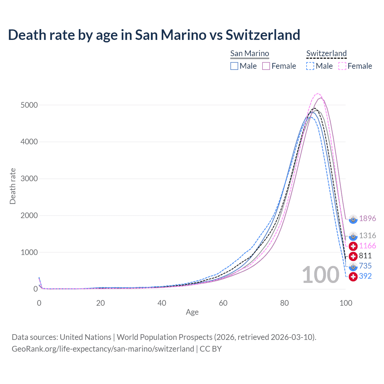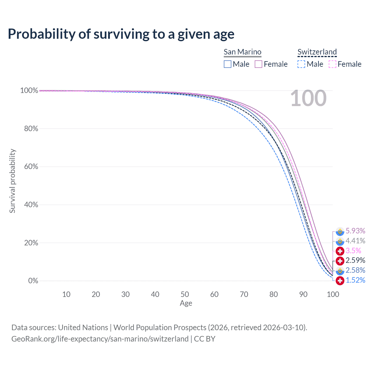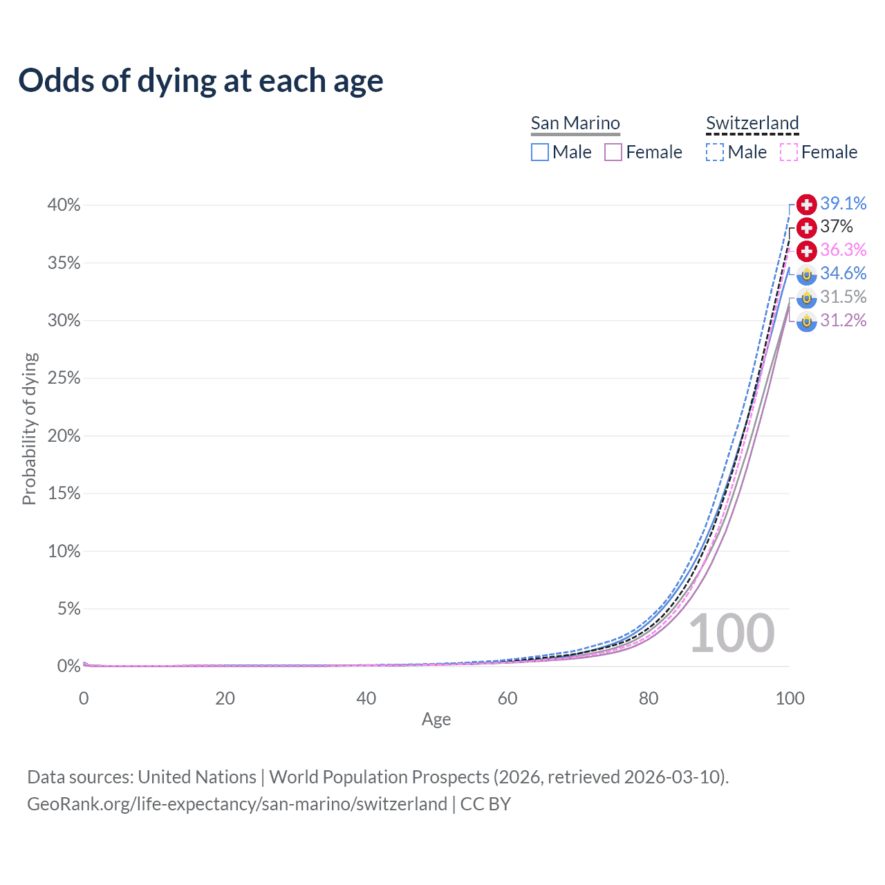 This life expectancy calculator shows the odds of living to 100, 95, 90, and below based on current age for both males and females in San Marino and Switzerland, along with mean and median age of death. The calculations are based on the 2026 life tables (actuarial tables) from the UN World Population Prospects.