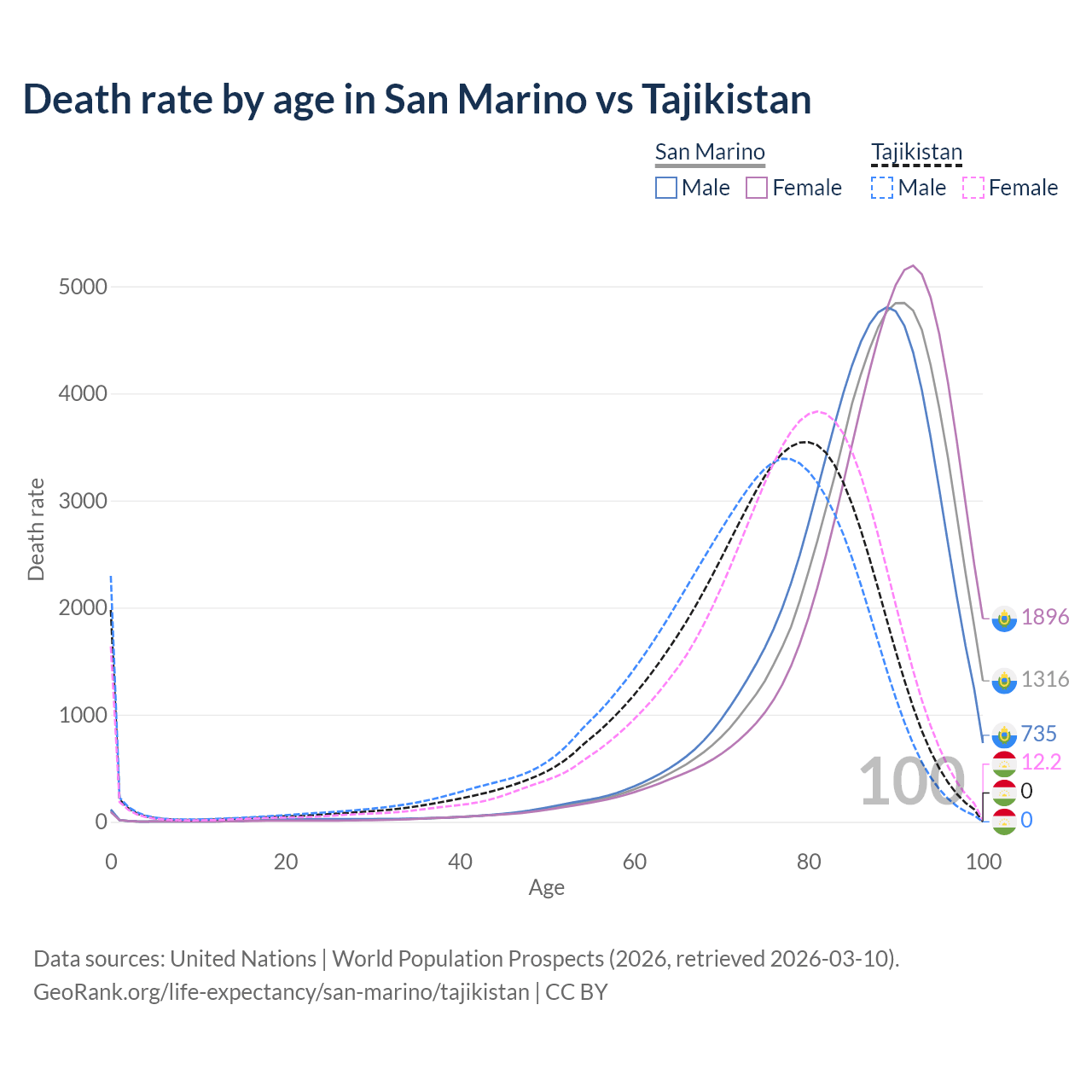 In San Marino, the most common age of death is 91, compared to 80 in Tajikistan. The median age of death is 88.3 in San Marino and 76 in Tajikistan, meaning only half of each cohort is expected to live past that age.
