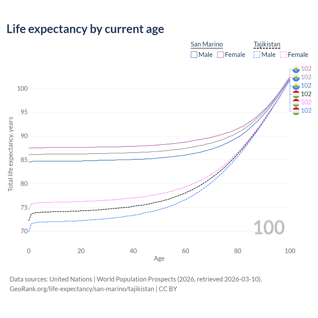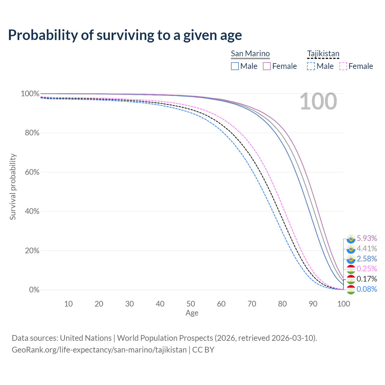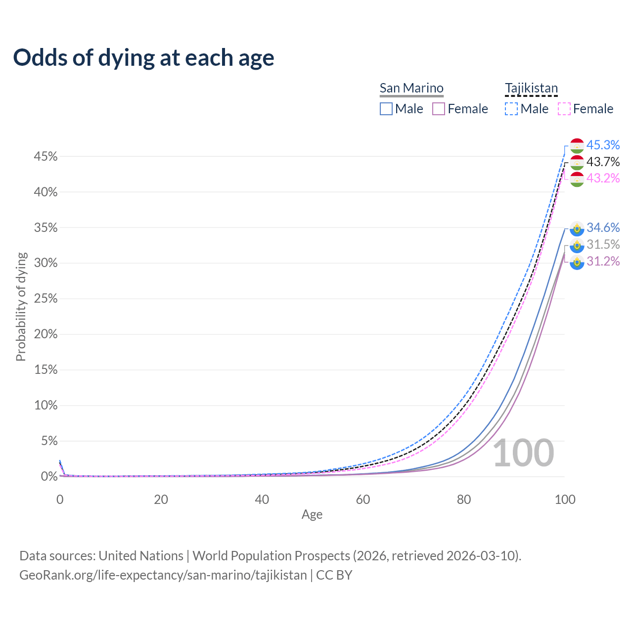 This life expectancy calculator shows the odds of living to 100, 95, 90, and below based on current age for both males and females in San Marino and Tajikistan, along with mean and median age of death. The calculations are based on the 2026 life tables (actuarial tables) from the UN World Population Prospects.