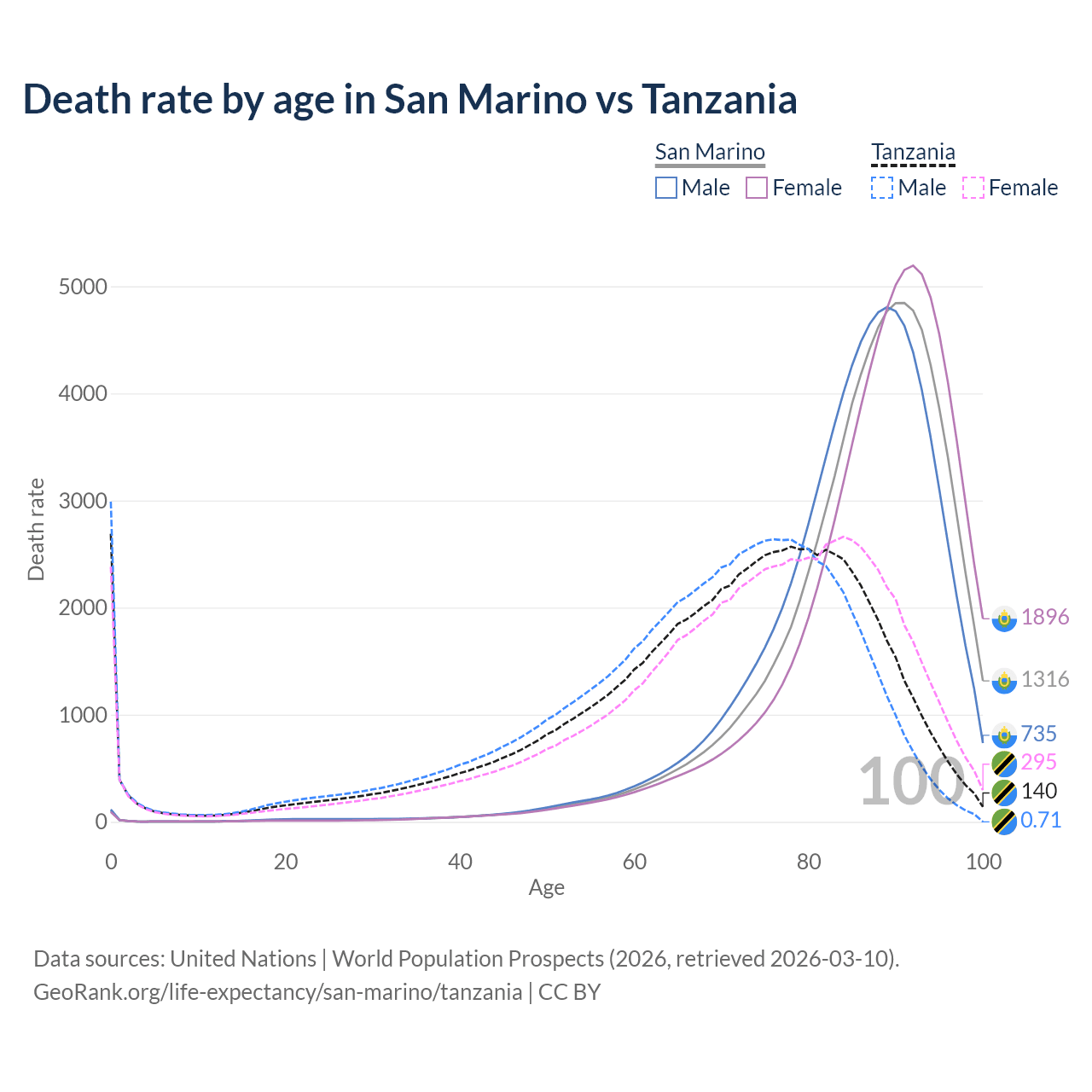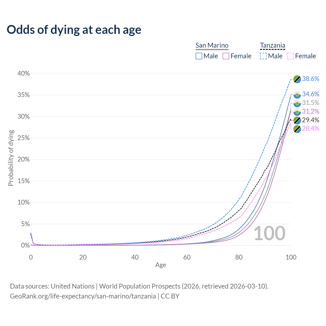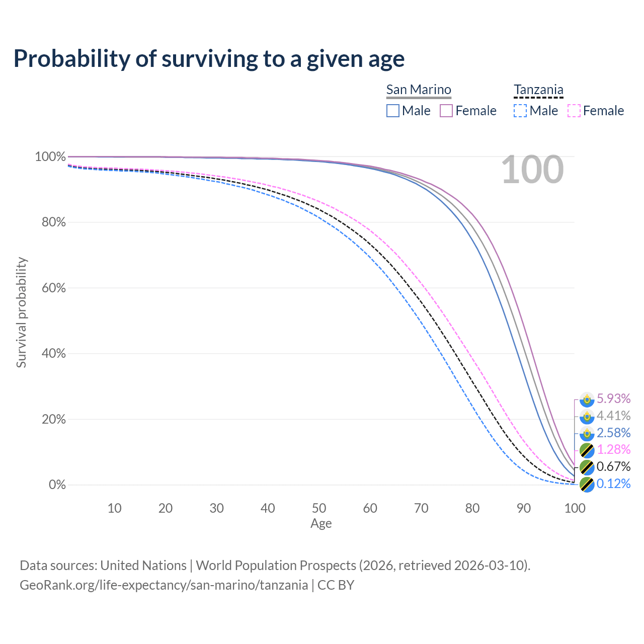 This life expectancy calculator shows the odds of living to 100, 95, 90, and below based on current age for both males and females in San Marino and Tanzania, along with mean and median age of death. The calculations are based on the 2026 life tables (actuarial tables) from the UN World Population Prospects.