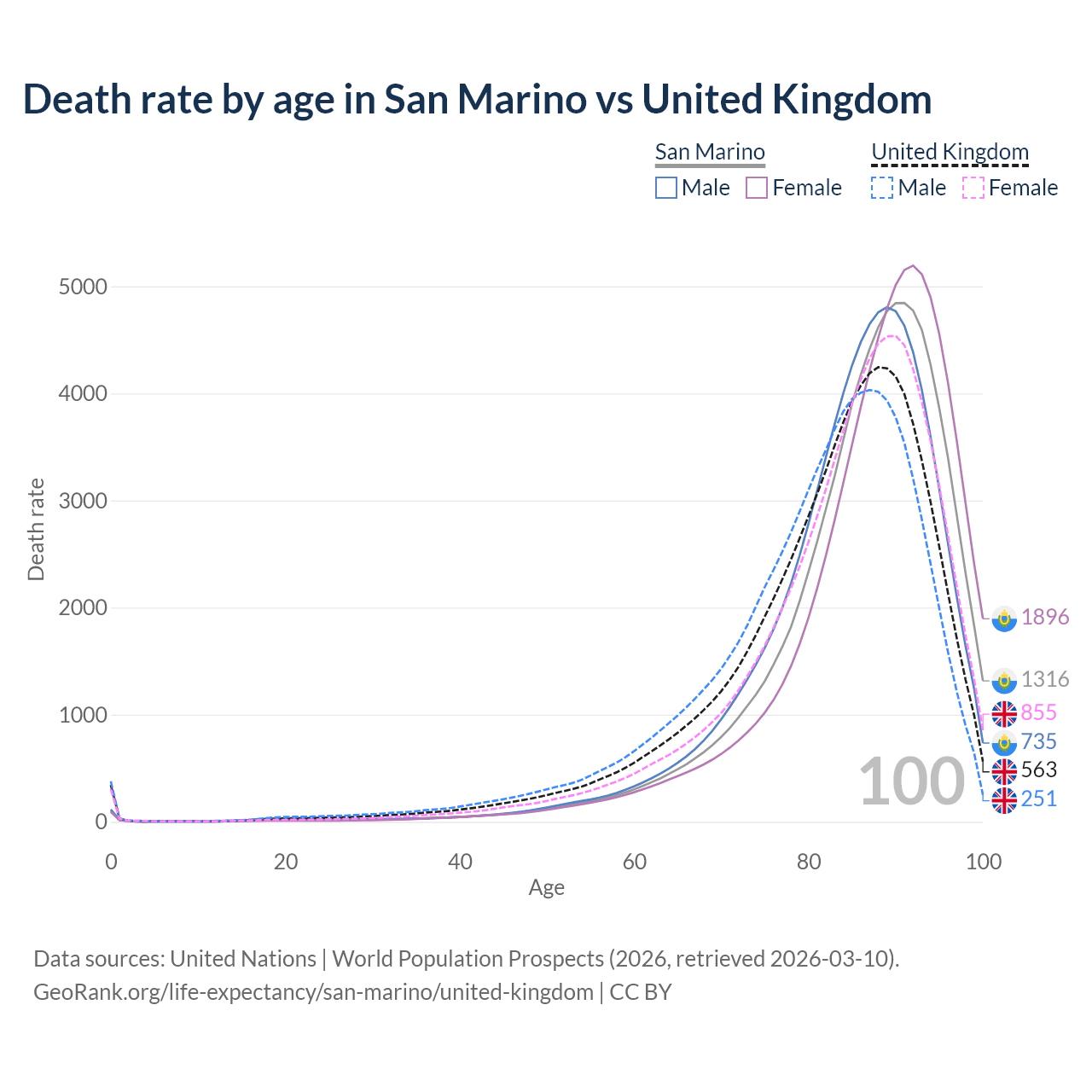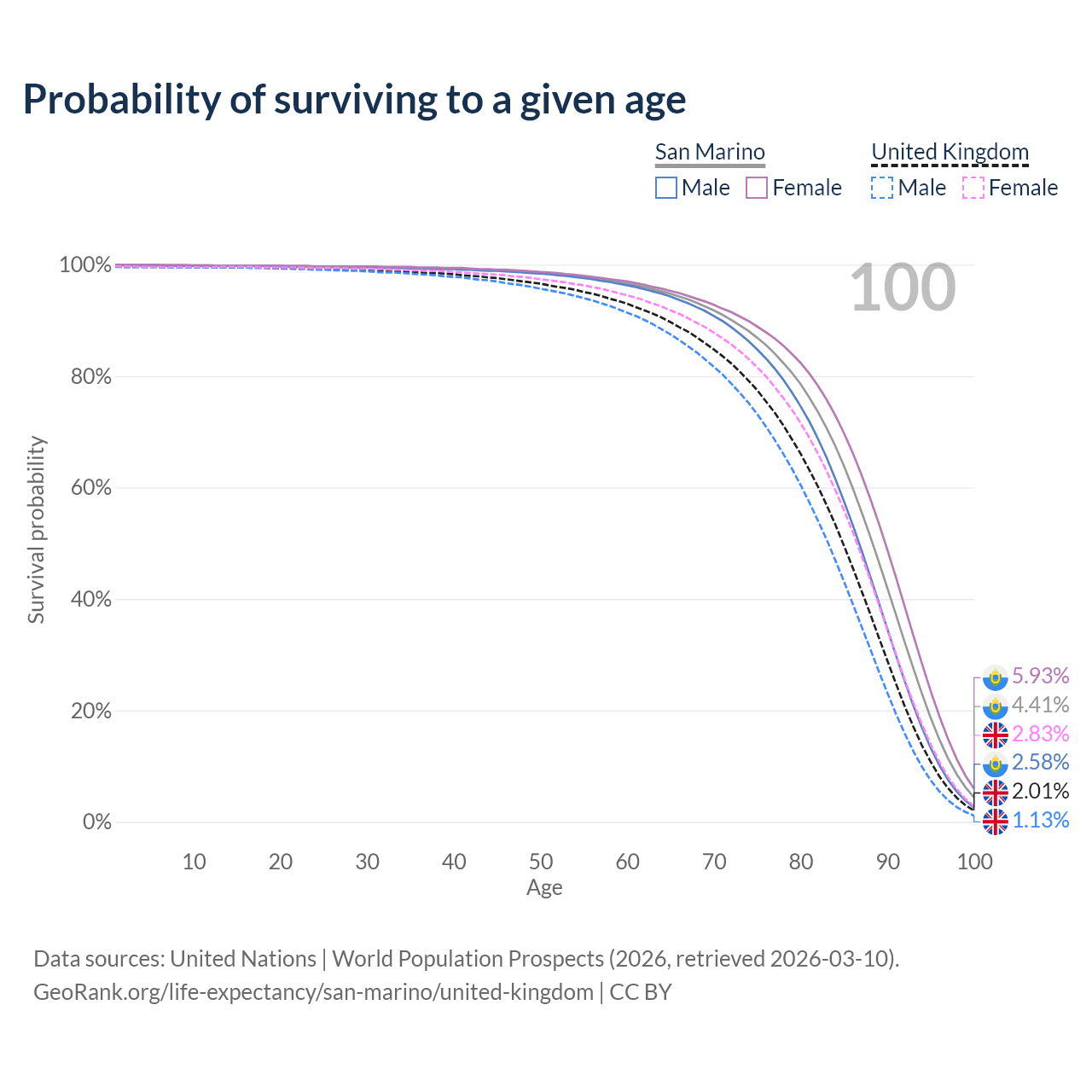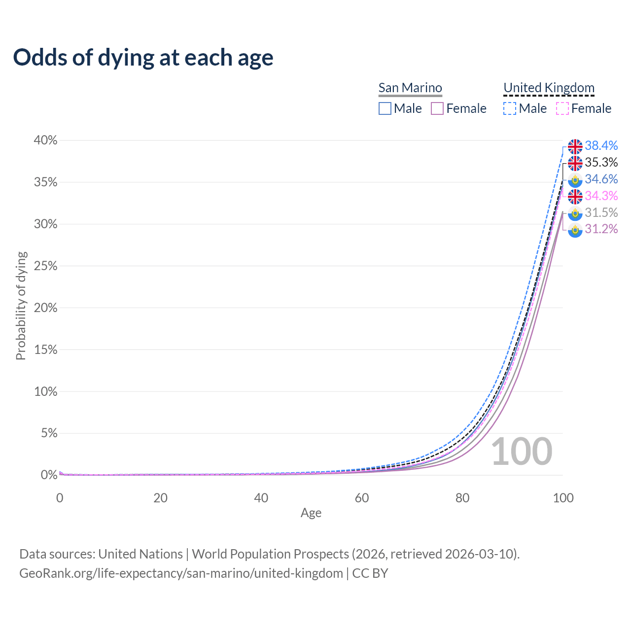This life expectancy calculator shows the odds of living to 100, 95, 90, and below based on current age for both males and females in San Marino and the United Kingdom, along with mean and median age of death. The calculations are based on the 2026 life tables (actuarial tables) from the UN World Population Prospects.
