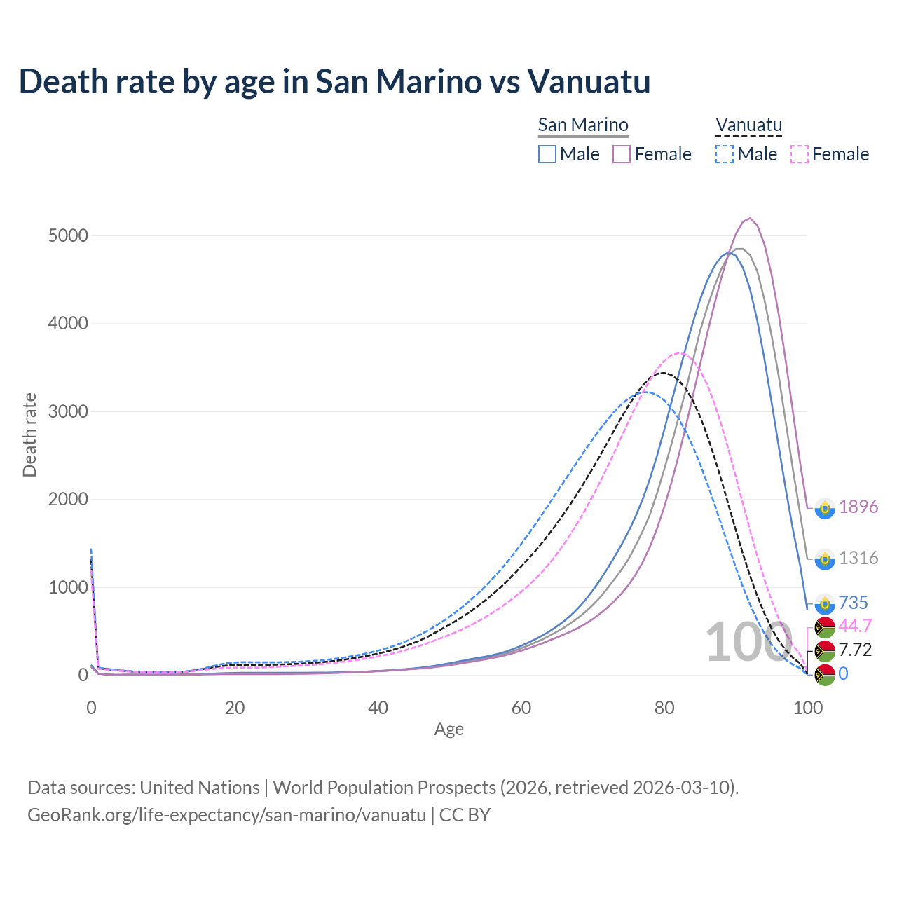 In San Marino, the most common age of death is 91, compared to 80 in Vanuatu. The median age of death is 88.3 in San Marino and 75.9 in Vanuatu, meaning only half of each cohort is expected to live past that age.