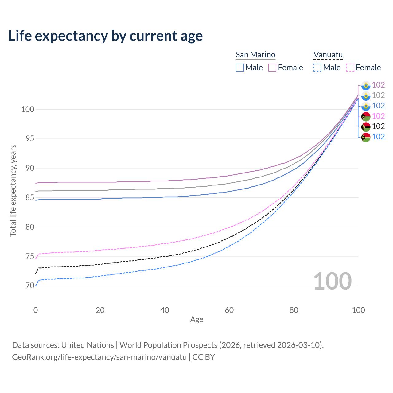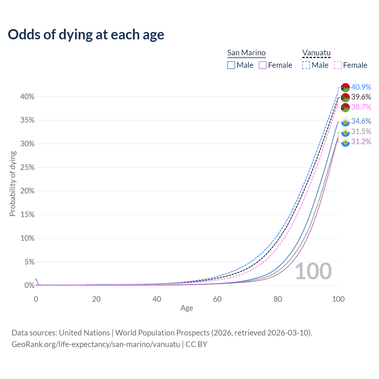 This life expectancy calculator shows the odds of living to 100, 95, 90, and below based on current age for both males and females in San Marino and Vanuatu, along with mean and median age of death. The calculations are based on the 2026 life tables (actuarial tables) from the UN World Population Prospects.
