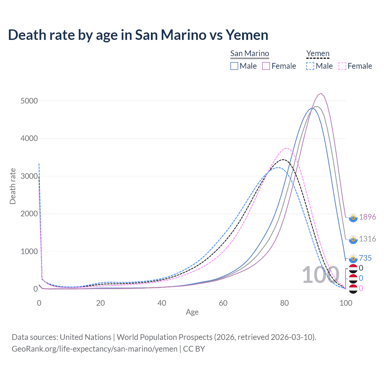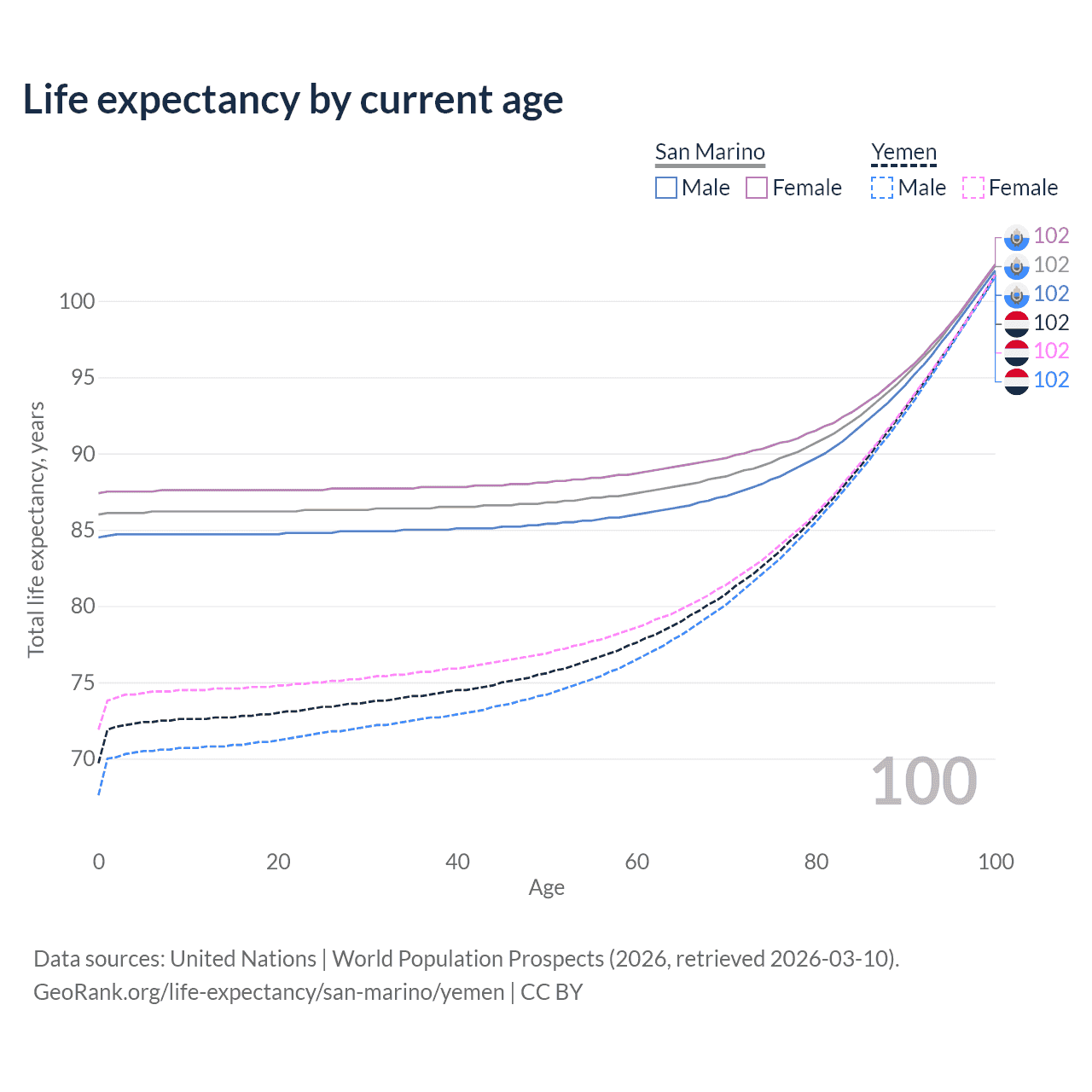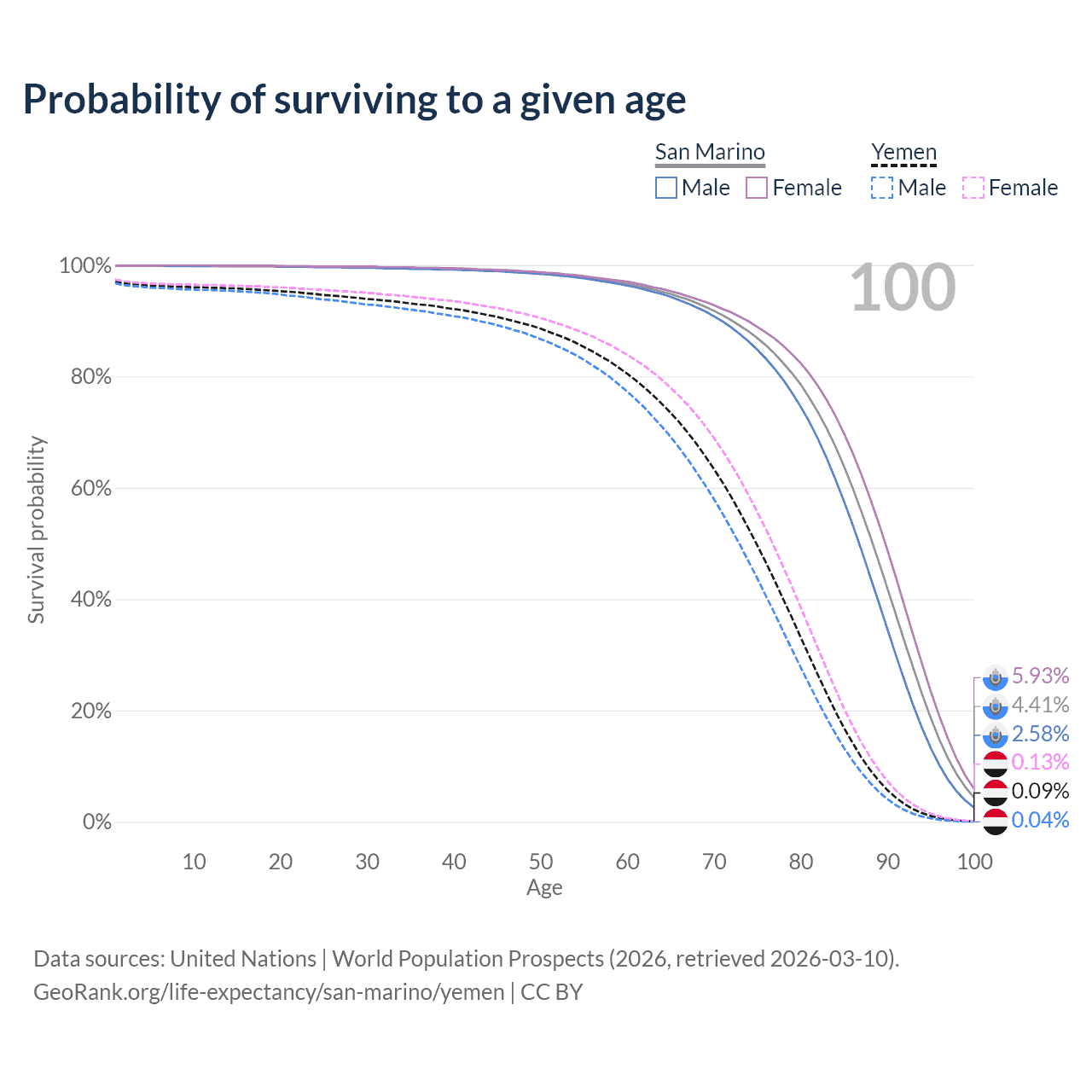 This life expectancy calculator shows the odds of living to 100, 95, 90, and below based on current age for both males and females in San Marino and Yemen, along with mean and median age of death. The calculations are based on the 2026 life tables (actuarial tables) from the UN World Population Prospects.