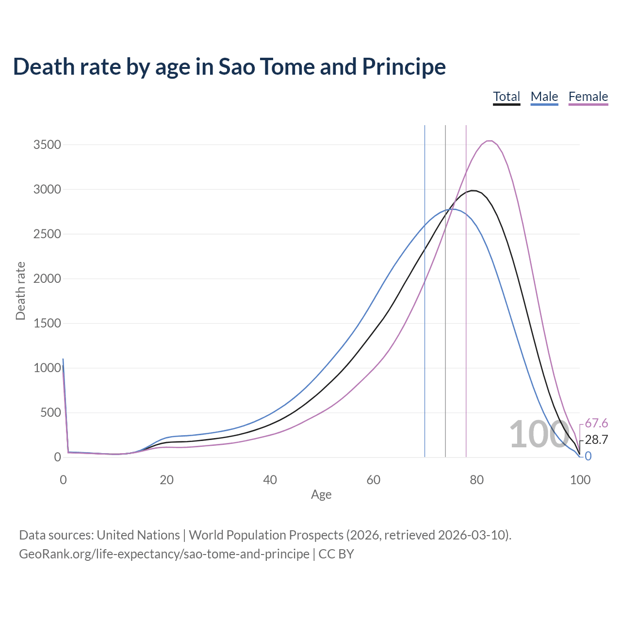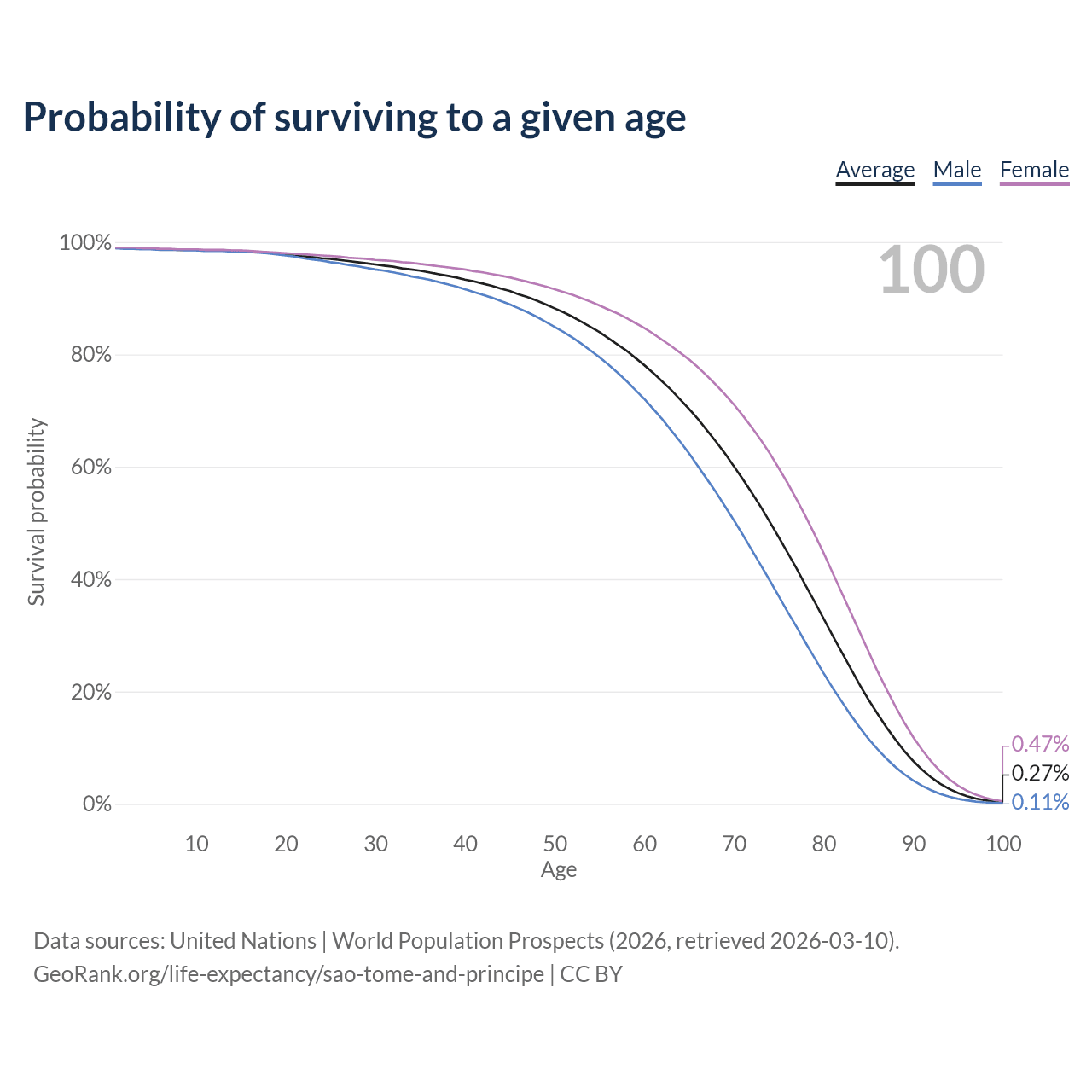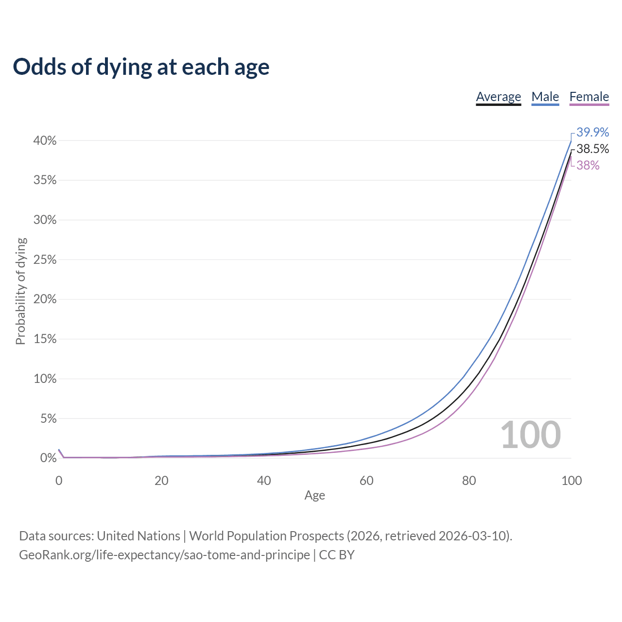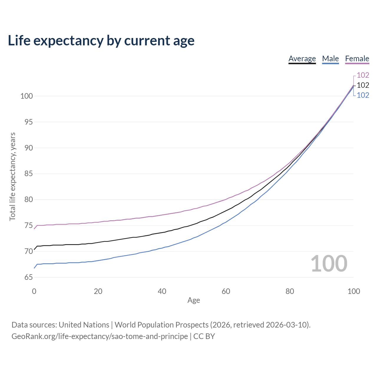 This life expectancy calculator shows the odds of living to 100, 95, 90, and below based on current age for both males and females in Sao Tome and Principe, along with mean and median age of death. The calculations are based on the 2026 life tables (actuarial tables) from the UN World Population Prospects.