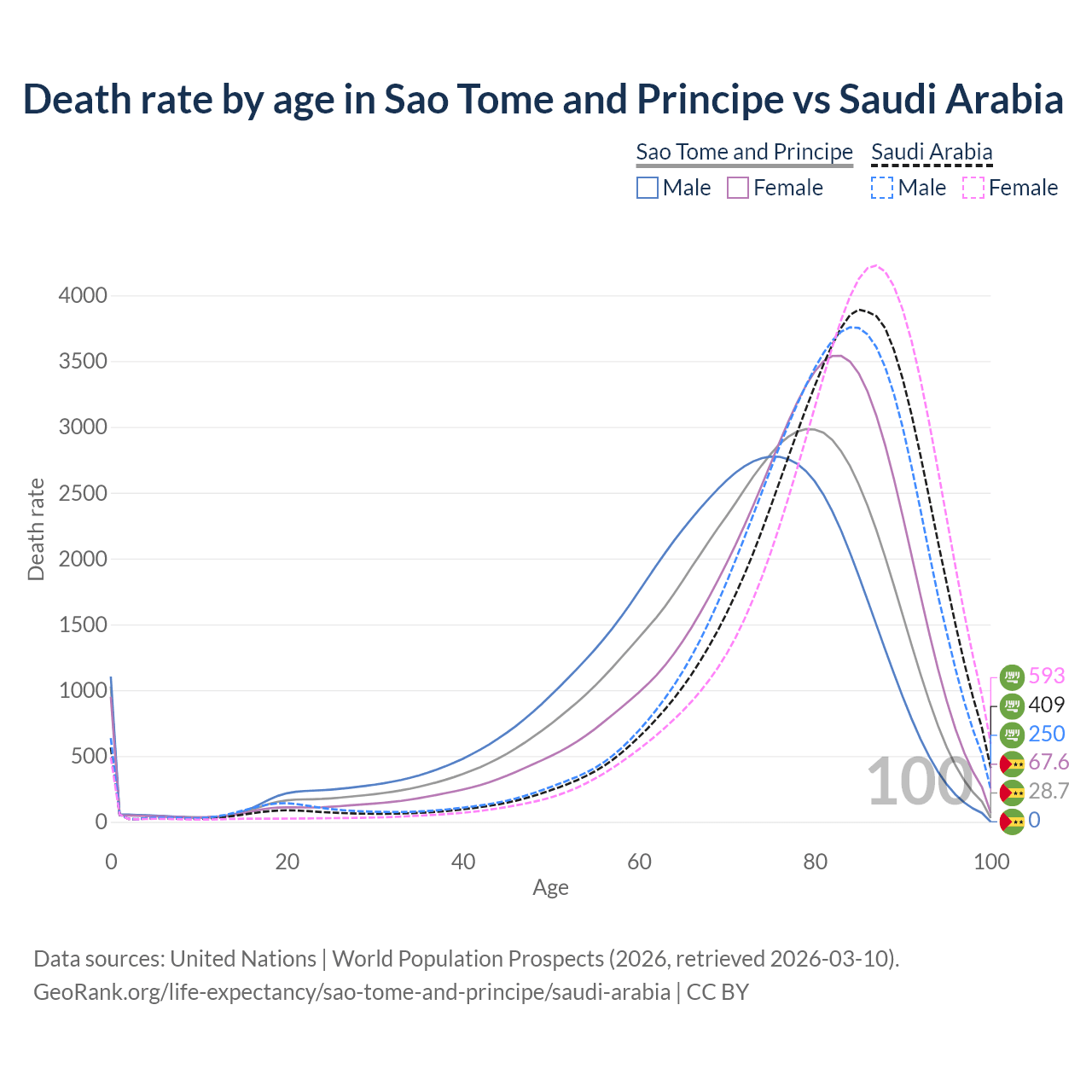 In Sao Tome and Principe, the most common age of death is 79, compared to 85 in Saudi Arabia. The median age of death is 74.1 in Sao Tome and Principe and 82.5 in Saudi Arabia, meaning only half of each cohort is expected to live past that age.