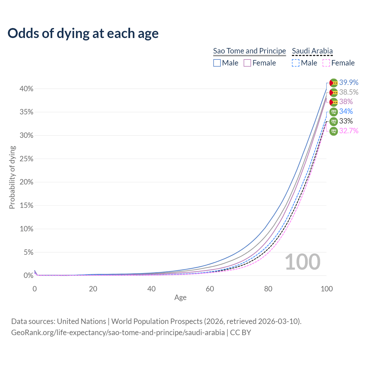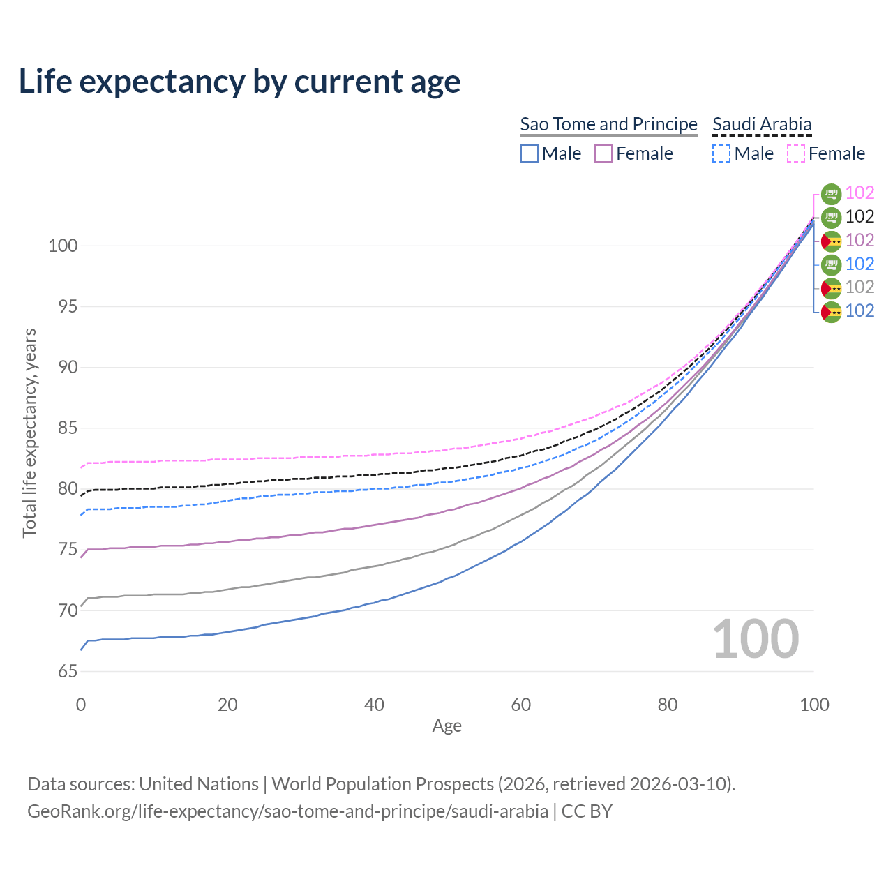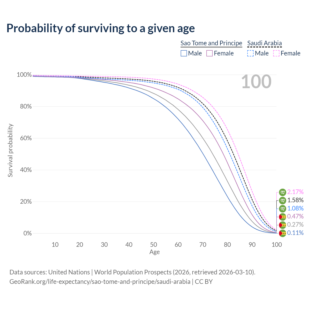 This life expectancy calculator shows the odds of living to 100, 95, 90, and below based on current age for both males and females in Sao Tome and Principe and Saudi Arabia, along with mean and median age of death. The calculations are based on the 2026 life tables (actuarial tables) from the UN World Population Prospects.