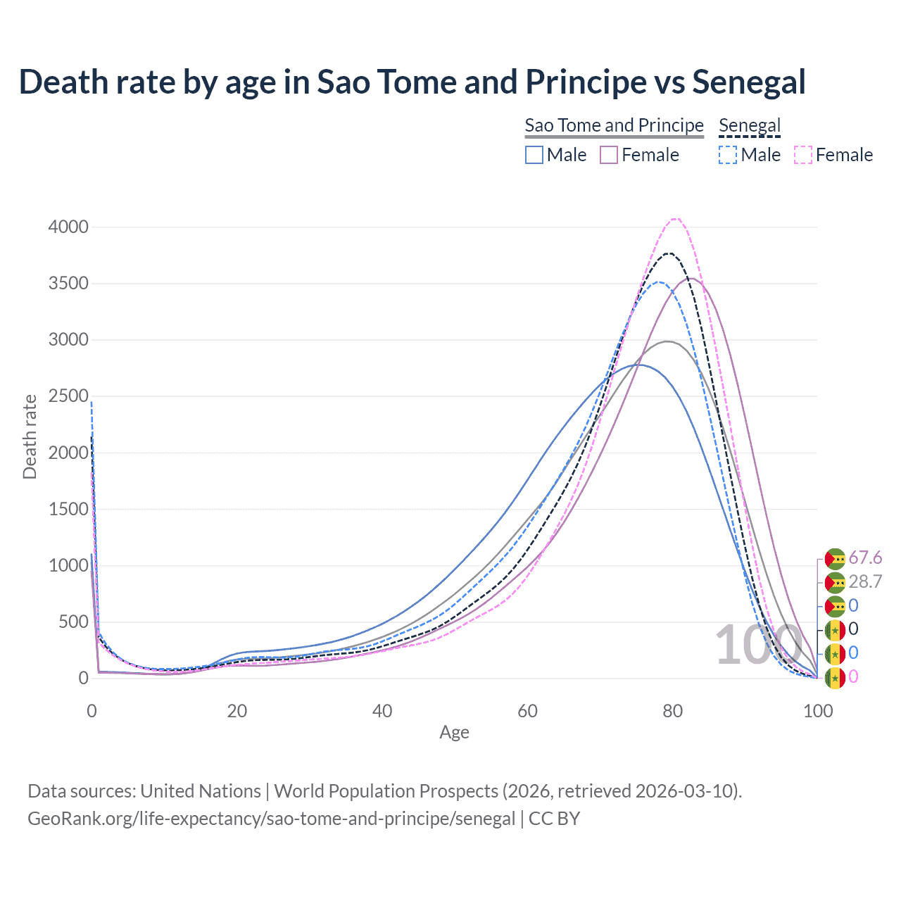 In Sao Tome and Principe, the most common age of death is 79, compared to 80 in Senegal. The median age of death is 74.1 in Sao Tome and Principe and 75 in Senegal, meaning only half of each cohort is expected to live past that age.