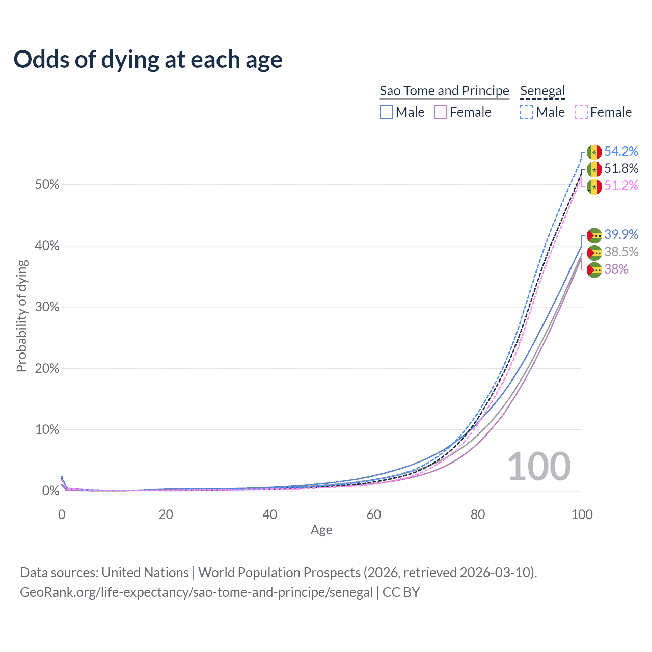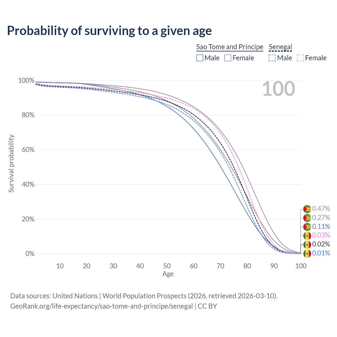 This life expectancy calculator shows the odds of living to 100, 95, 90, and below based on current age for both males and females in Sao Tome and Principe and Senegal, along with mean and median age of death. The calculations are based on the 2026 life tables (actuarial tables) from the UN World Population Prospects.
