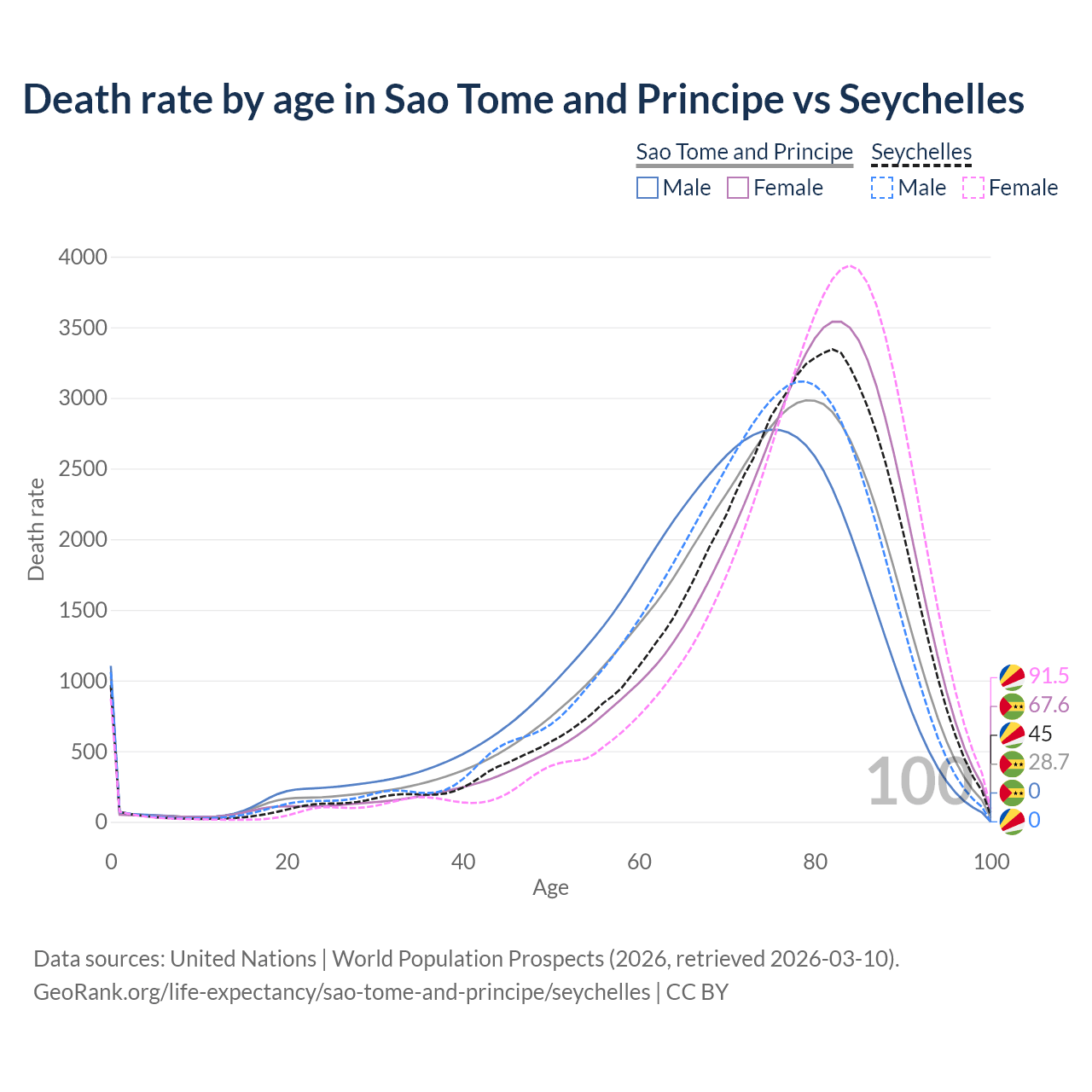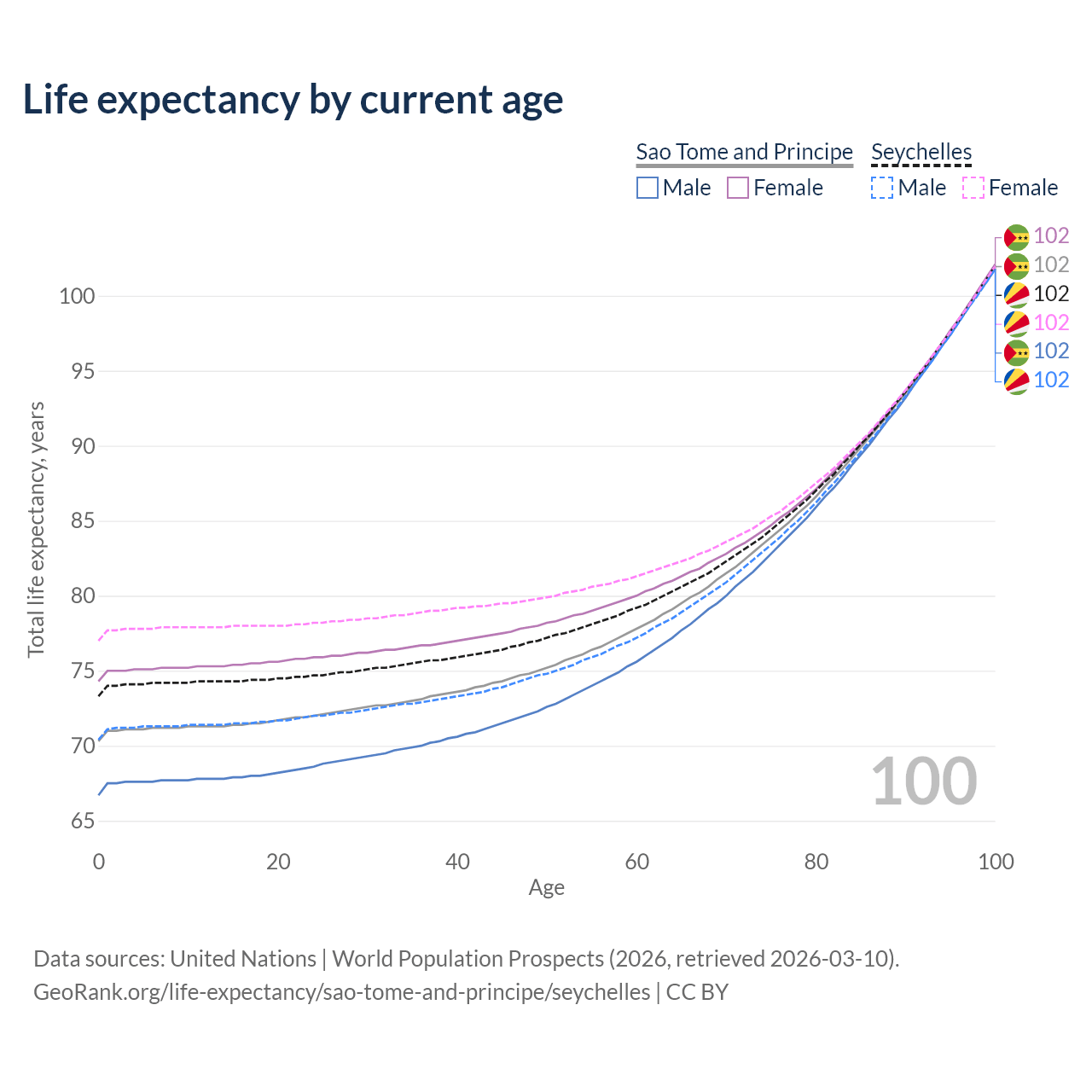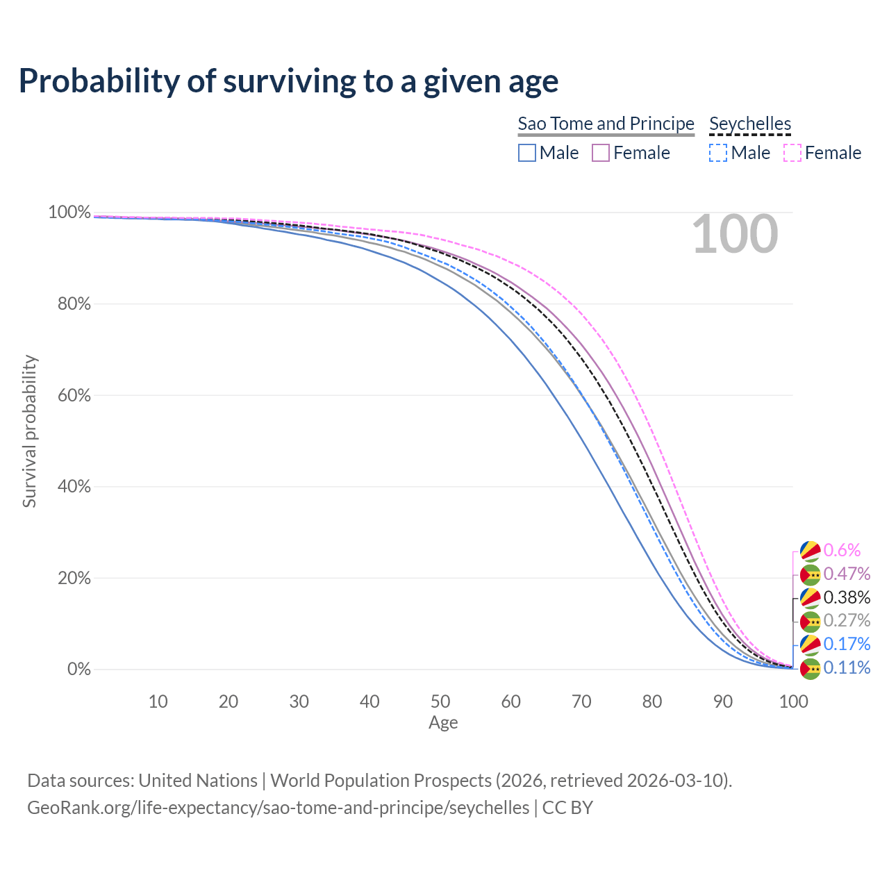 This life expectancy calculator shows the odds of living to 100, 95, 90, and below based on current age for both males and females in Sao Tome and Principe and the Seychelles, along with mean and median age of death. The calculations are based on the 2026 life tables (actuarial tables) from the UN World Population Prospects.