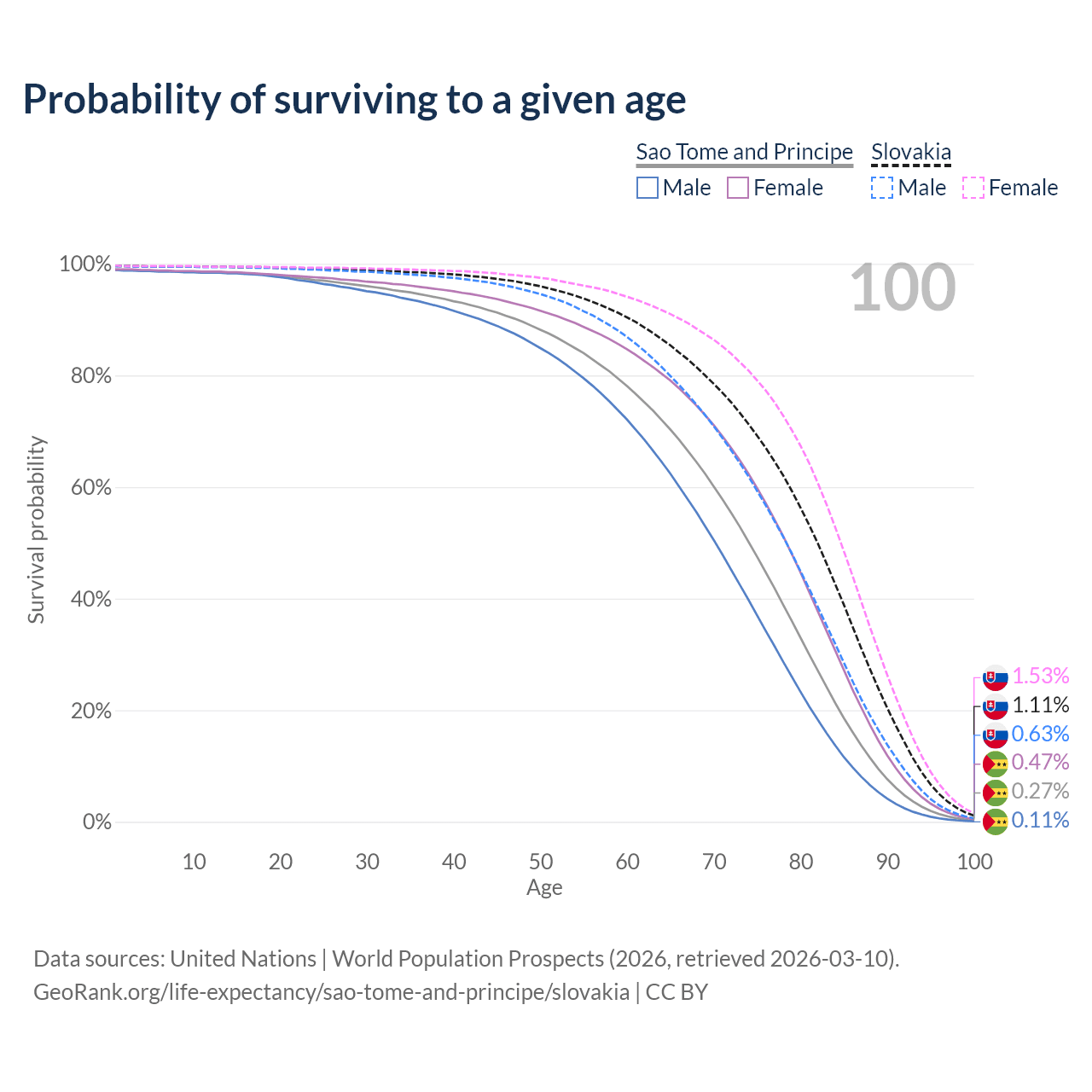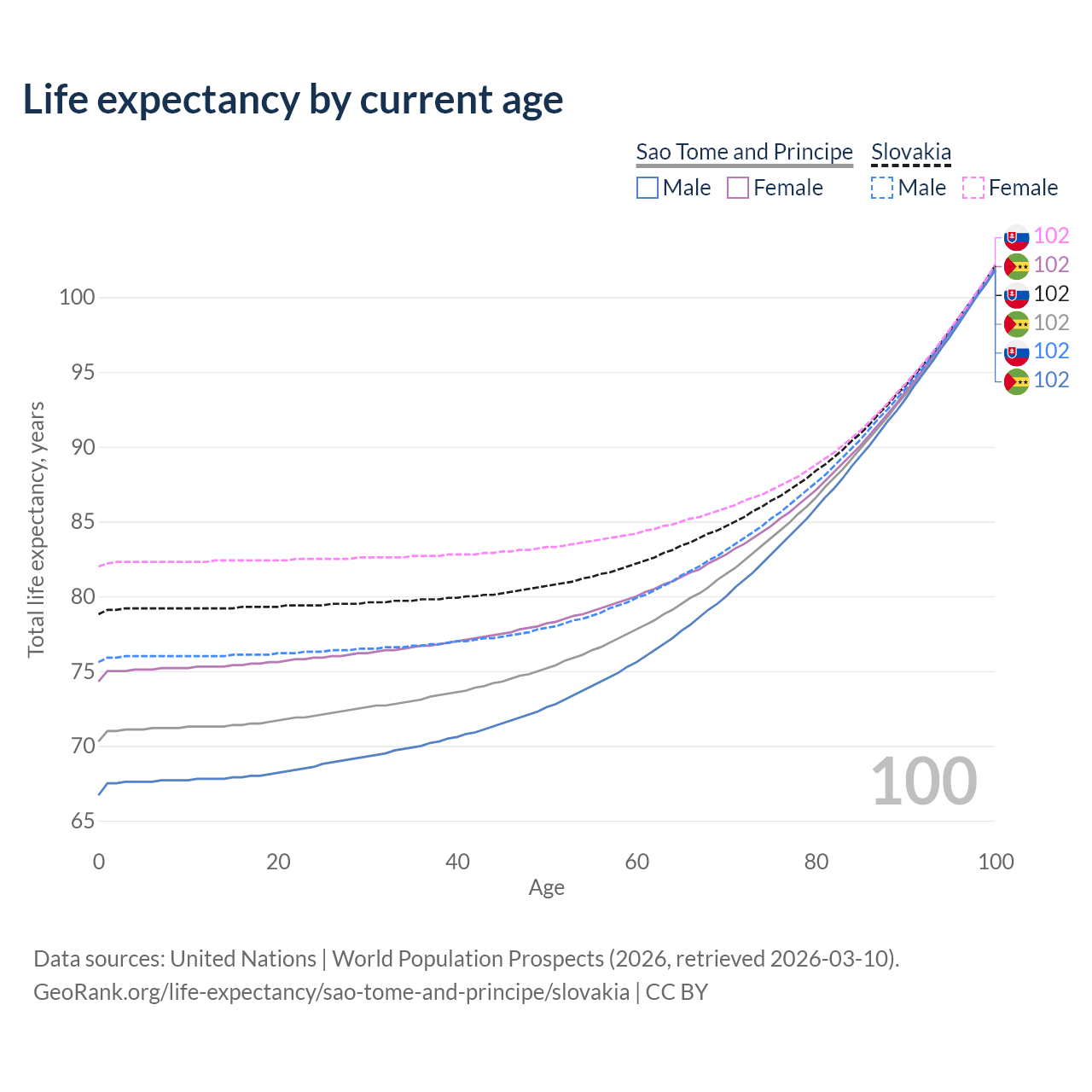 This life expectancy calculator shows the odds of living to 100, 95, 90, and below based on current age for both males and females in Sao Tome and Principe and Slovakia, along with mean and median age of death. The calculations are based on the 2026 life tables (actuarial tables) from the UN World Population Prospects.