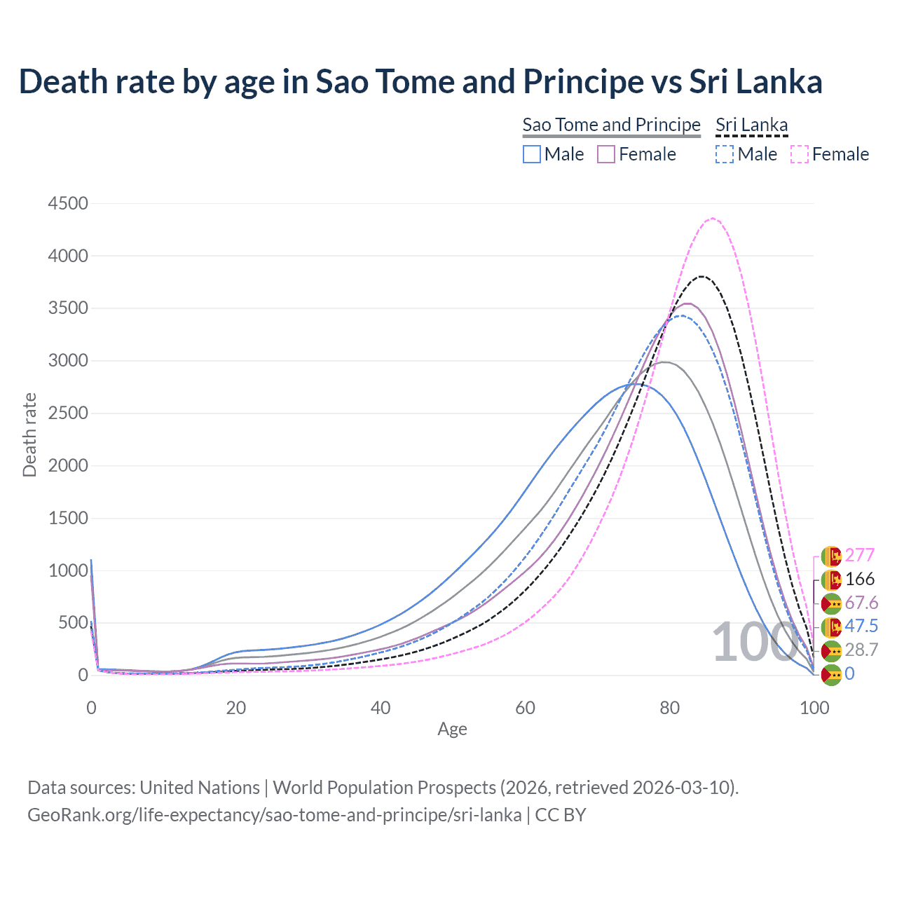 In Sao Tome and Principe, the most common age of death is 79, compared to 85 in Sri Lanka. The median age of death is 74.1 in Sao Tome and Principe and 81 in Sri Lanka, meaning only half of each cohort is expected to live past that age.
