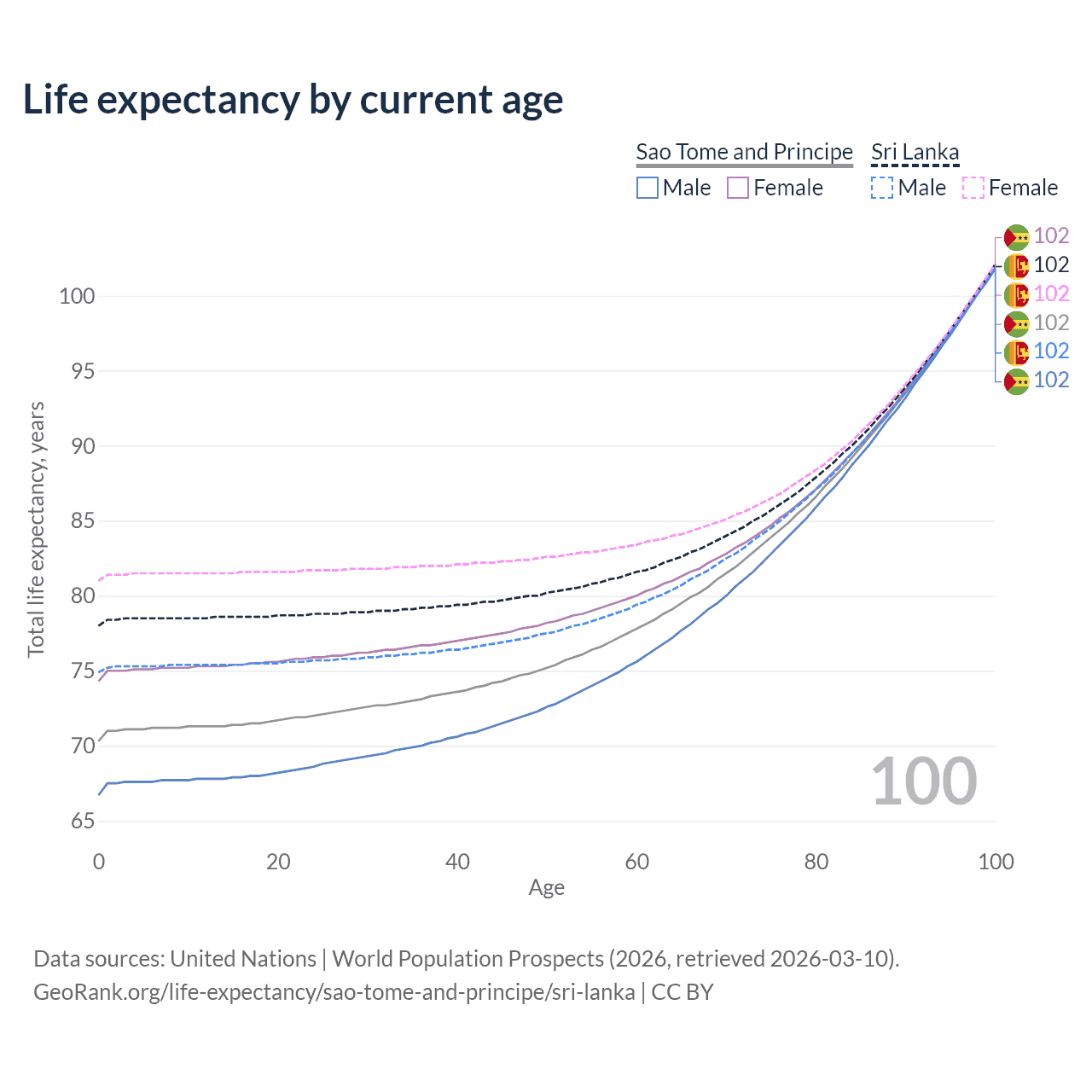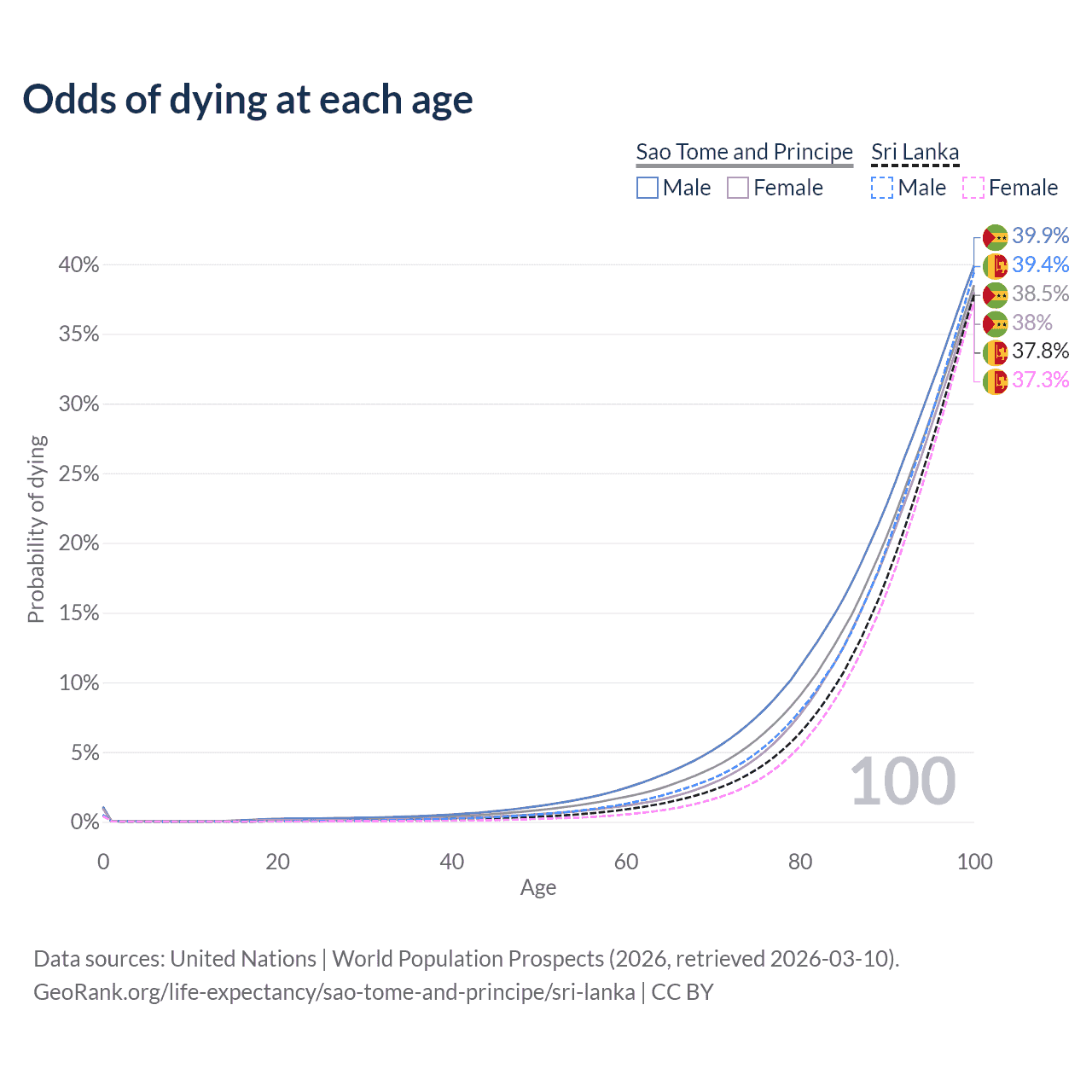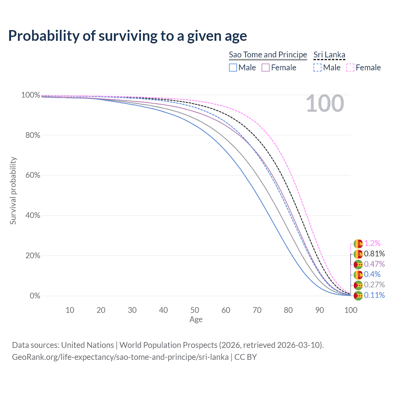 This life expectancy calculator shows the odds of living to 100, 95, 90, and below based on current age for both males and females in Sao Tome and Principe and Sri Lanka, along with mean and median age of death. The calculations are based on the 2026 life tables (actuarial tables) from the UN World Population Prospects.