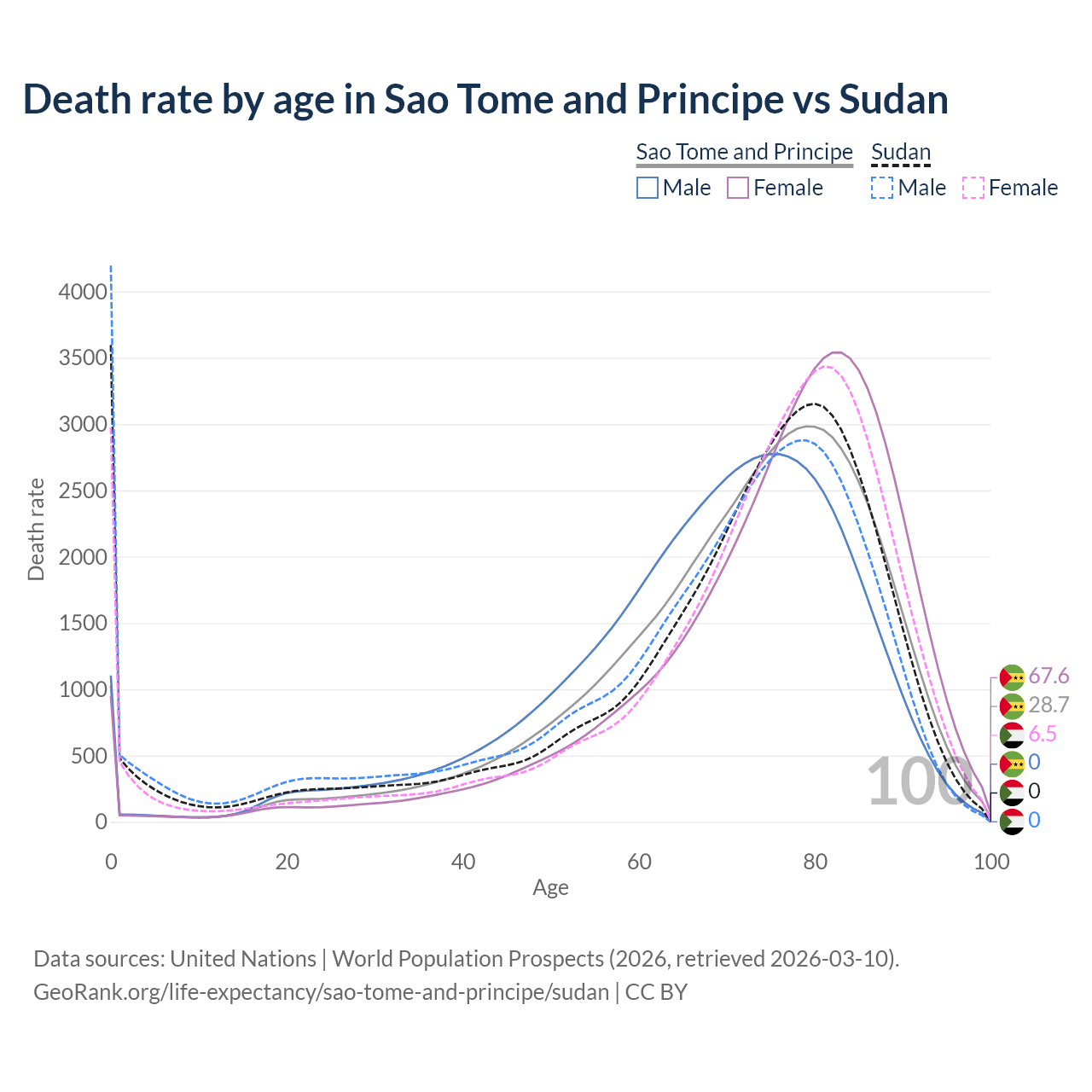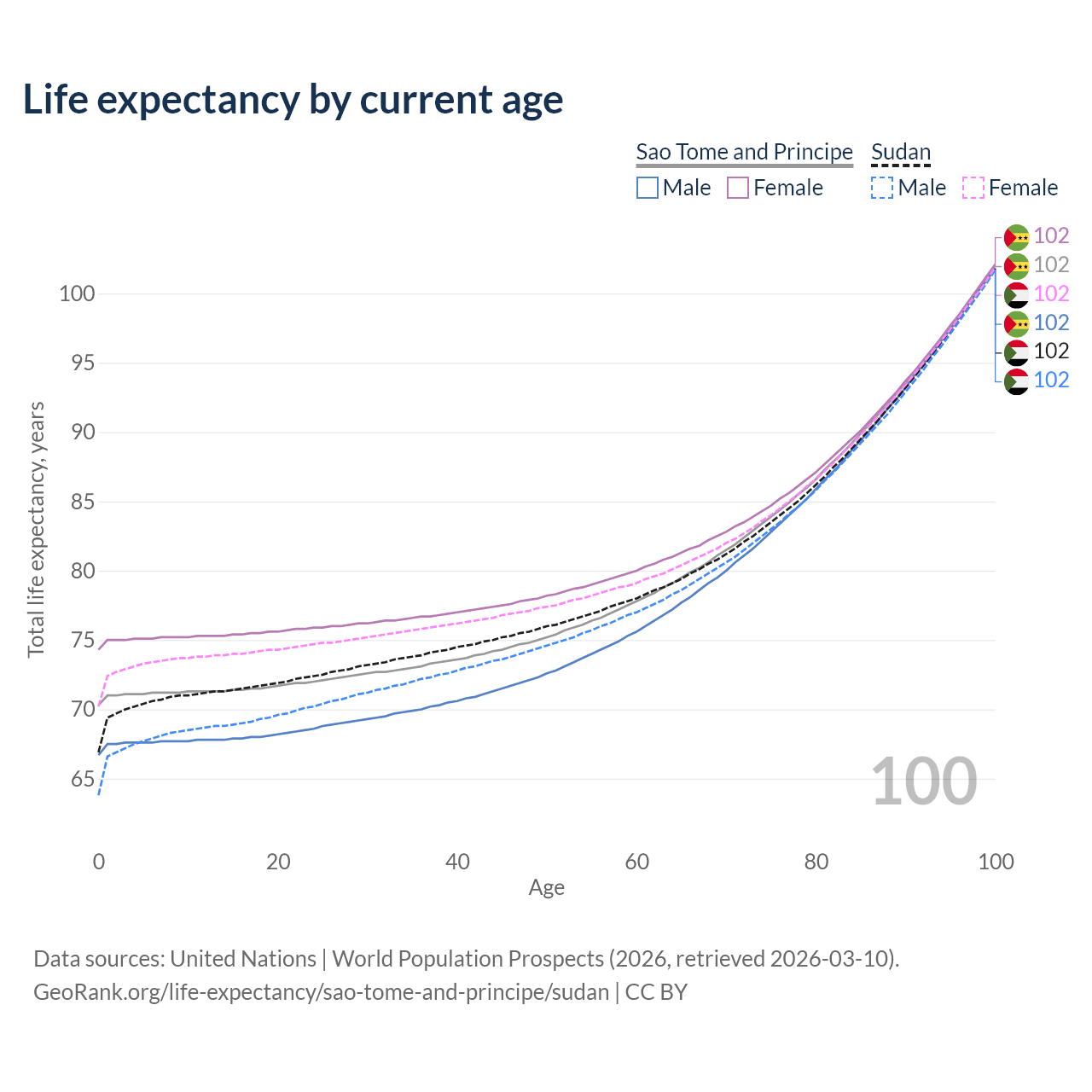 This life expectancy calculator shows the odds of living to 100, 95, 90, and below based on current age for both males and females in Sao Tome and Principe and Sudan, along with mean and median age of death. The calculations are based on the 2026 life tables (actuarial tables) from the UN World Population Prospects.