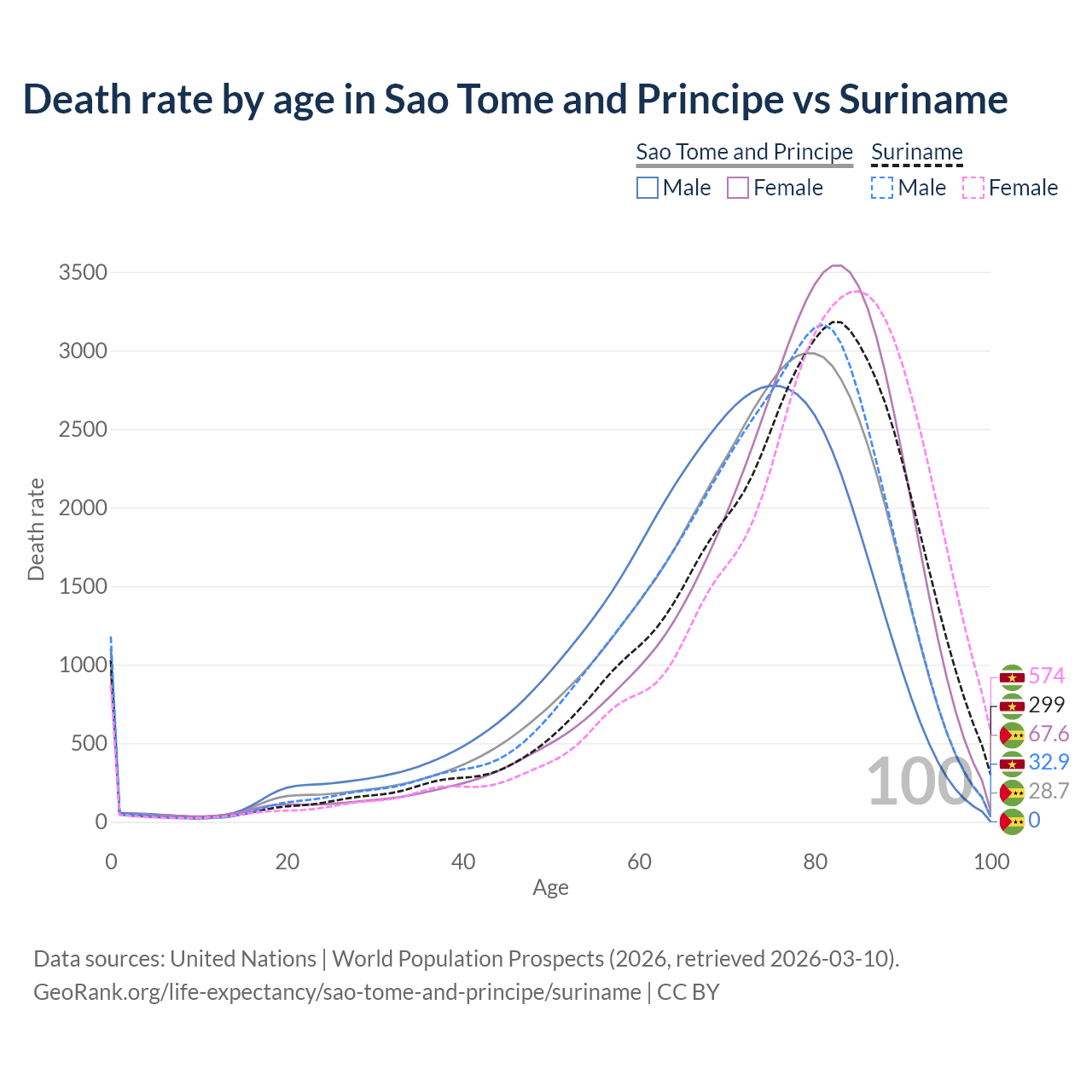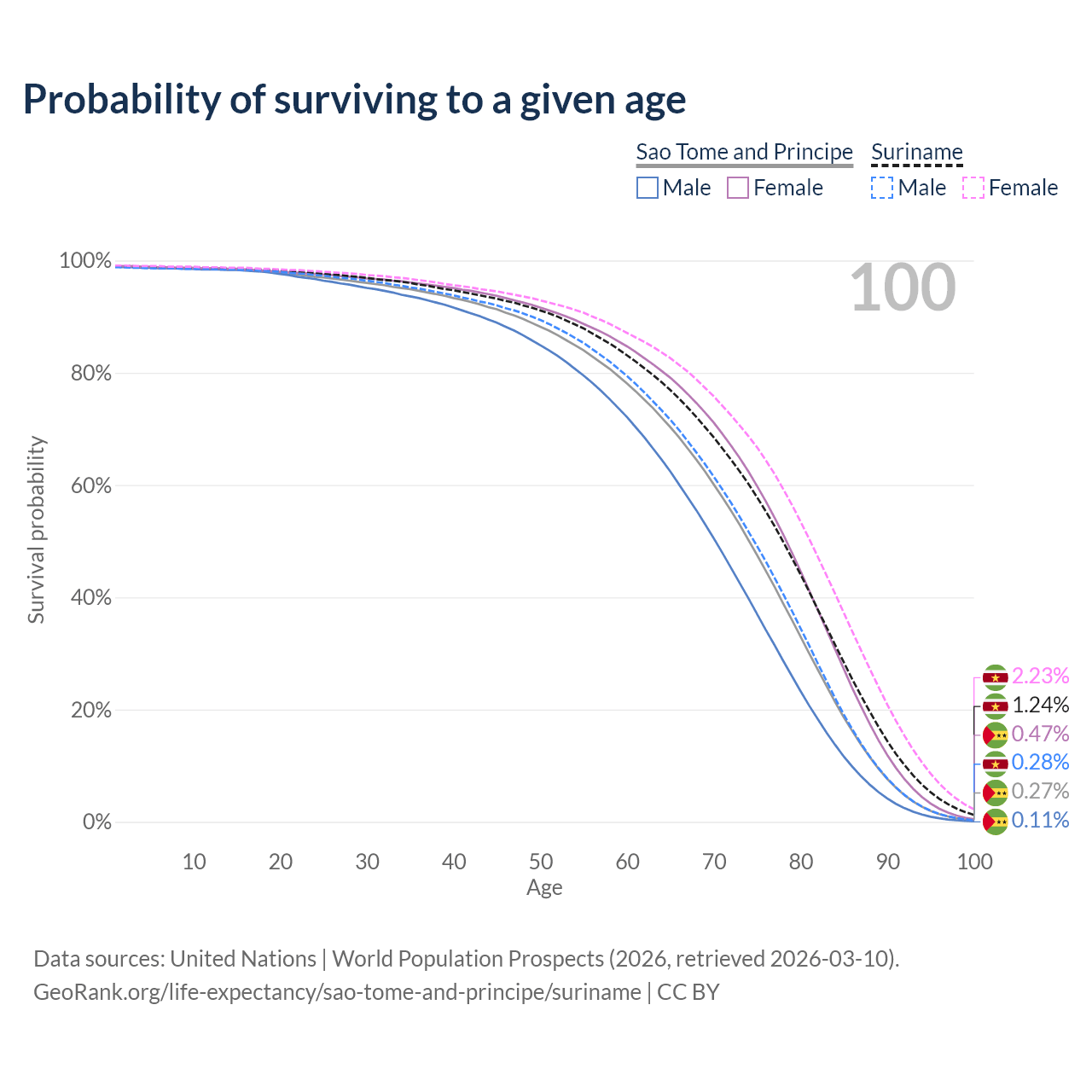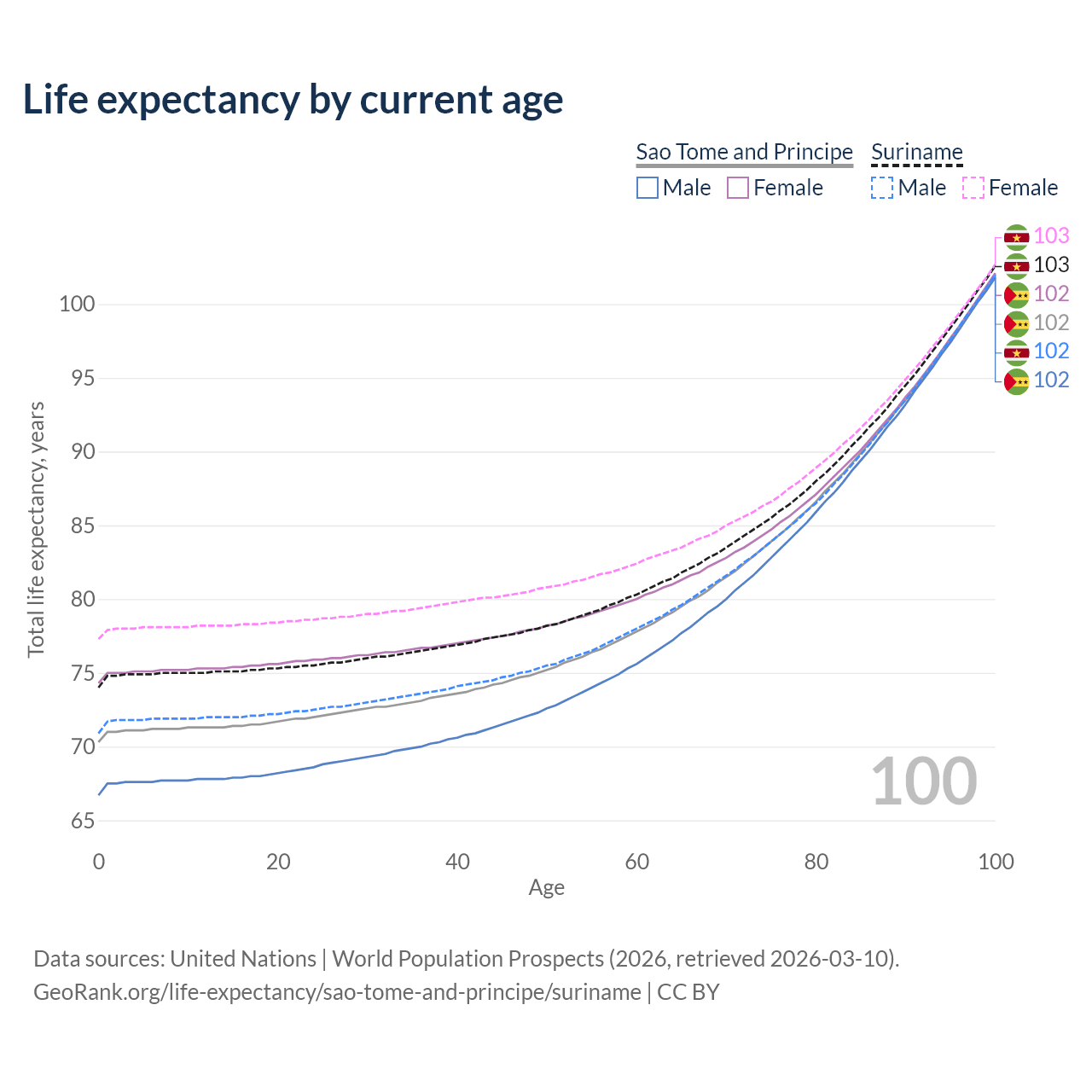 This life expectancy calculator shows the odds of living to 100, 95, 90, and below based on current age for both males and females in Sao Tome and Principe and Suriname, along with mean and median age of death. The calculations are based on the 2026 life tables (actuarial tables) from the UN World Population Prospects.