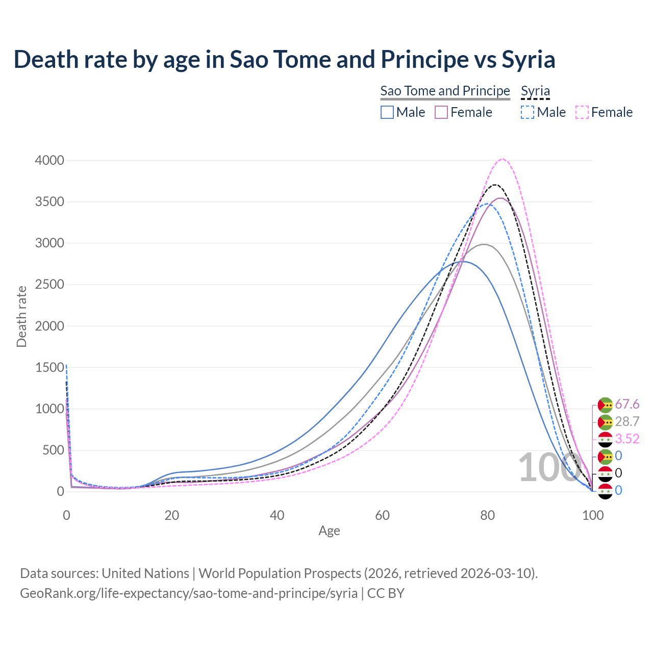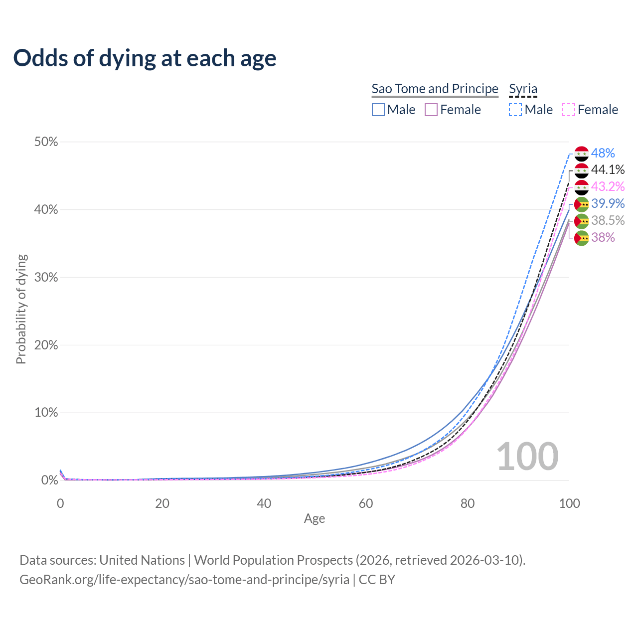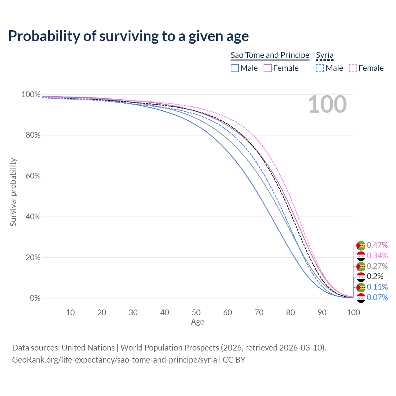 This life expectancy calculator shows the odds of living to 100, 95, 90, and below based on current age for both males and females in Sao Tome and Principe and Syria, along with mean and median age of death. The calculations are based on the 2026 life tables (actuarial tables) from the UN World Population Prospects.