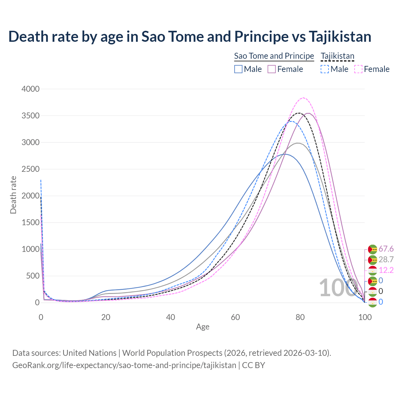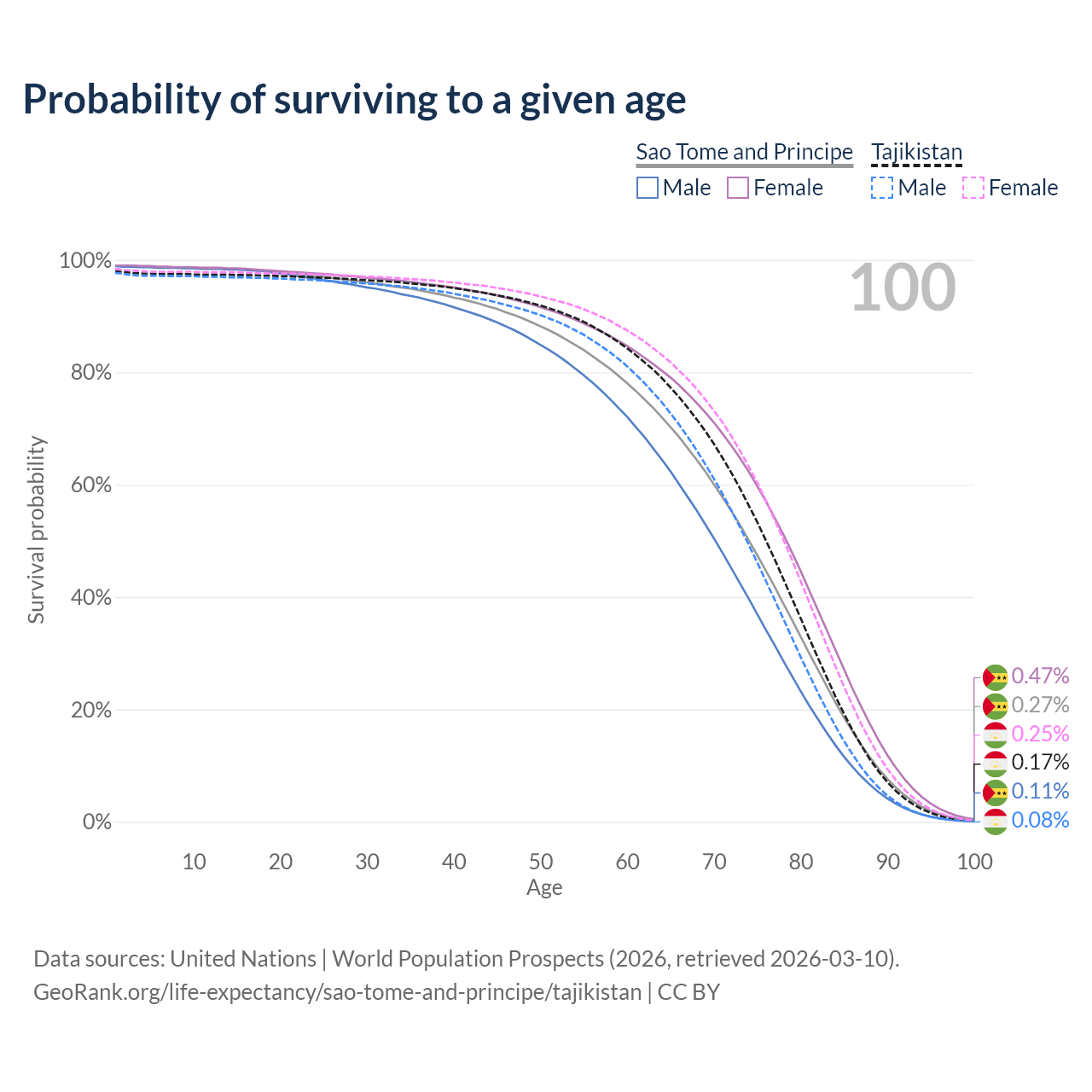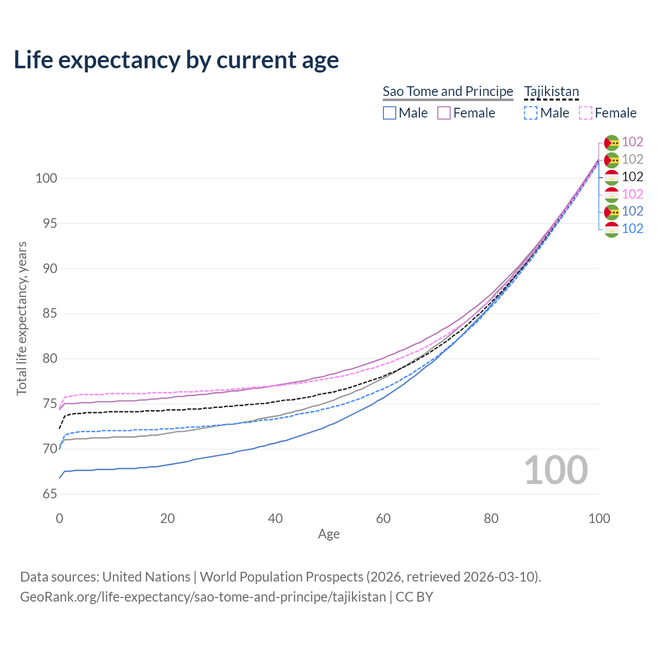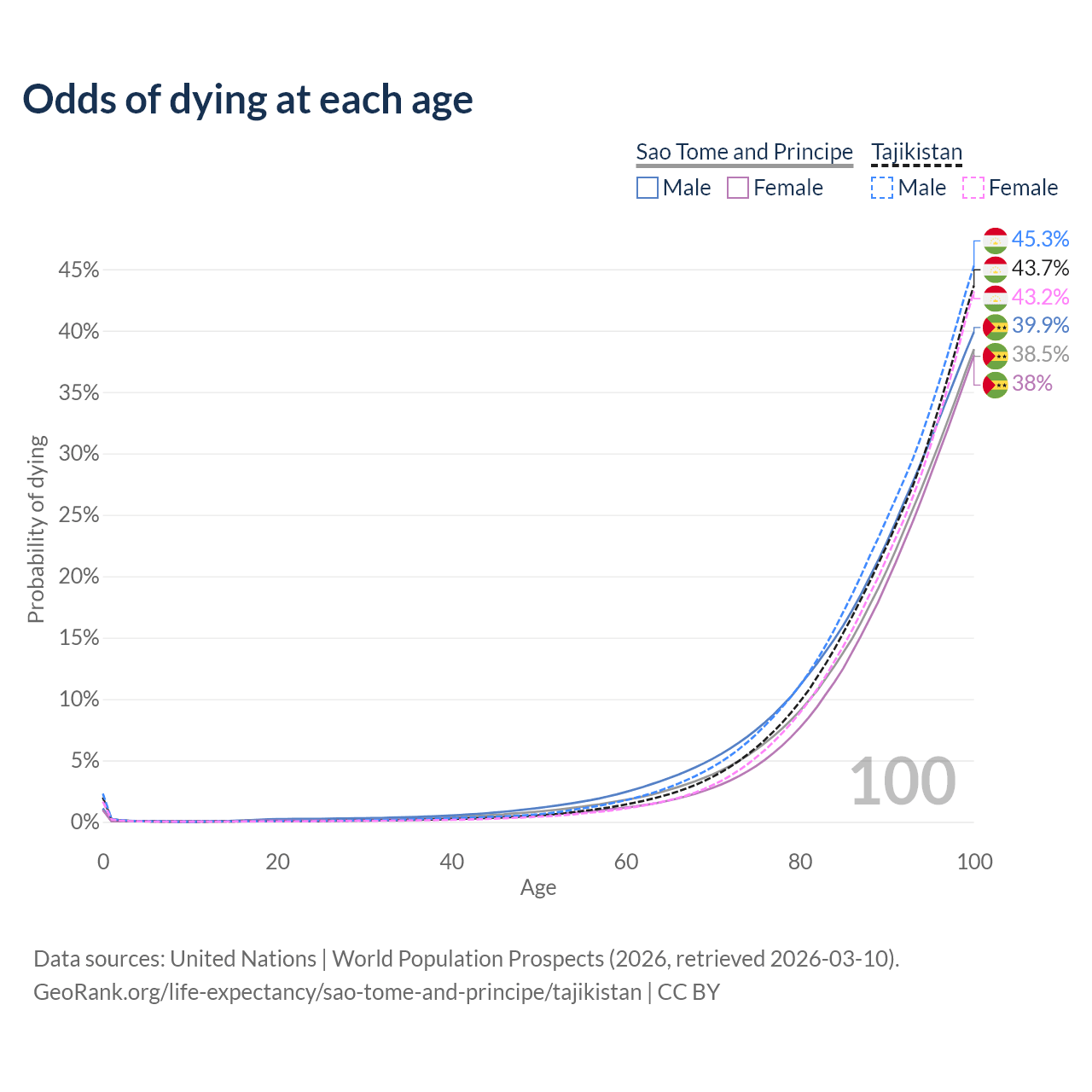 This life expectancy calculator shows the odds of living to 100, 95, 90, and below based on current age for both males and females in Sao Tome and Principe and Tajikistan, along with mean and median age of death. The calculations are based on the 2026 life tables (actuarial tables) from the UN World Population Prospects.