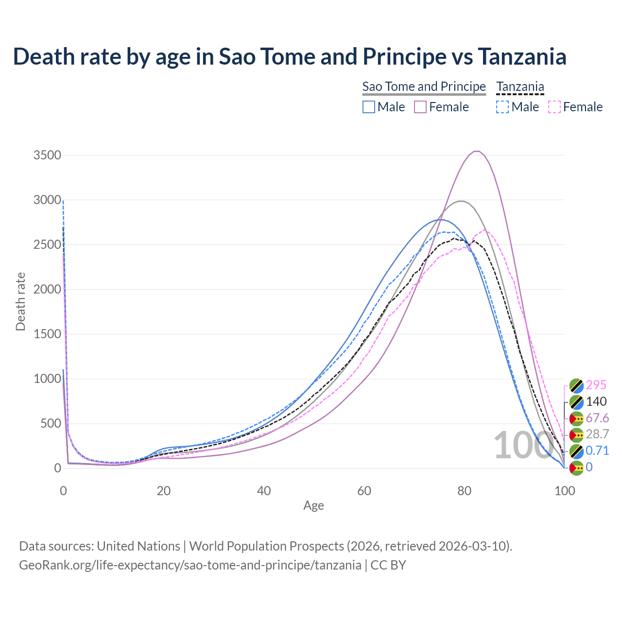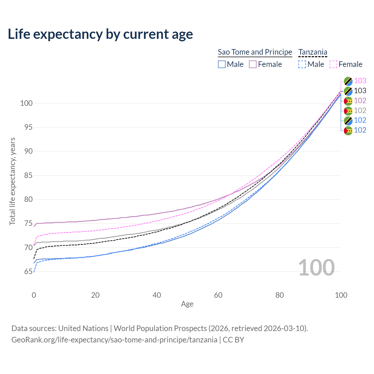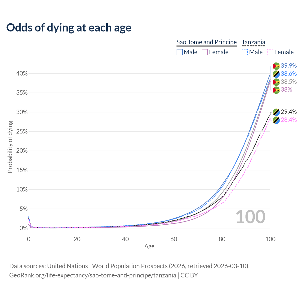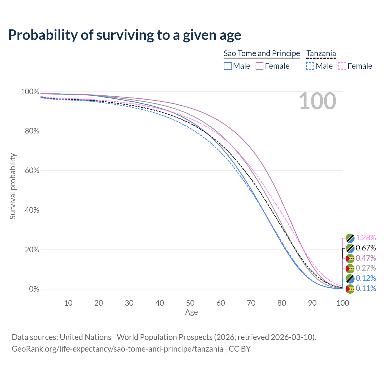 This life expectancy calculator shows the odds of living to 100, 95, 90, and below based on current age for both males and females in Sao Tome and Principe and Tanzania, along with mean and median age of death. The calculations are based on the 2026 life tables (actuarial tables) from the UN World Population Prospects.