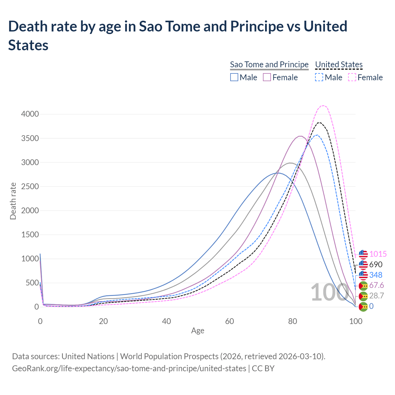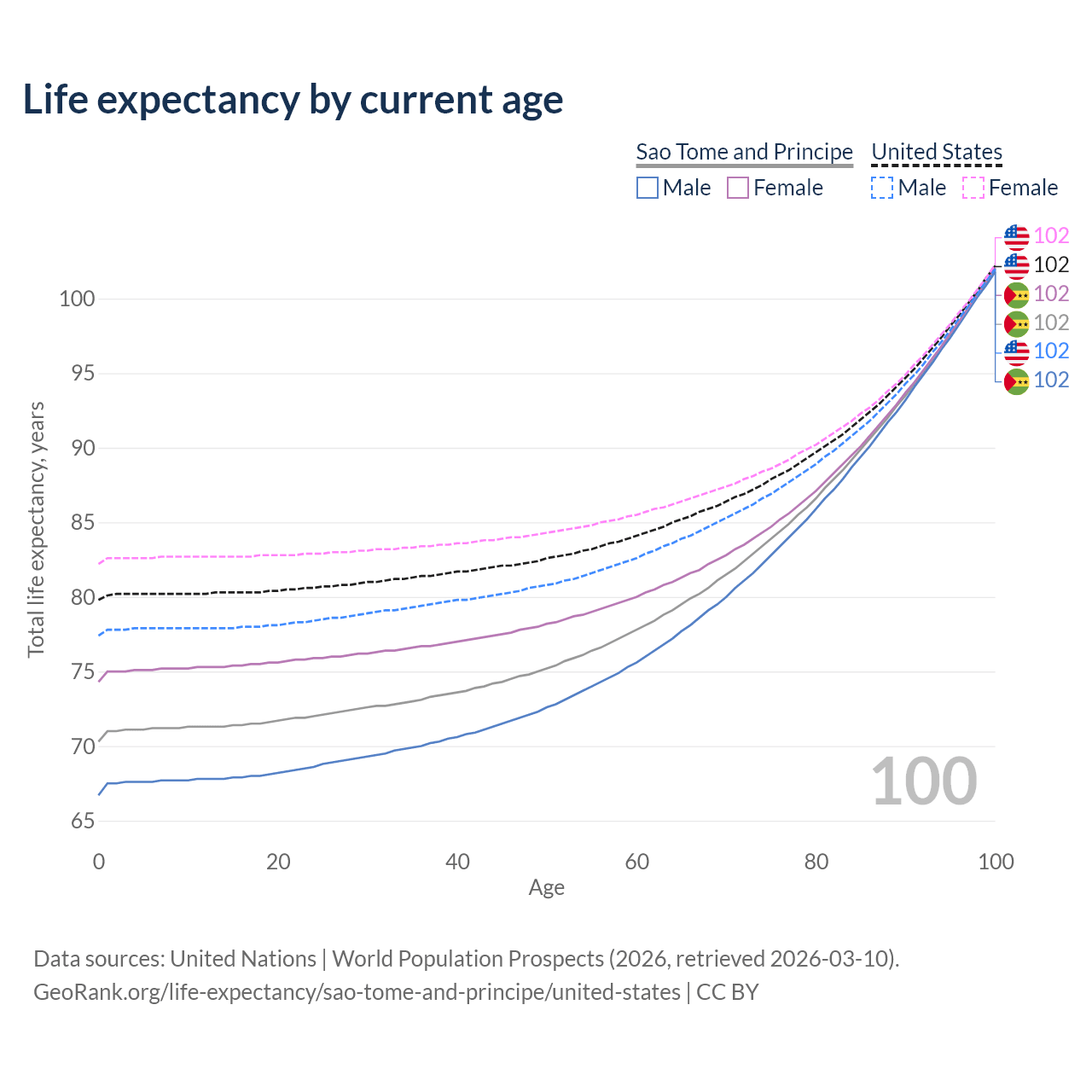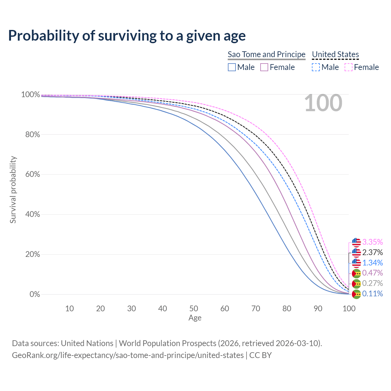 This life expectancy calculator shows the odds of living to 100, 95, 90, and below based on current age for both males and females in Sao Tome and Principe and the United States, along with mean and median age of death. The calculations are based on the 2026 life tables (actuarial tables) from the UN World Population Prospects.