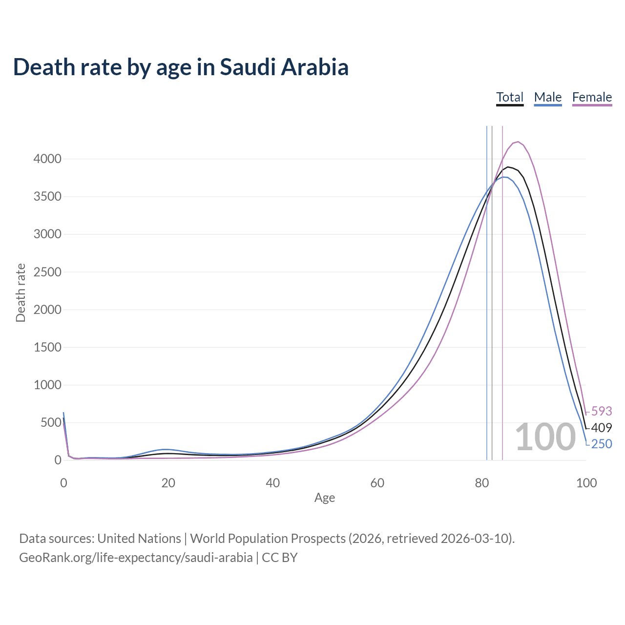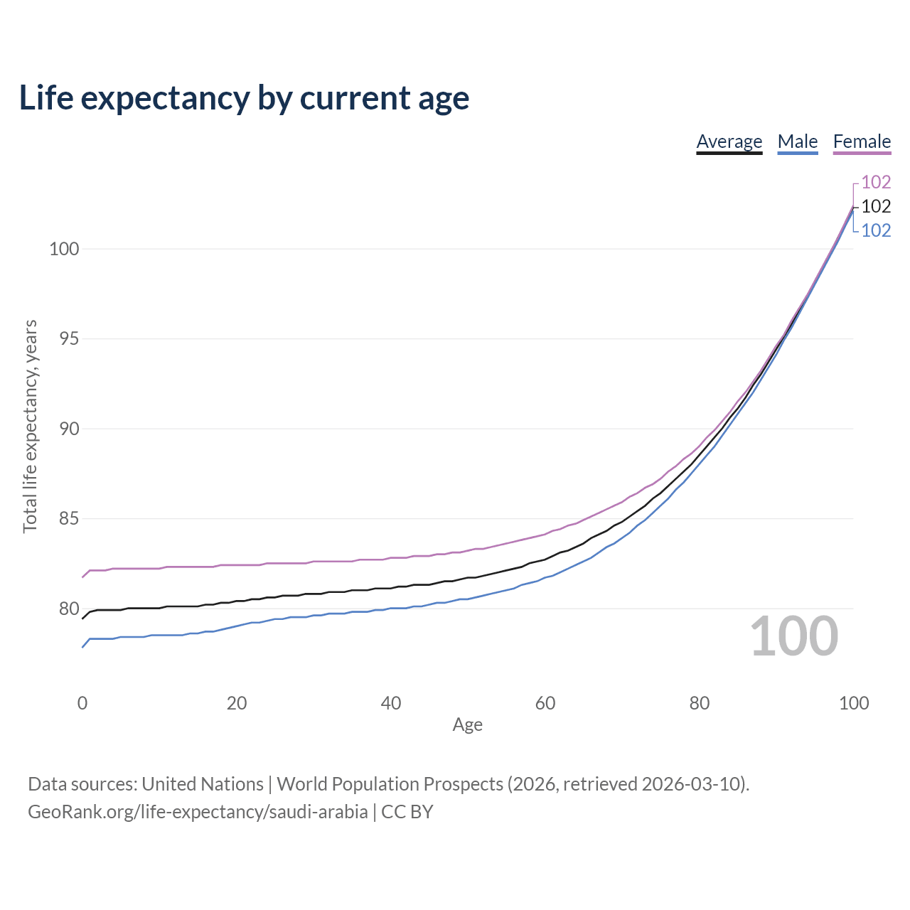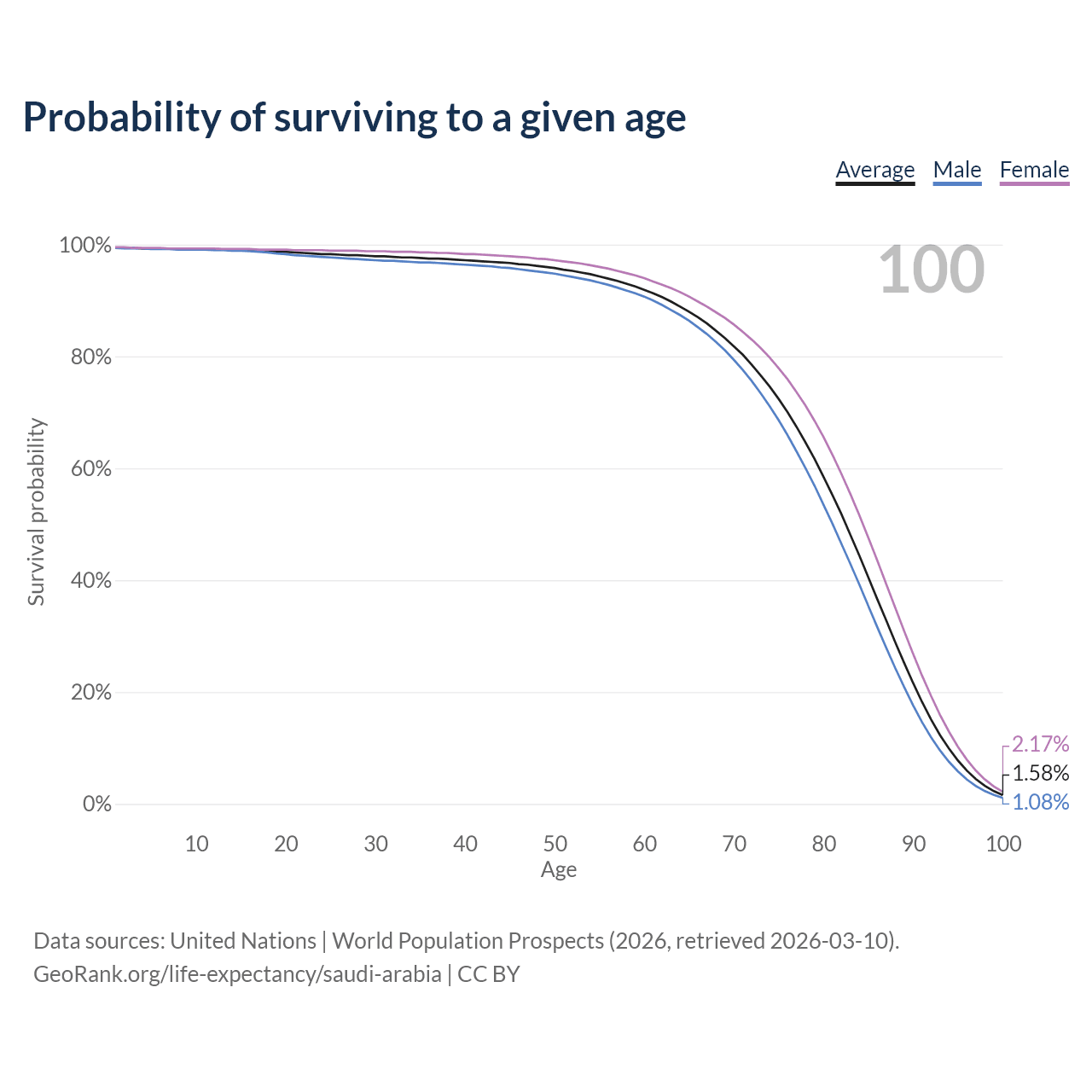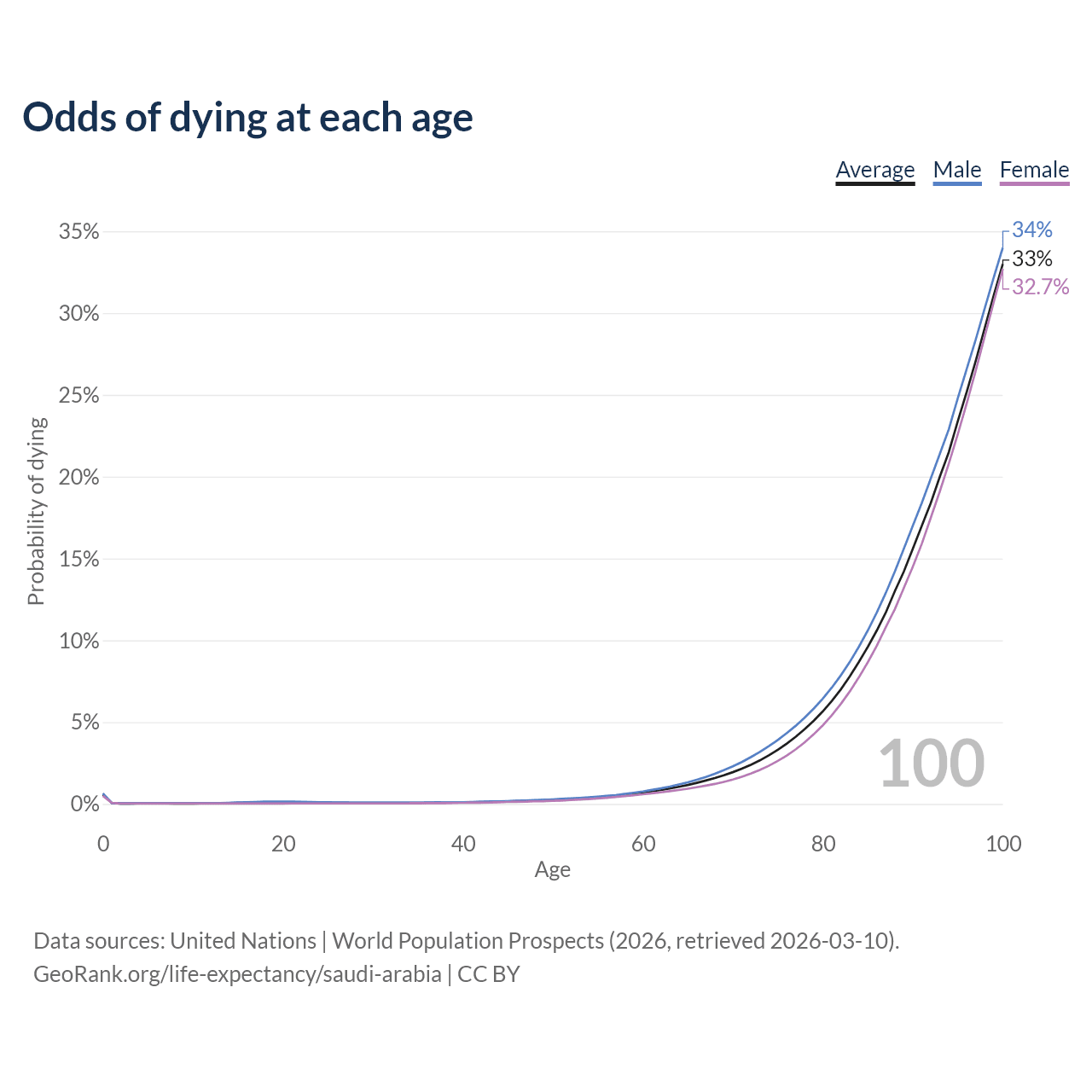 This life expectancy calculator shows the odds of living to 100, 95, 90, and below based on current age for both males and females in Saudi Arabia, along with mean and median age of death. The calculations are based on the 2026 life tables (actuarial tables) from the UN World Population Prospects.