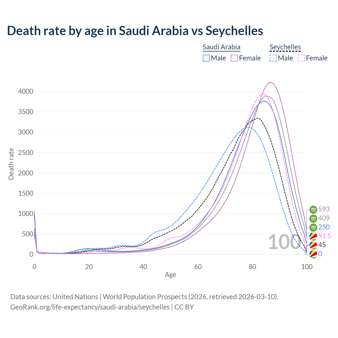 In Saudi Arabia, the most common age of death is 85, compared to 82 in the Seychelles. The median age of death is 82.5 in Saudi Arabia and 77 in the Seychelles, meaning only half of each cohort is expected to live past that age.