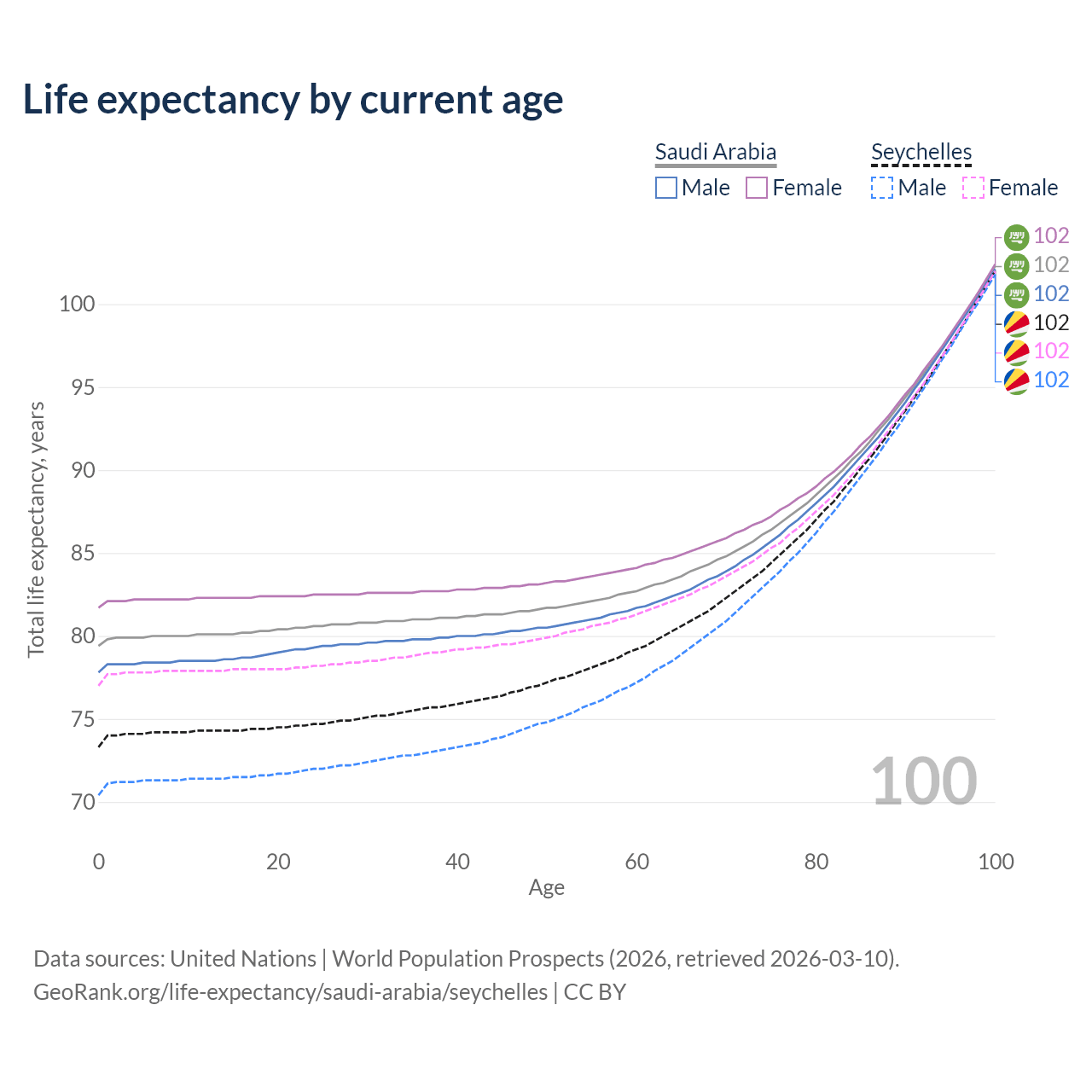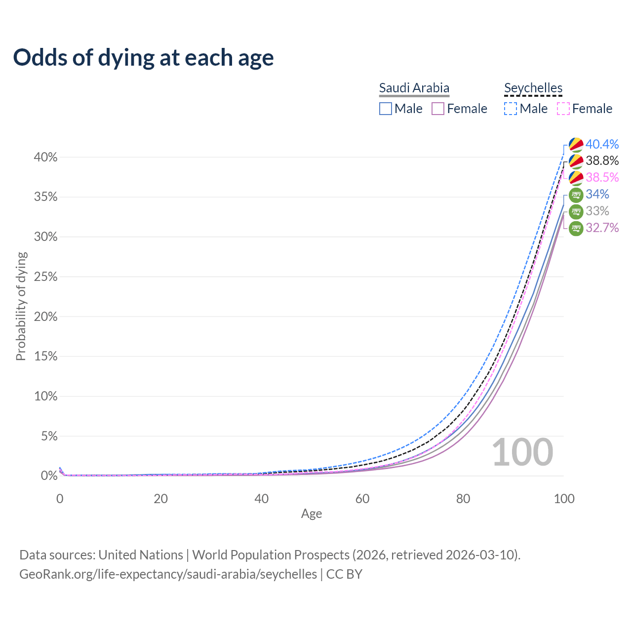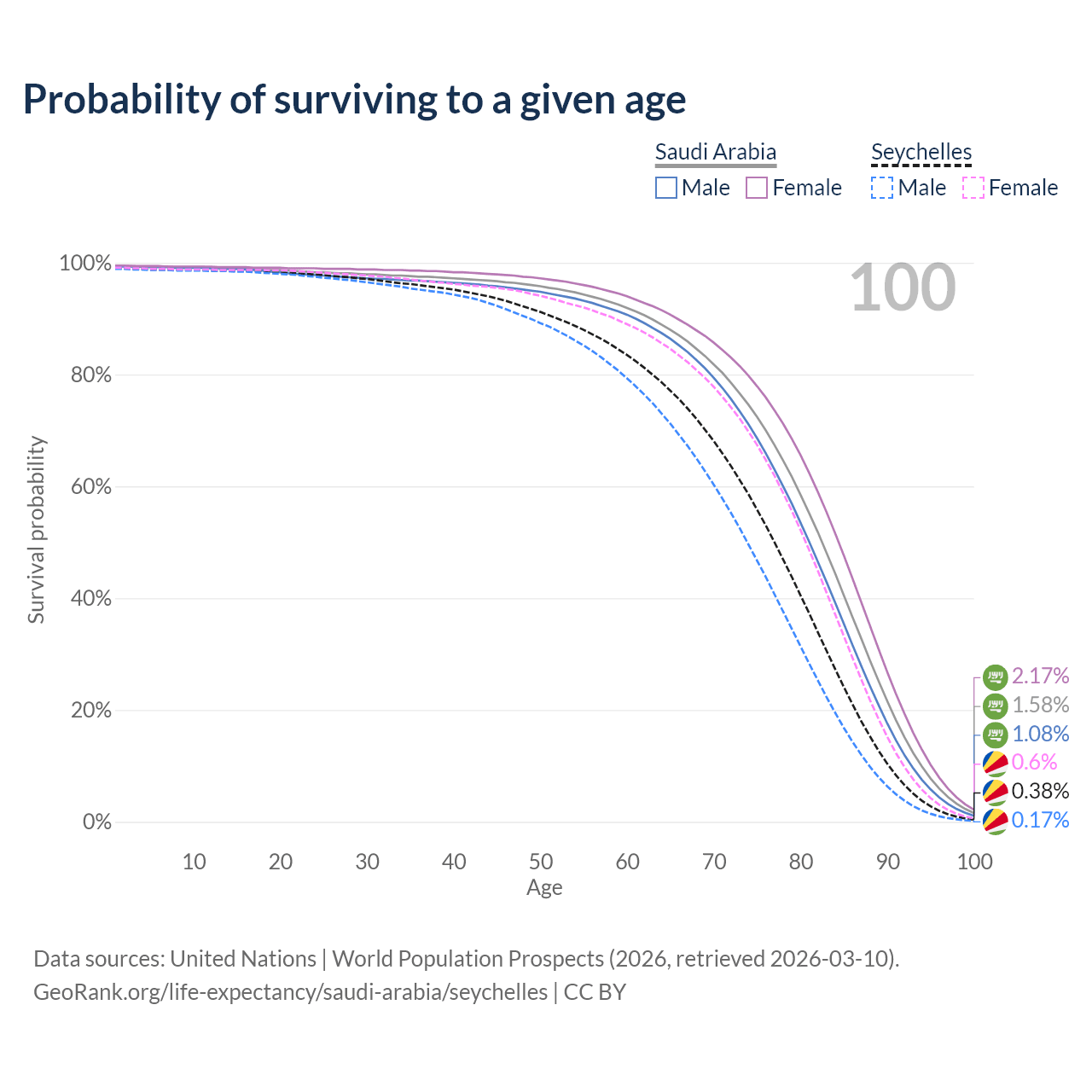This life expectancy calculator shows the odds of living to 100, 95, 90, and below based on current age for both males and females in Saudi Arabia and the Seychelles, along with mean and median age of death. The calculations are based on the 2026 life tables (actuarial tables) from the UN World Population Prospects.