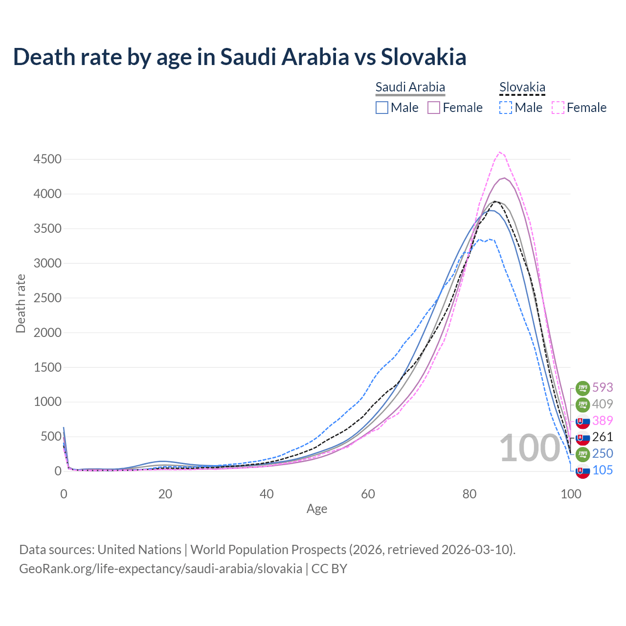 In Saudi Arabia, the most common age of death is 85, compared to 85 in Slovakia. The median age of death is 82.5 in Saudi Arabia and 82 in Slovakia, meaning only half of each cohort is expected to live past that age.