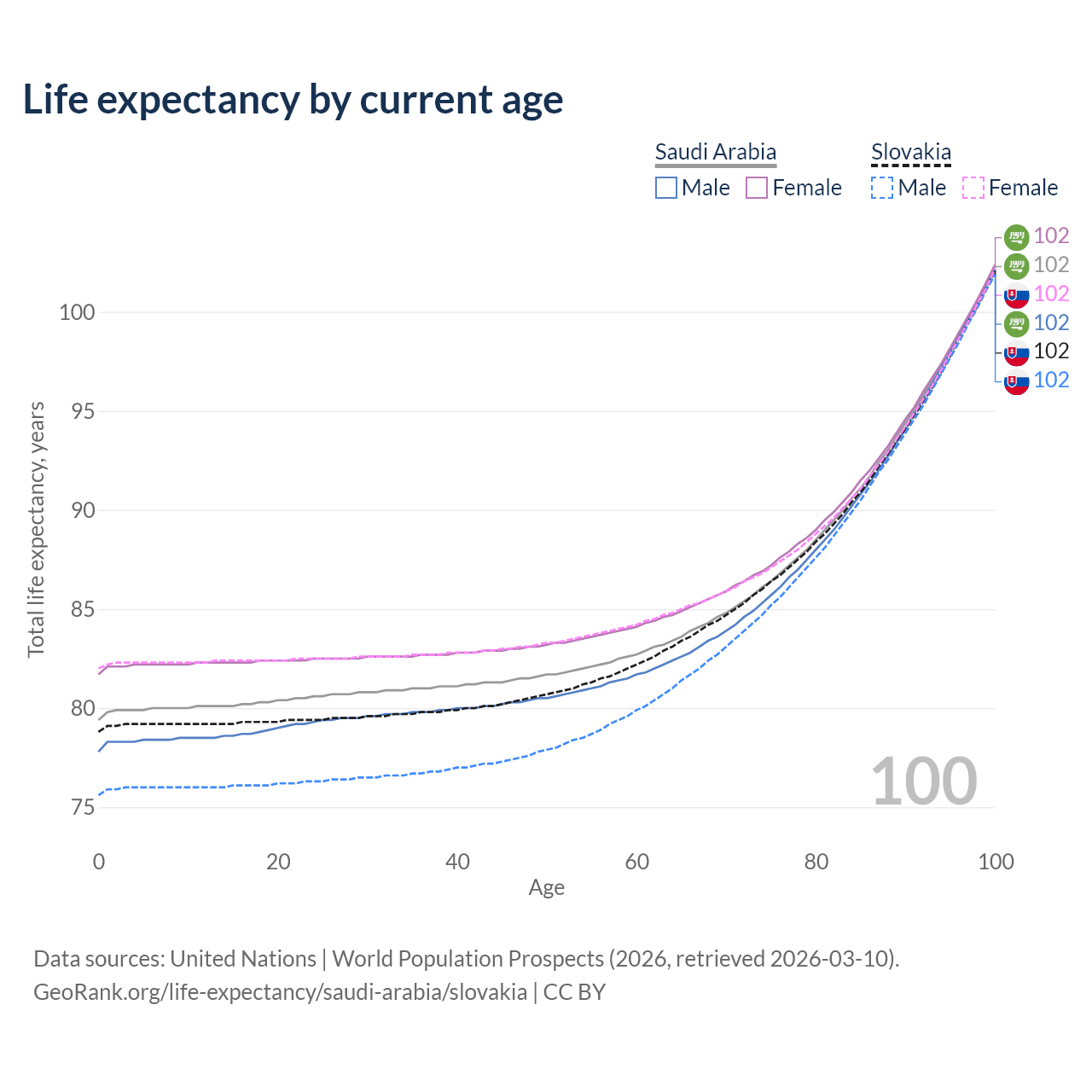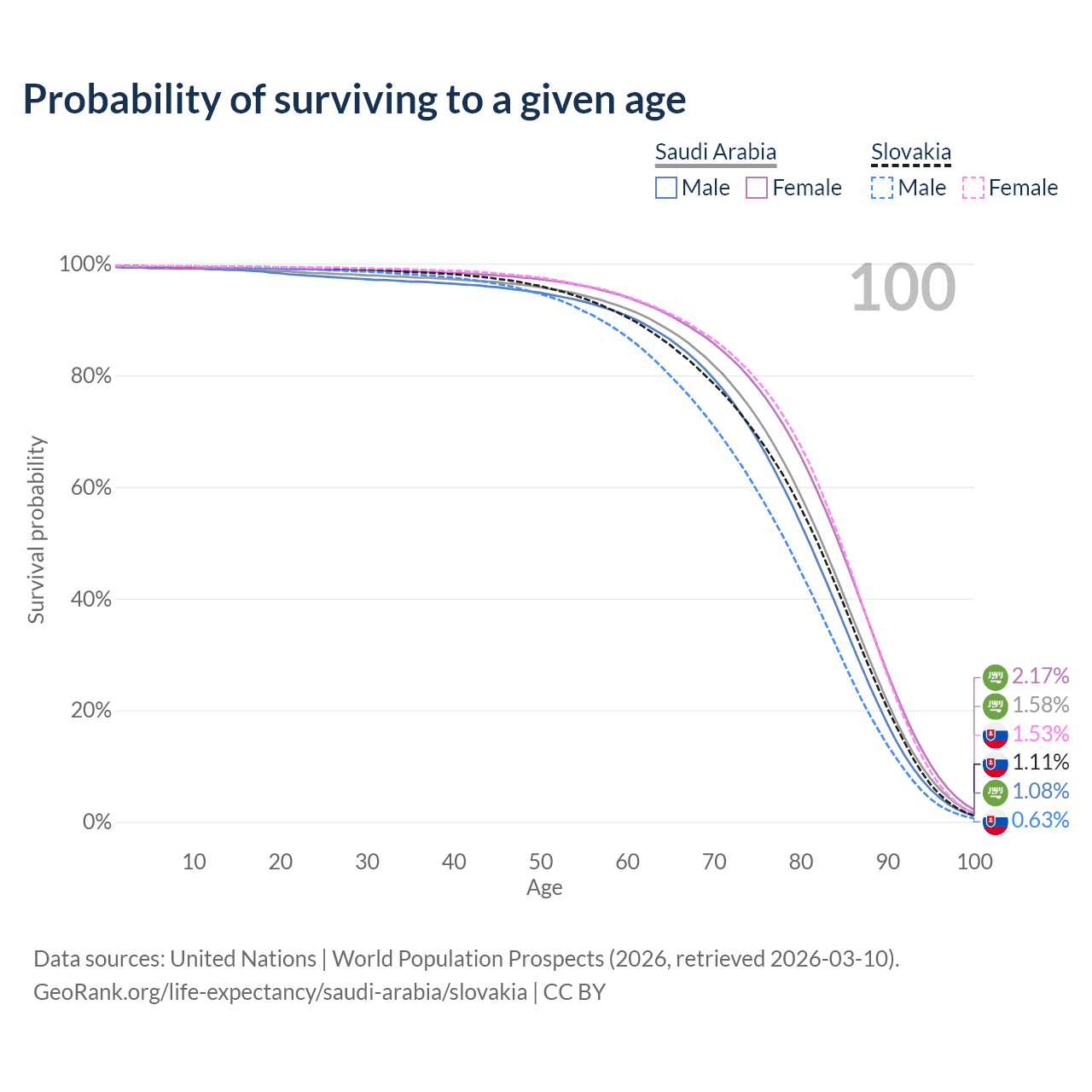 This life expectancy calculator shows the odds of living to 100, 95, 90, and below based on current age for both males and females in Saudi Arabia and Slovakia, along with mean and median age of death. The calculations are based on the 2026 life tables (actuarial tables) from the UN World Population Prospects.