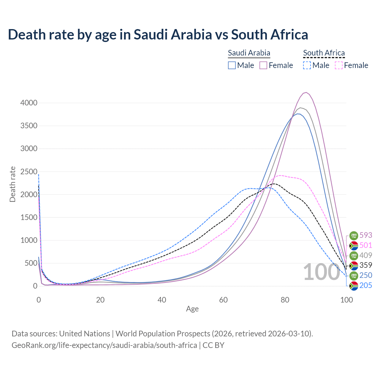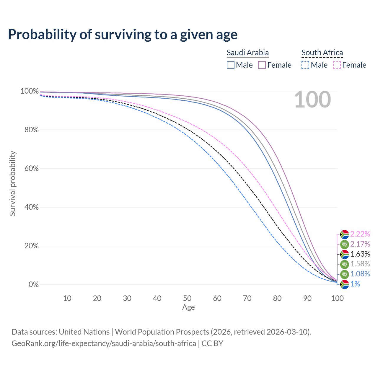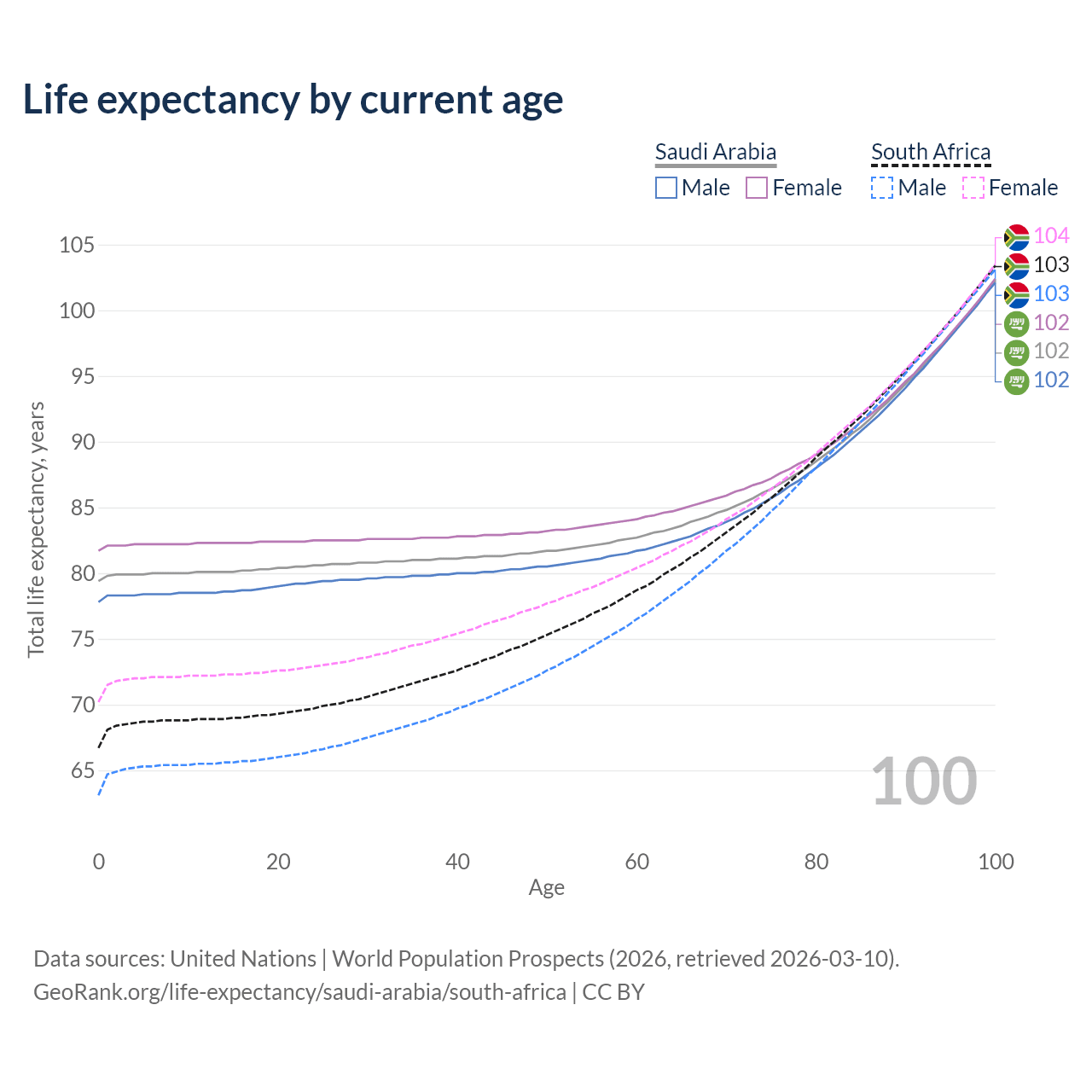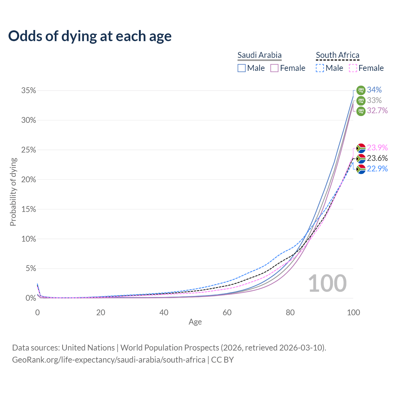 This life expectancy calculator shows the odds of living to 100, 95, 90, and below based on current age for both males and females in Saudi Arabia and South Africa, along with mean and median age of death. The calculations are based on the 2026 life tables (actuarial tables) from the UN World Population Prospects.