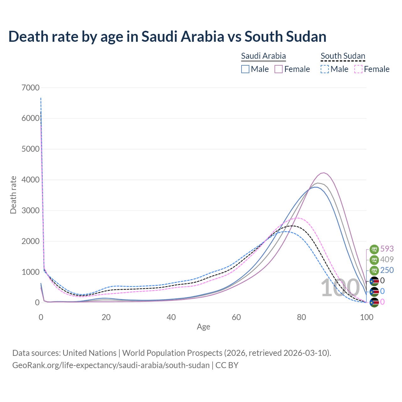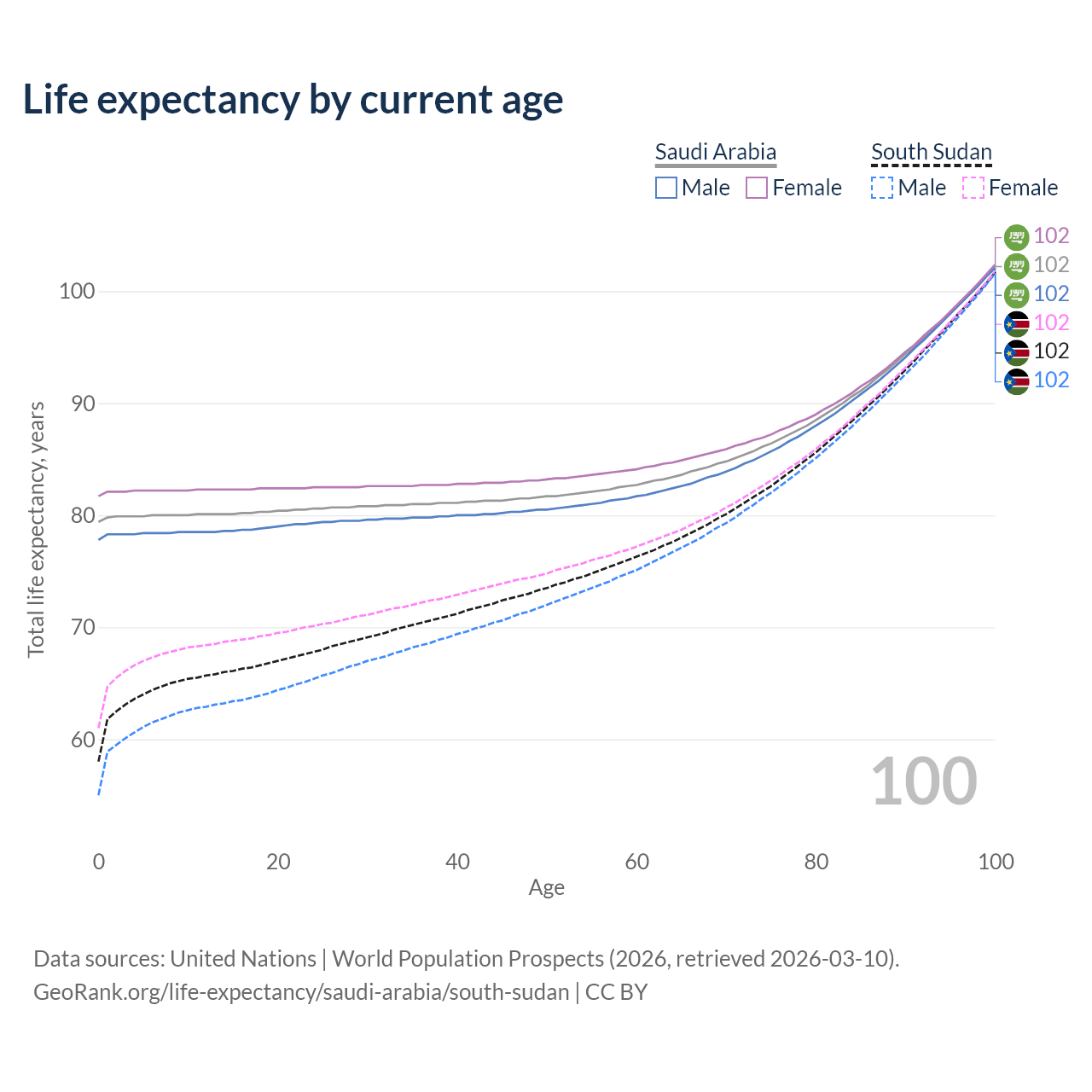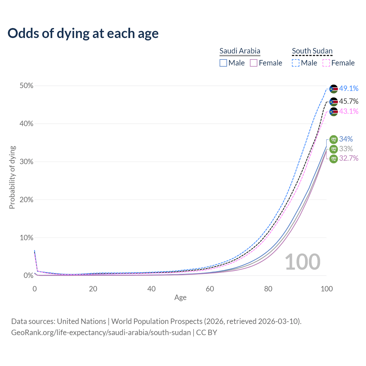 This life expectancy calculator shows the odds of living to 100, 95, 90, and below based on current age for both males and females in Saudi Arabia and South Sudan, along with mean and median age of death. The calculations are based on the 2026 life tables (actuarial tables) from the UN World Population Prospects.