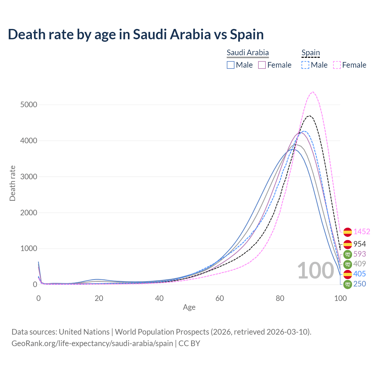 In Saudi Arabia, the most common age of death is 85, compared to 90 in Spain. The median age of death is 82.5 in Saudi Arabia and 87 in Spain, meaning only half of each cohort is expected to live past that age.