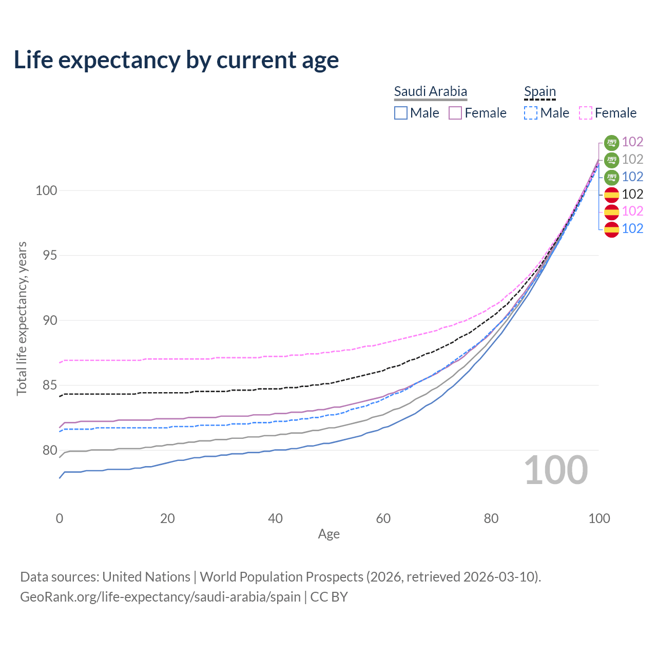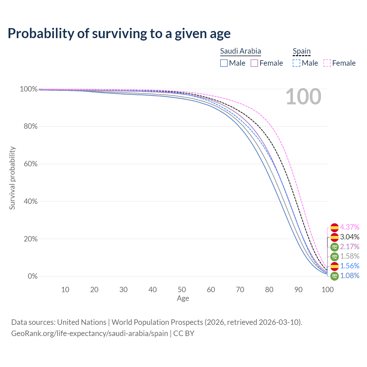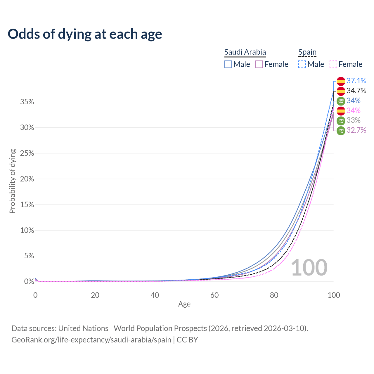 This life expectancy calculator shows the odds of living to 100, 95, 90, and below based on current age for both males and females in Saudi Arabia and Spain, along with mean and median age of death. The calculations are based on the 2026 life tables (actuarial tables) from the UN World Population Prospects.
