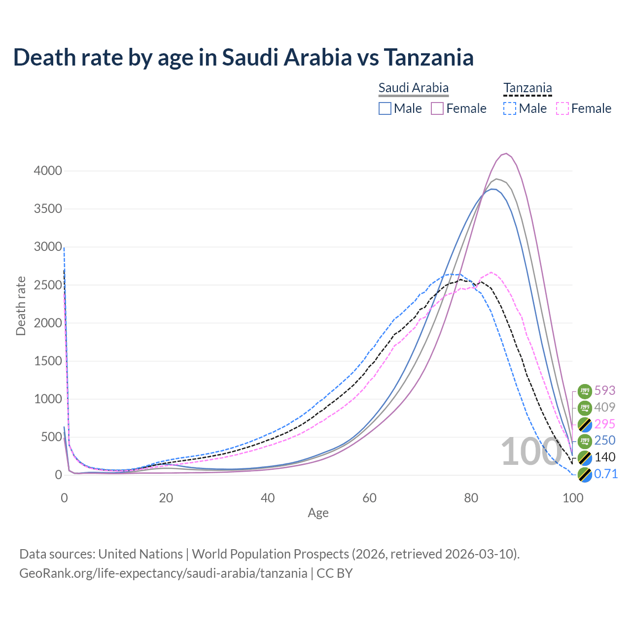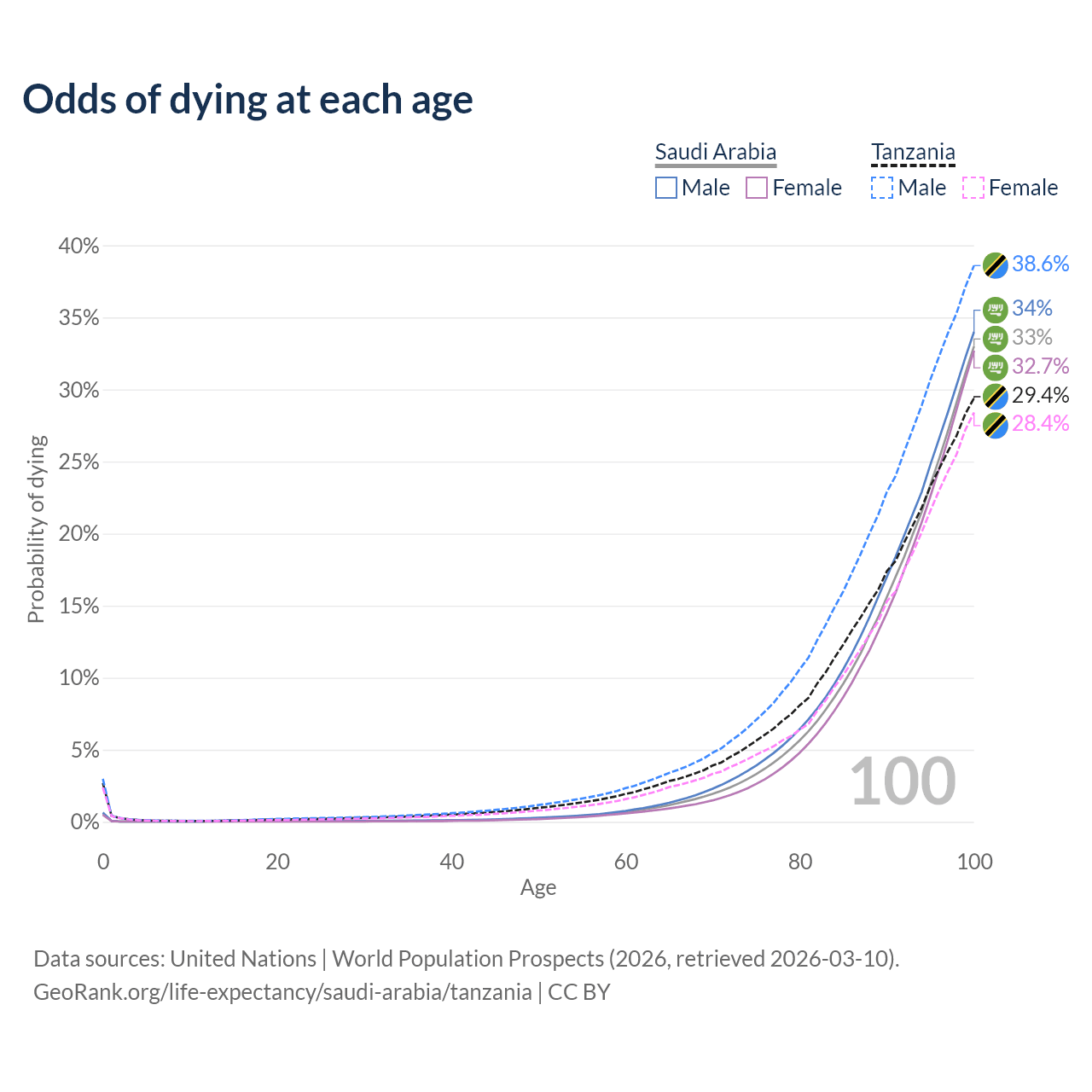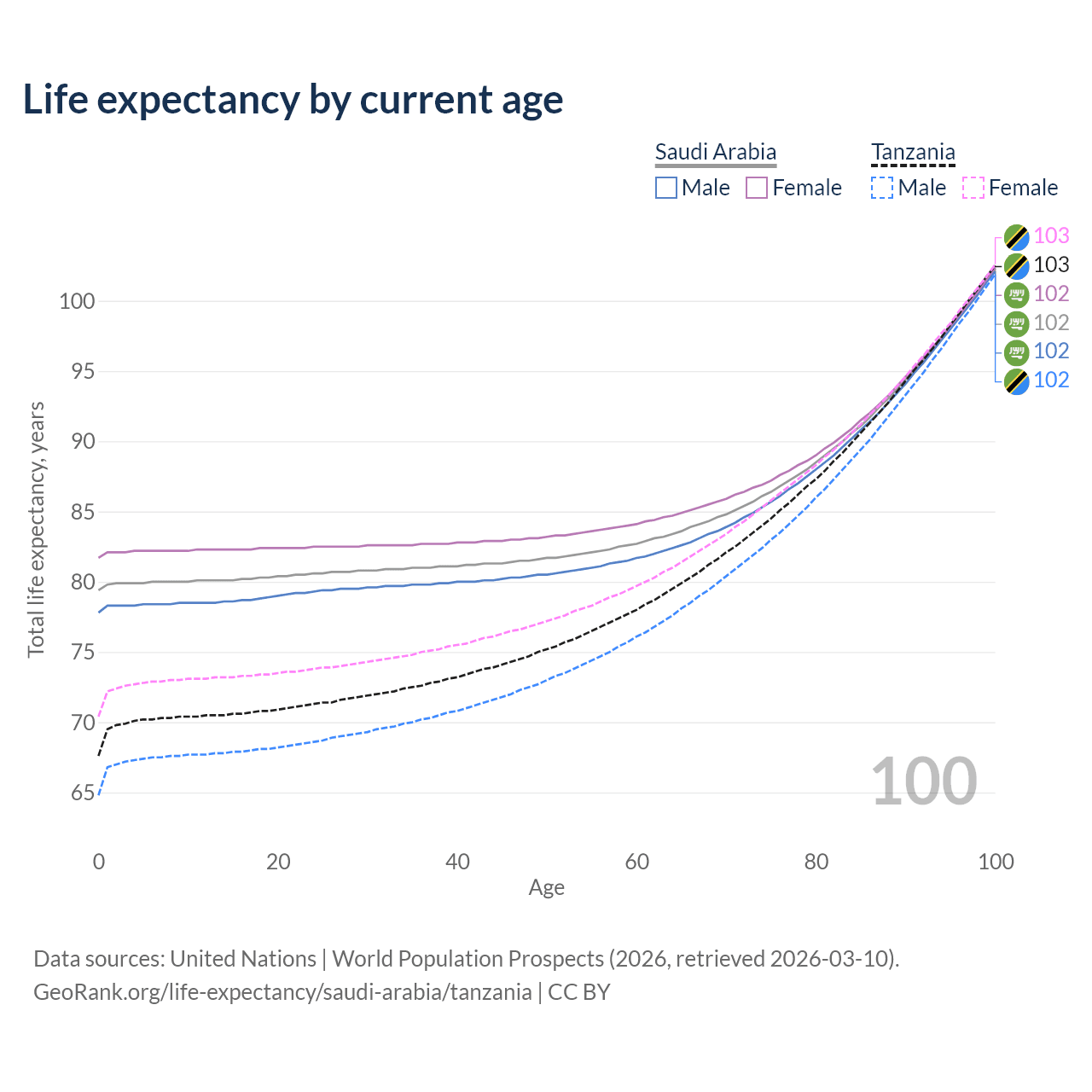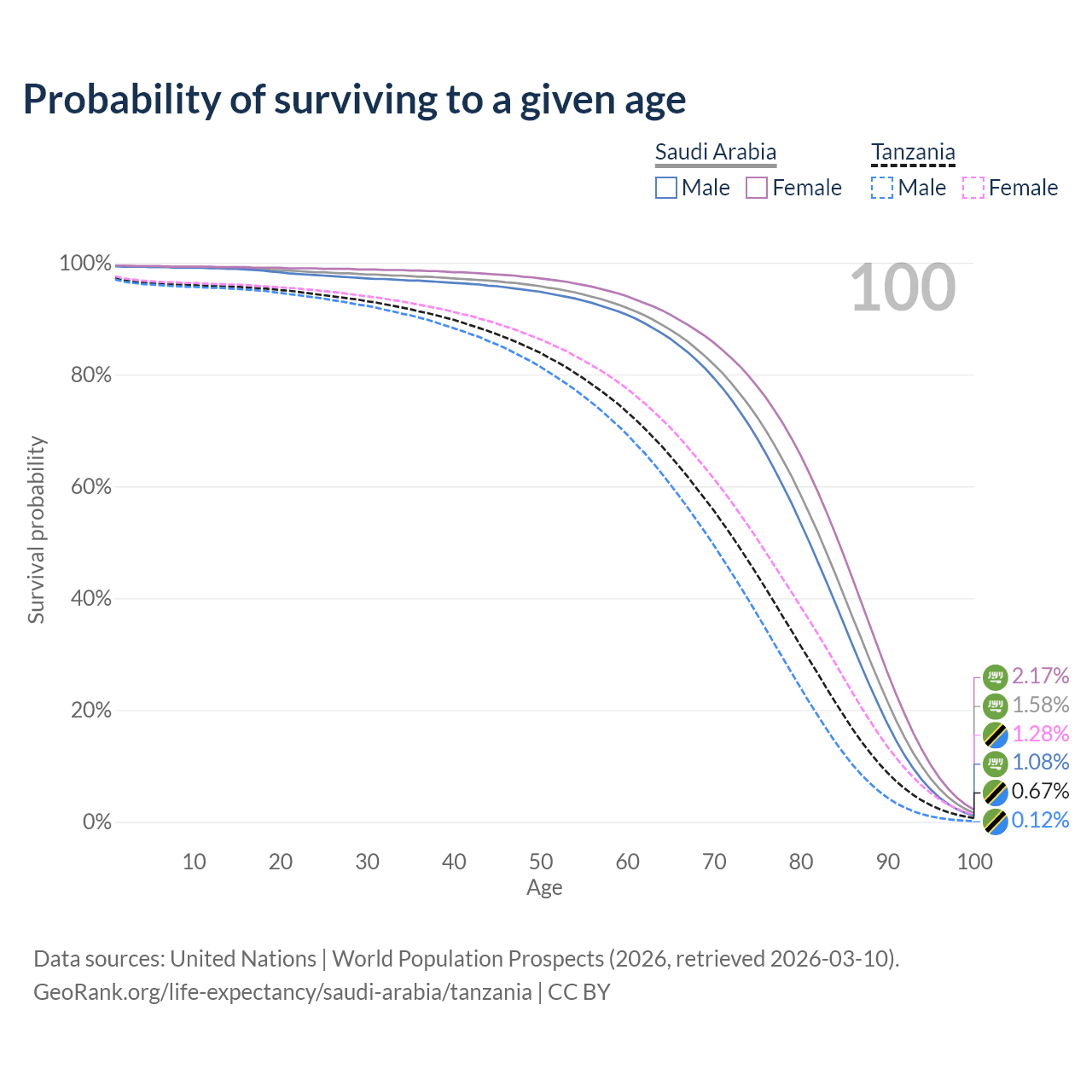 This life expectancy calculator shows the odds of living to 100, 95, 90, and below based on current age for both males and females in Saudi Arabia and Tanzania, along with mean and median age of death. The calculations are based on the 2026 life tables (actuarial tables) from the UN World Population Prospects.