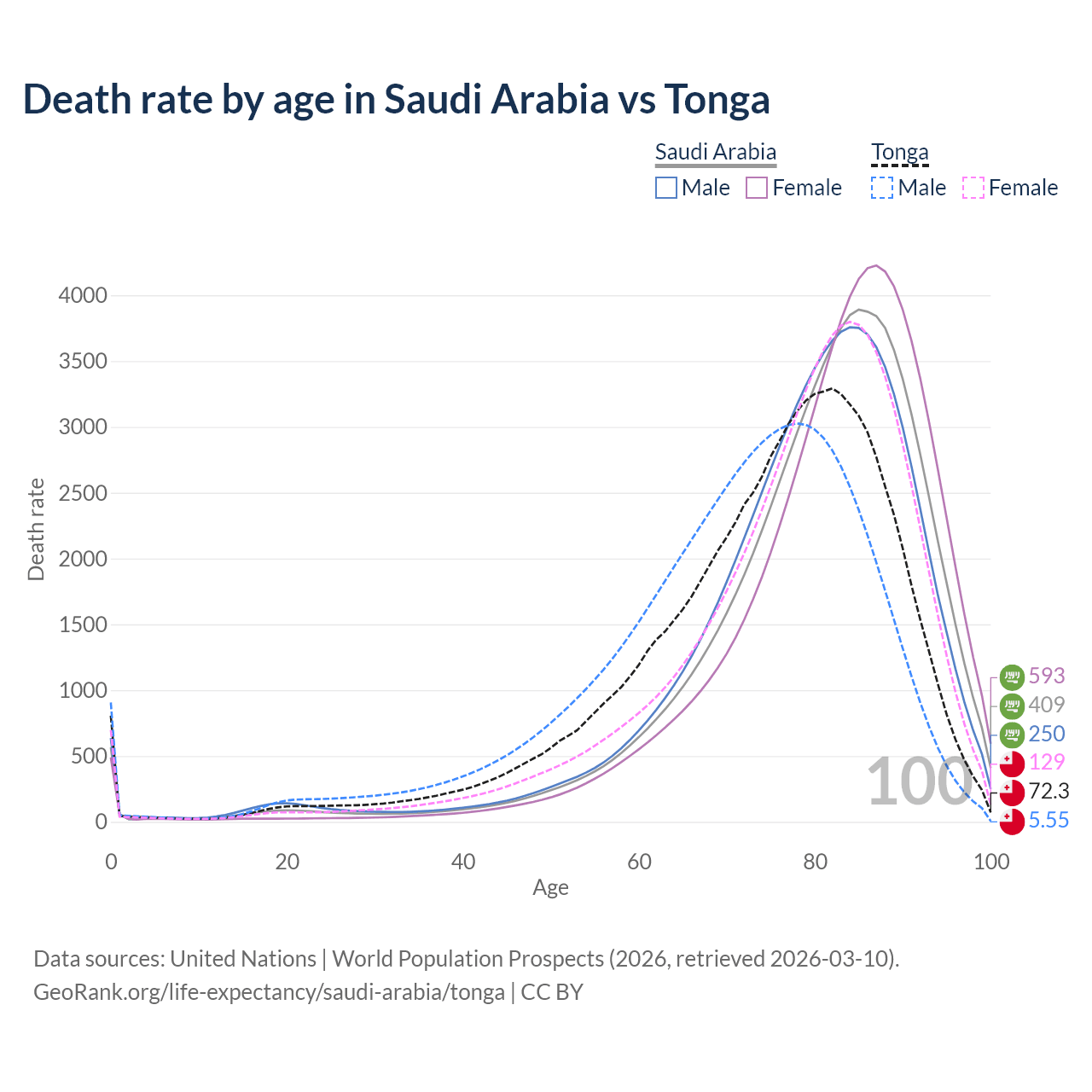 In Saudi Arabia, the most common age of death is 85, compared to 82 in Tonga. The median age of death is 82.5 in Saudi Arabia and 77 in Tonga, meaning only half of each cohort is expected to live past that age.