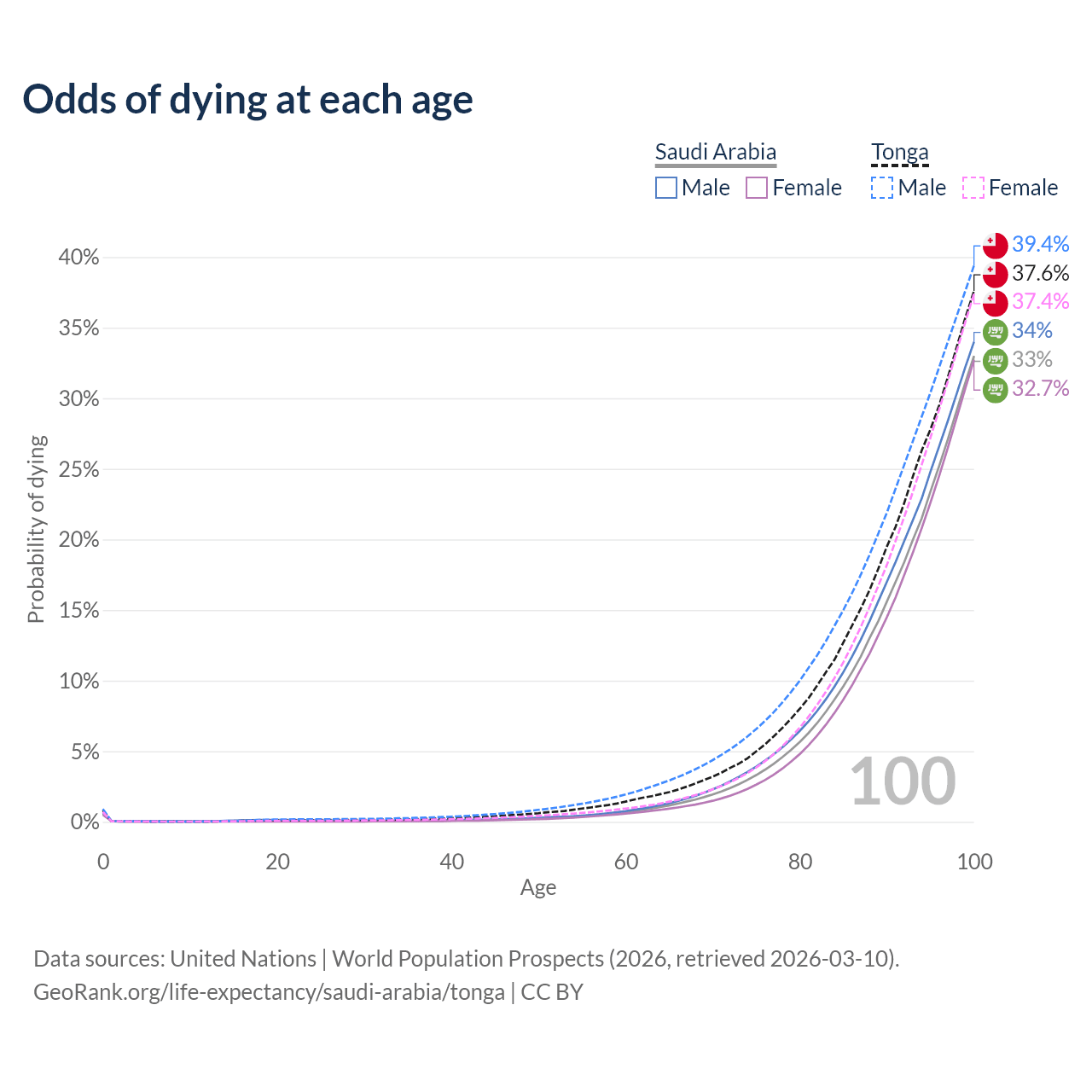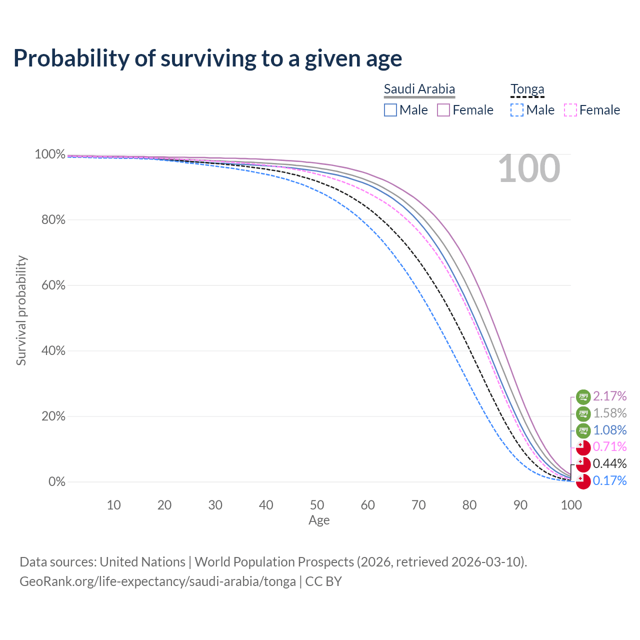 This life expectancy calculator shows the odds of living to 100, 95, 90, and below based on current age for both males and females in Saudi Arabia and Tonga, along with mean and median age of death. The calculations are based on the 2026 life tables (actuarial tables) from the UN World Population Prospects.