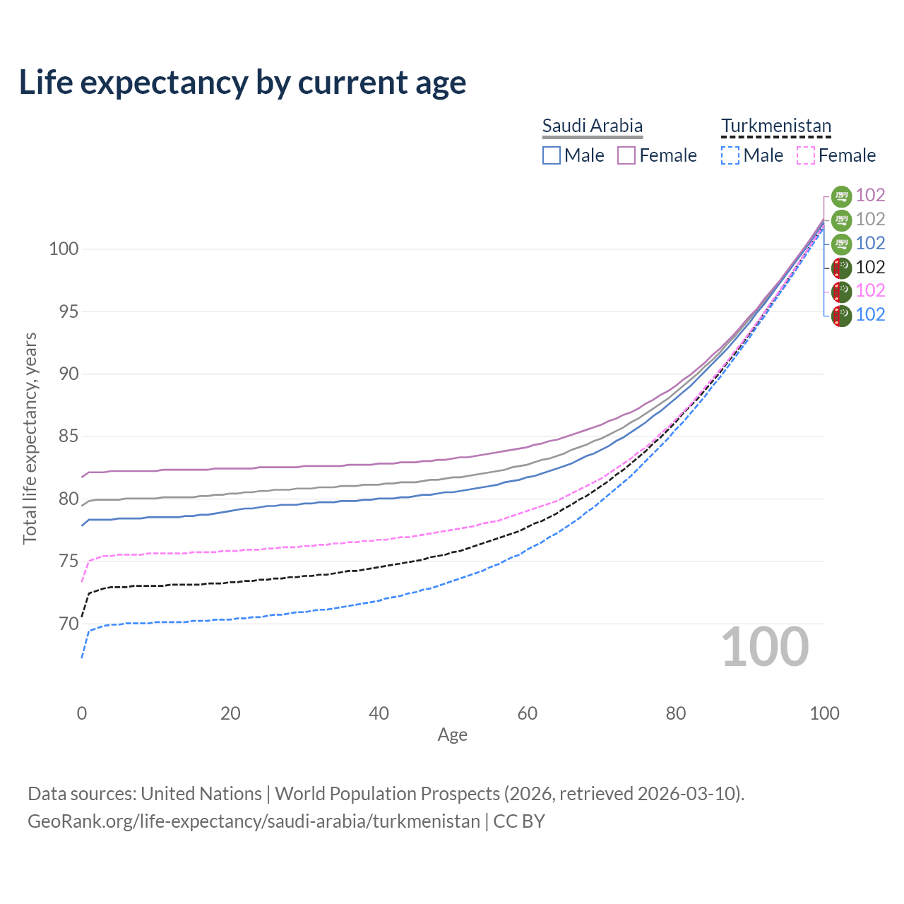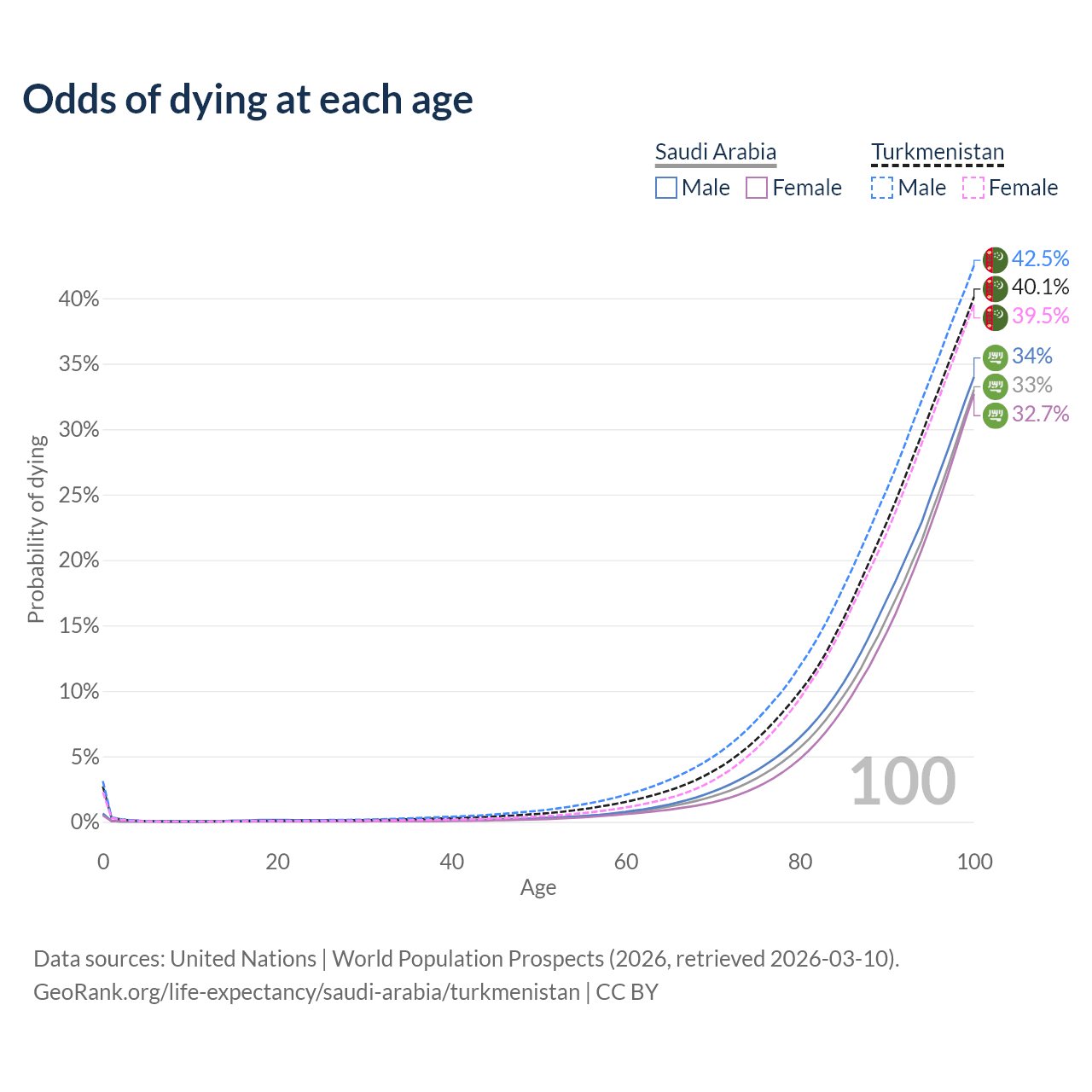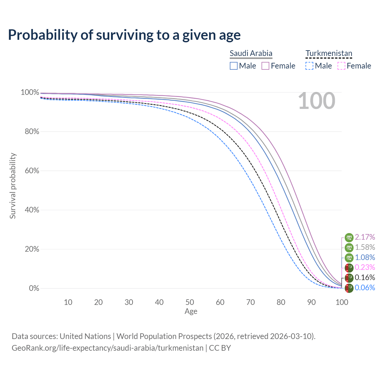 This life expectancy calculator shows the odds of living to 100, 95, 90, and below based on current age for both males and females in Saudi Arabia and Turkmenistan, along with mean and median age of death. The calculations are based on the 2026 life tables (actuarial tables) from the UN World Population Prospects.