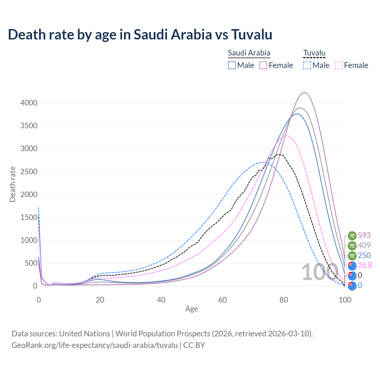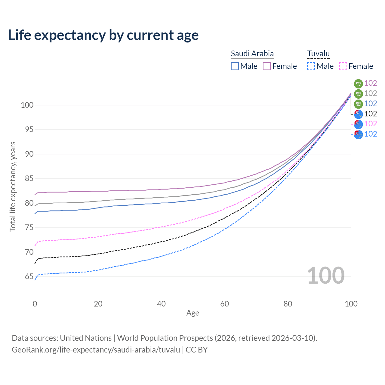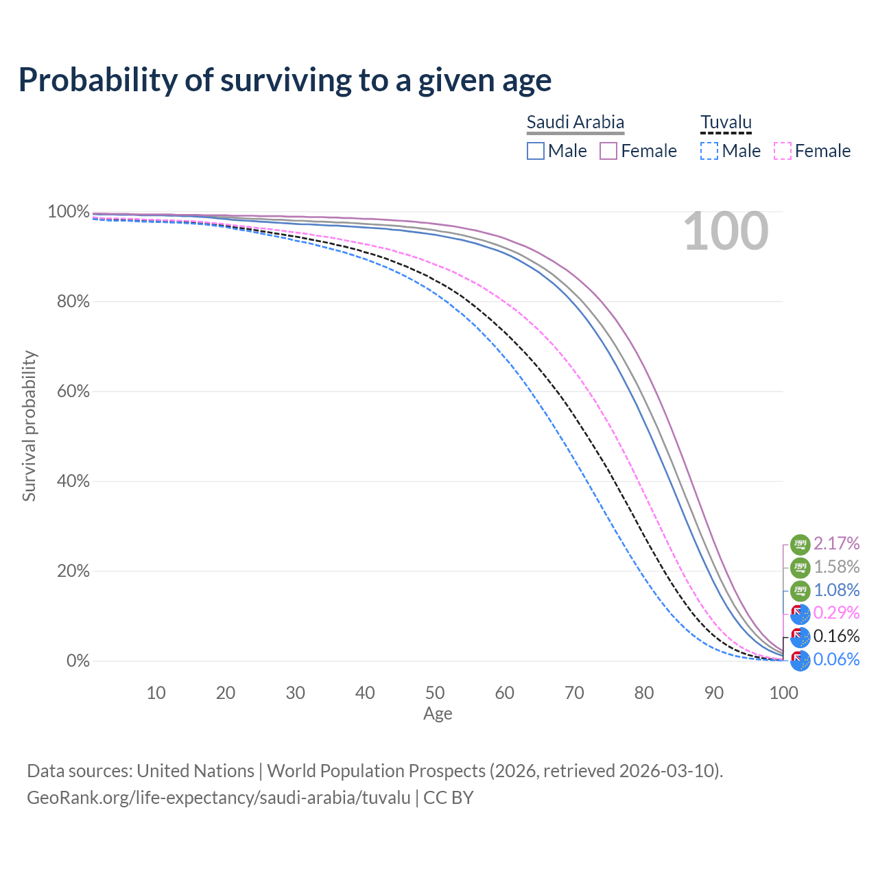 This life expectancy calculator shows the odds of living to 100, 95, 90, and below based on current age for both males and females in Saudi Arabia and Tuvalu, along with mean and median age of death. The calculations are based on the 2026 life tables (actuarial tables) from the UN World Population Prospects.