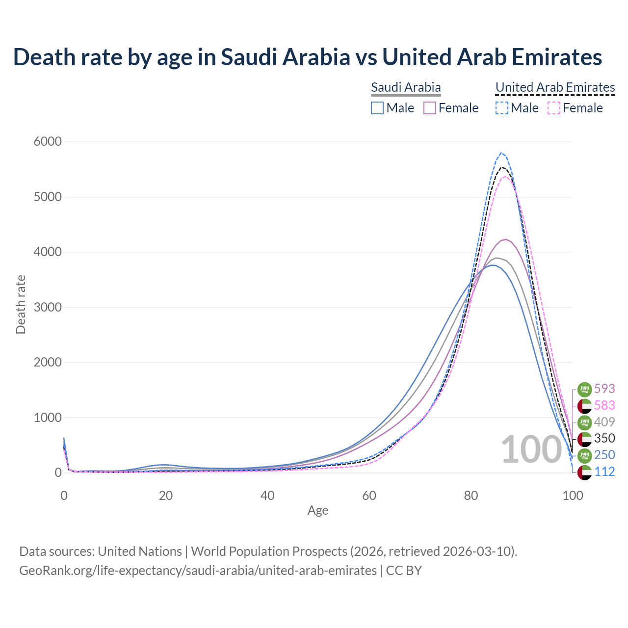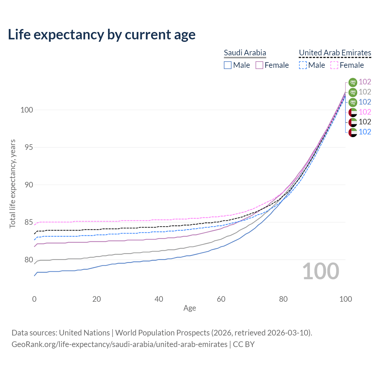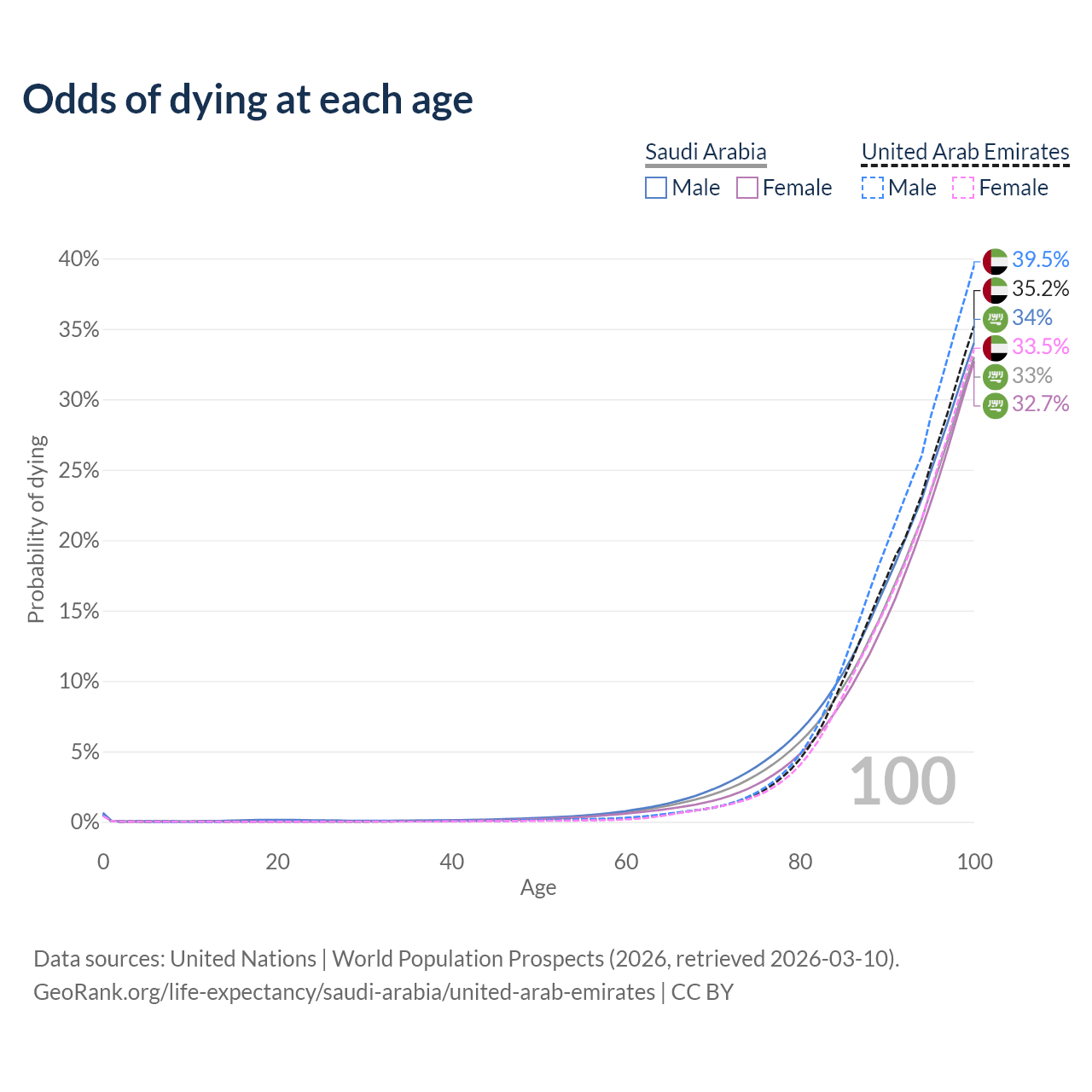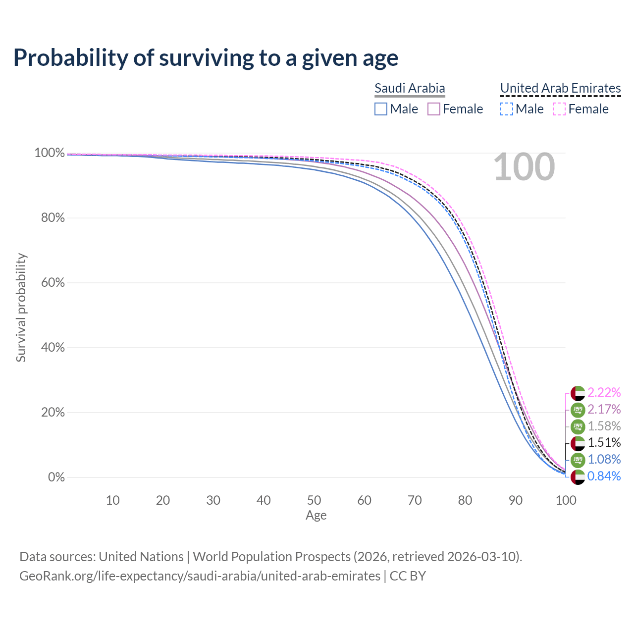 This life expectancy calculator shows the odds of living to 100, 95, 90, and below based on current age for both males and females in Saudi Arabia and the United Arab Emirates, along with mean and median age of death. The calculations are based on the 2026 life tables (actuarial tables) from the UN World Population Prospects.
