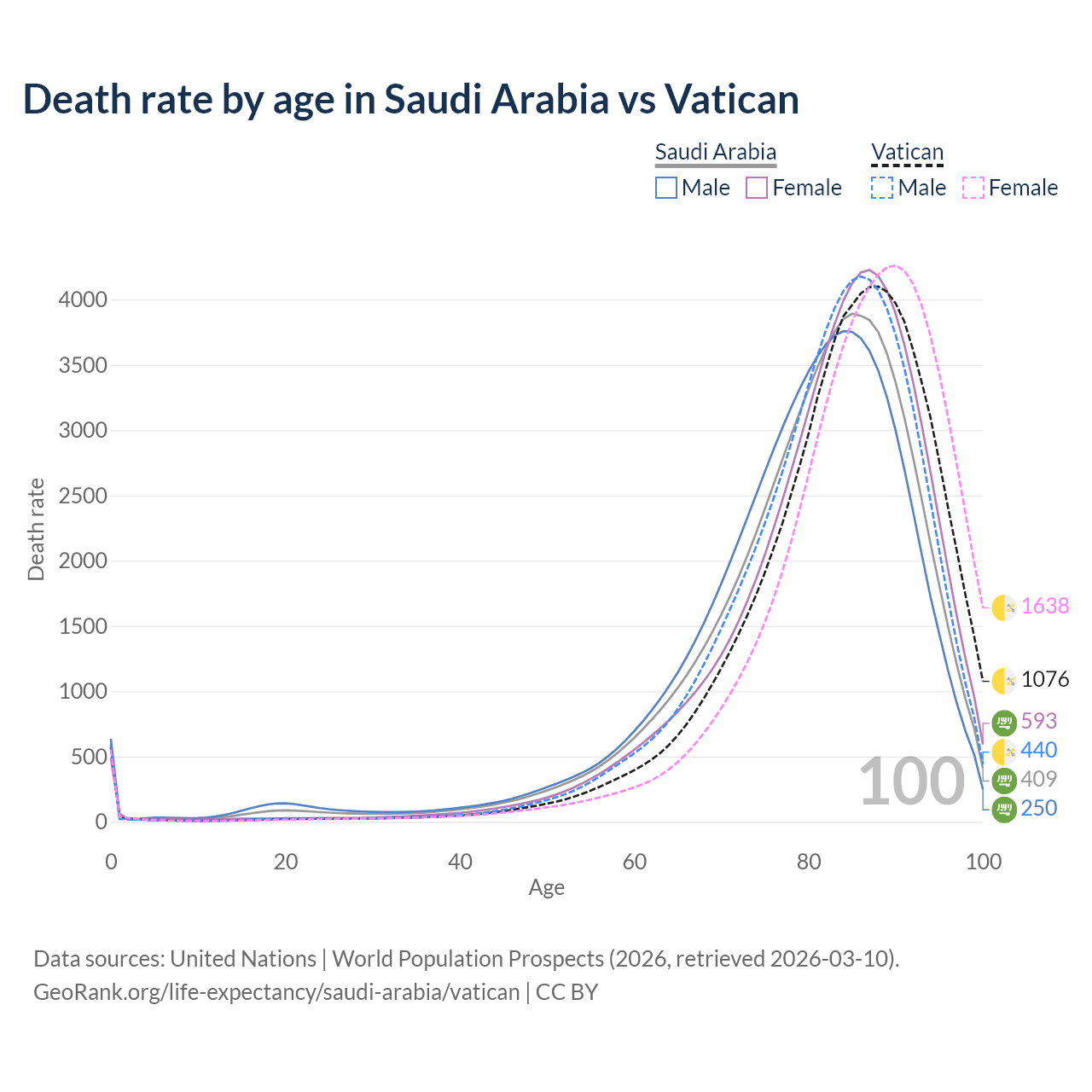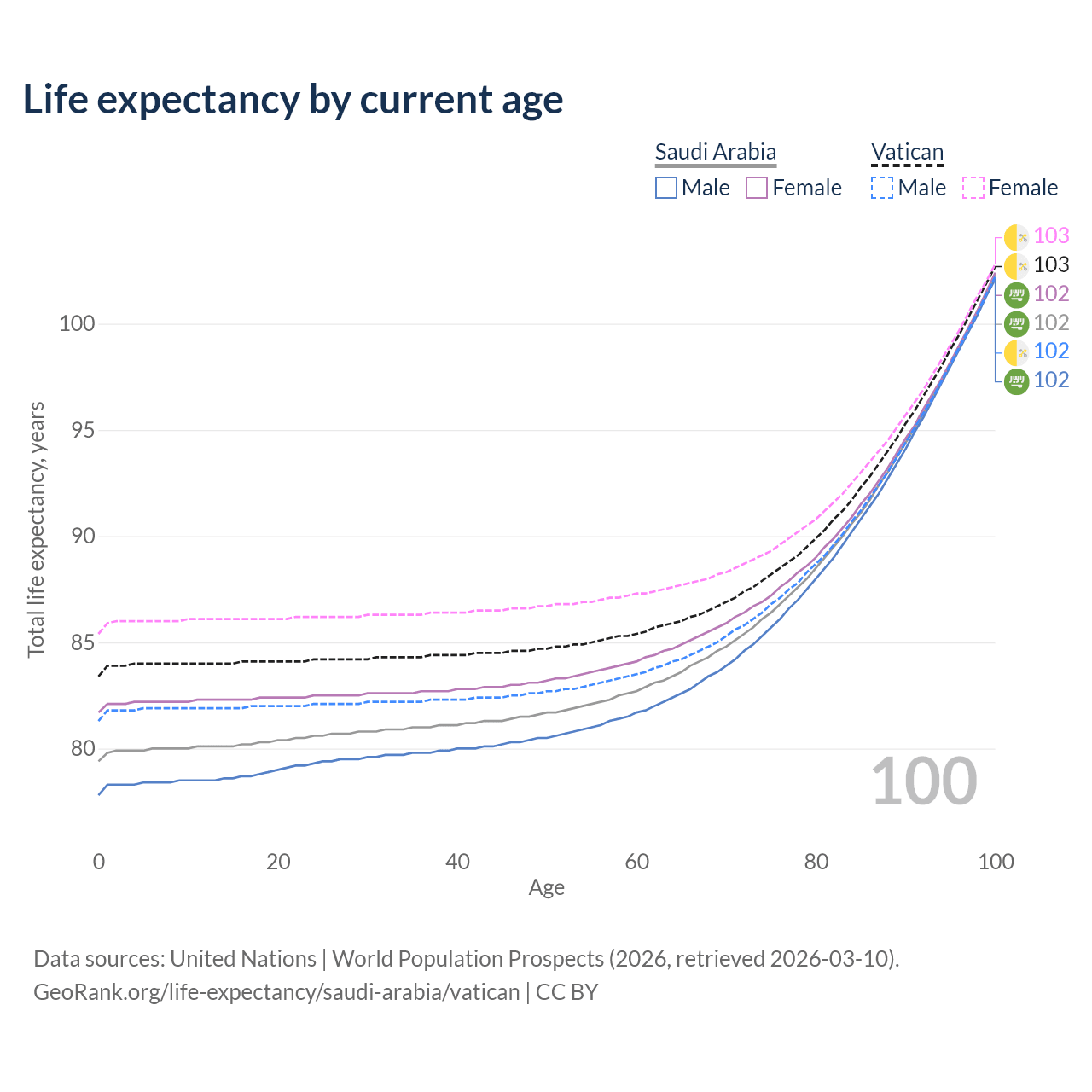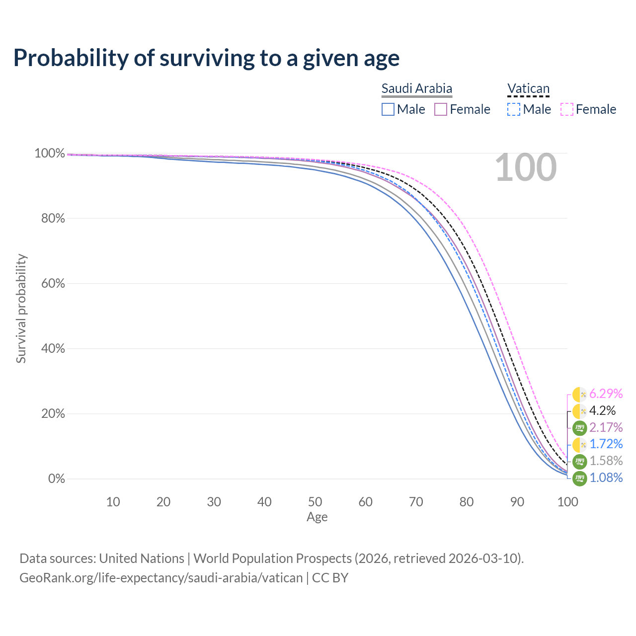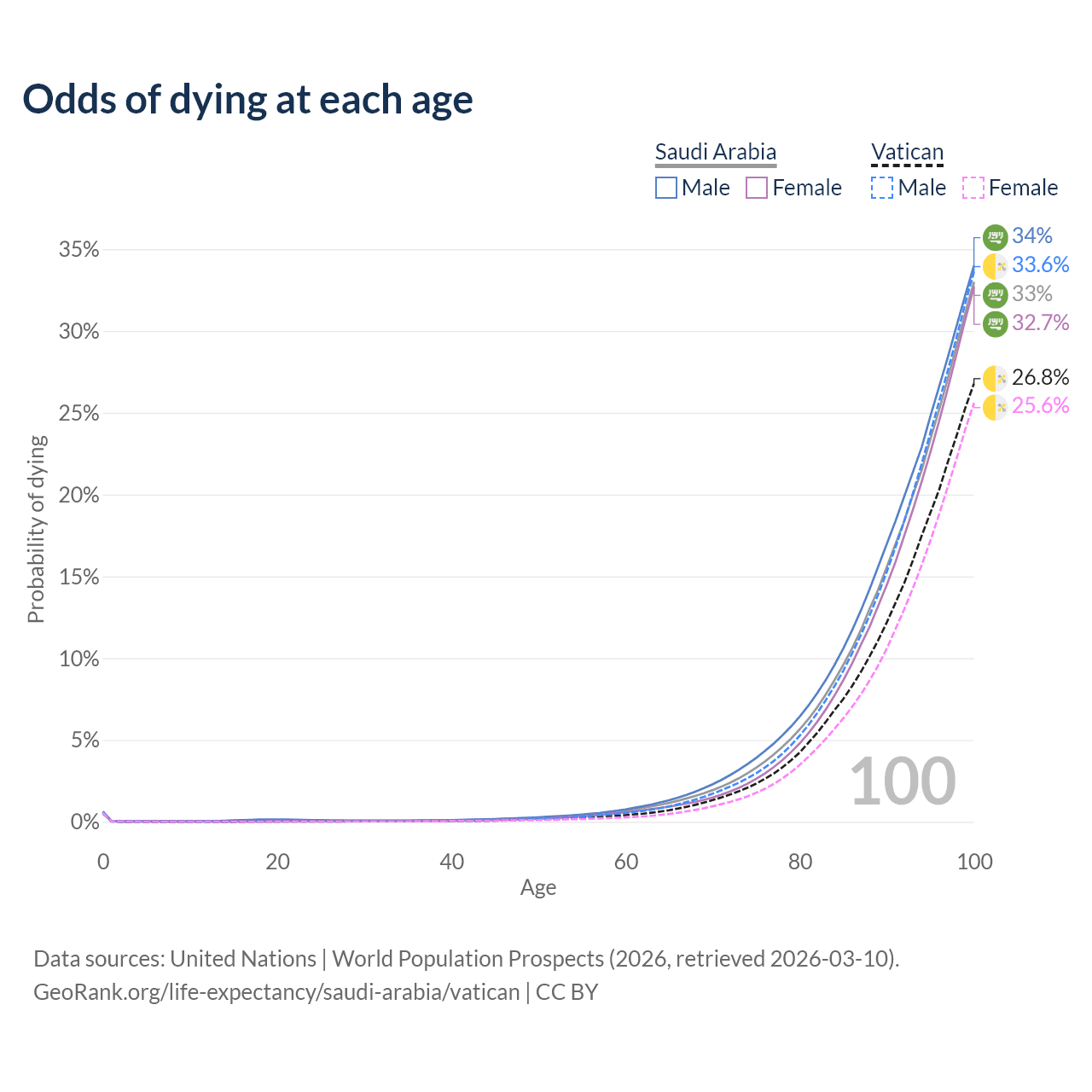 This life expectancy calculator shows the odds of living to 100, 95, 90, and below based on current age for both males and females in Saudi Arabia and the Vatican, along with mean and median age of death. The calculations are based on the 2026 life tables (actuarial tables) from the UN World Population Prospects.