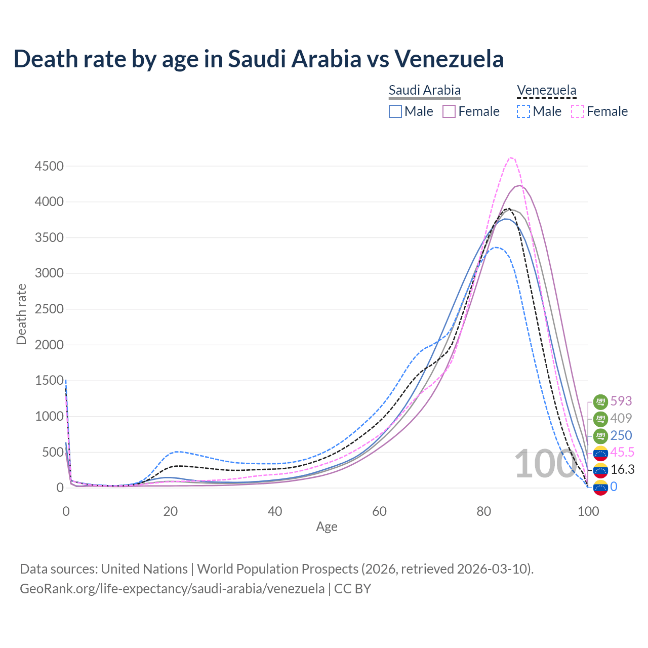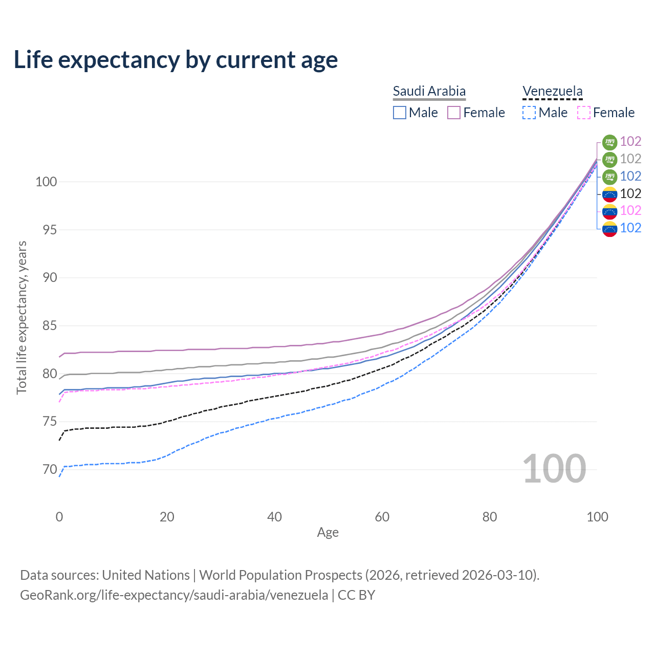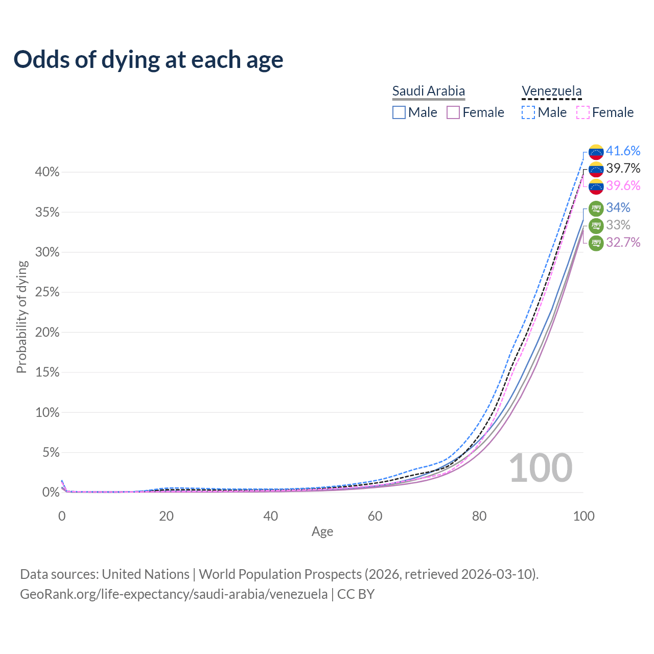 This life expectancy calculator shows the odds of living to 100, 95, 90, and below based on current age for both males and females in Saudi Arabia and Venezuela, along with mean and median age of death. The calculations are based on the 2026 life tables (actuarial tables) from the UN World Population Prospects.